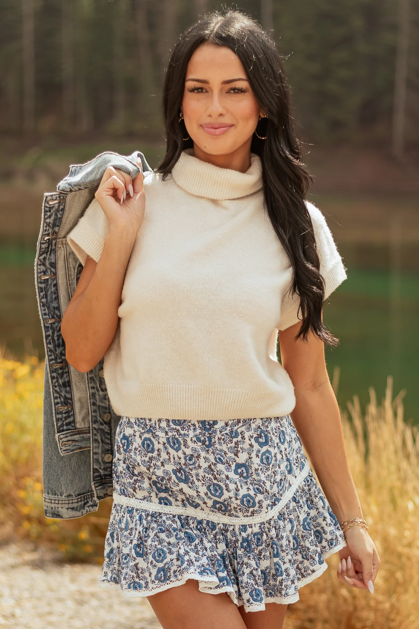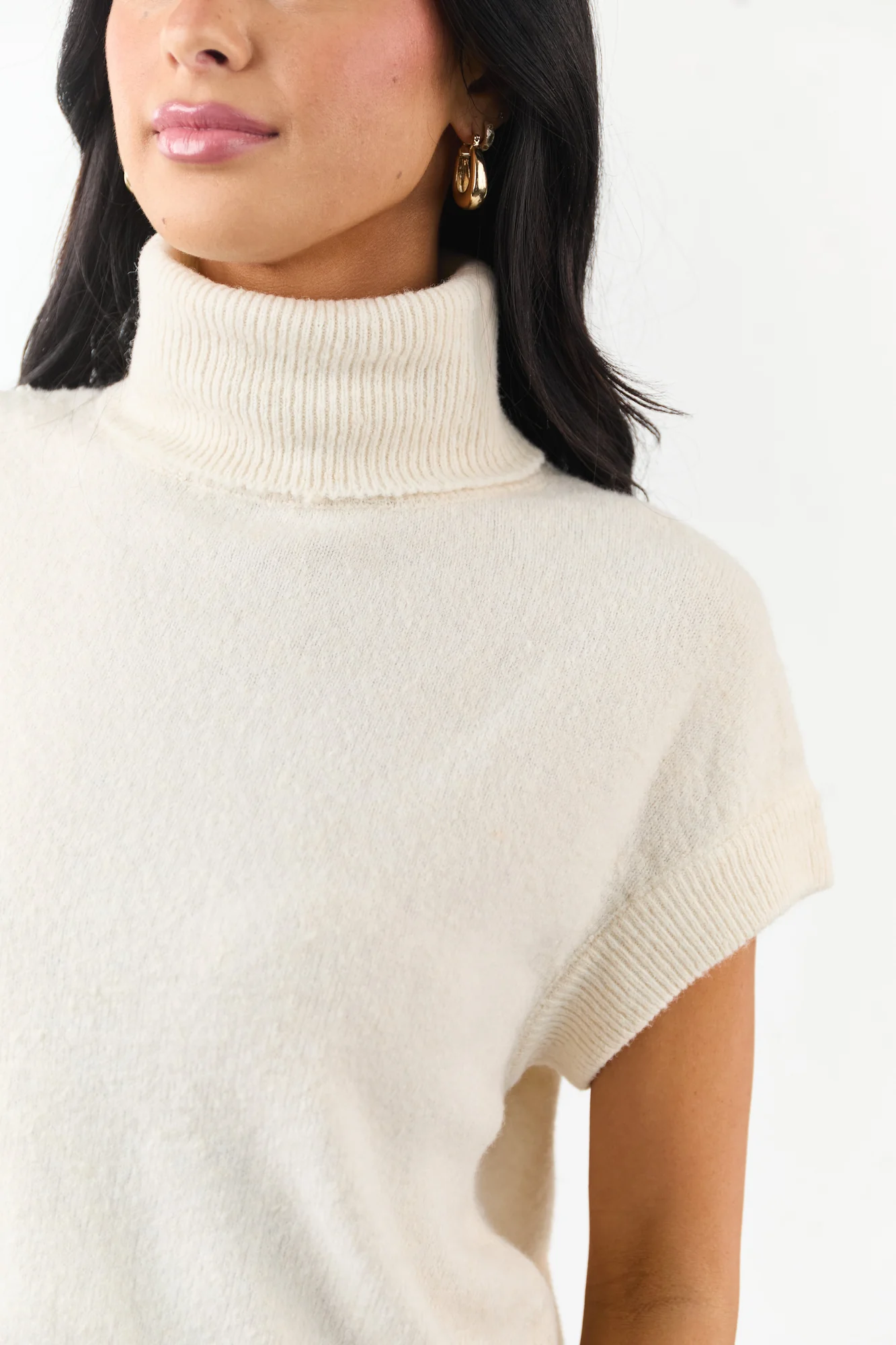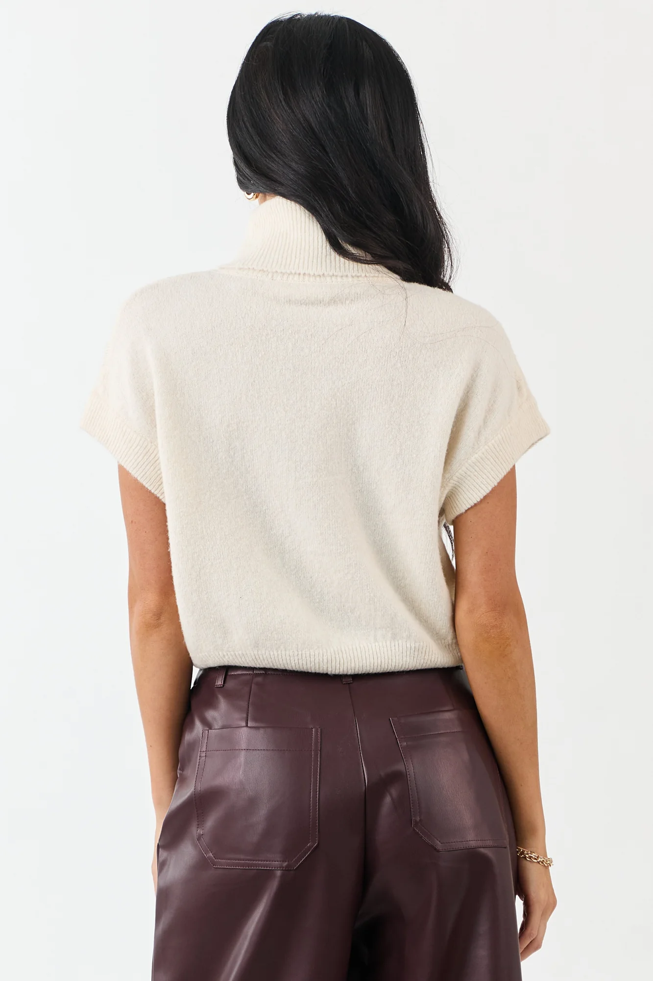 Indulge in soft sophistication with this cream turtleneck top featuring cap sleeves in a cozy wool blend. The boxy fit provides easy comfort, and the stretchy knit with ribbed trim adds a touch of elegance. Perfect for cool weather, this top pairs effortlessly with the Cream Wool Blend Knit Elastic Waist Skirt. Carefully crafted from 45% Acrylic, 45% Polyester, 7% Wool, and 3% Spandex, this imported top offers both style and comfort. Model is wearing a size Small with measurements: Bust 34″, Waist 26″, Height 59″.