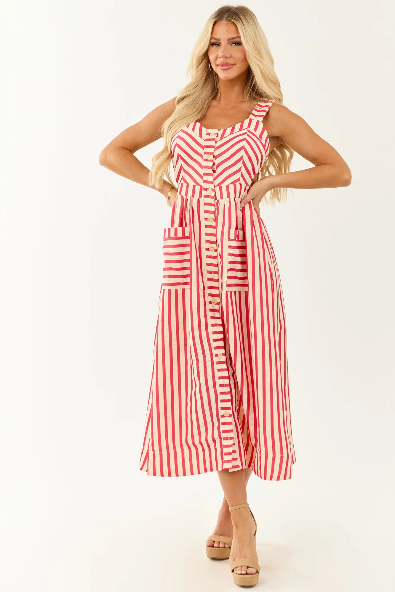 Elevate your style with our Crimson and Cream Striped Cut Out Midi Dress. Featuring bold stripes, flirty cut-outs, and a versatile short length lining, this dress adds a dash of spice to your wardrobe. Crafted from 100% Polyester with side pockets and a back elastic waistband for comfort. Available in sizes XS to XL. Model is wearing size Small – Bust: 34″, Waist: 26″, Height: 57″.