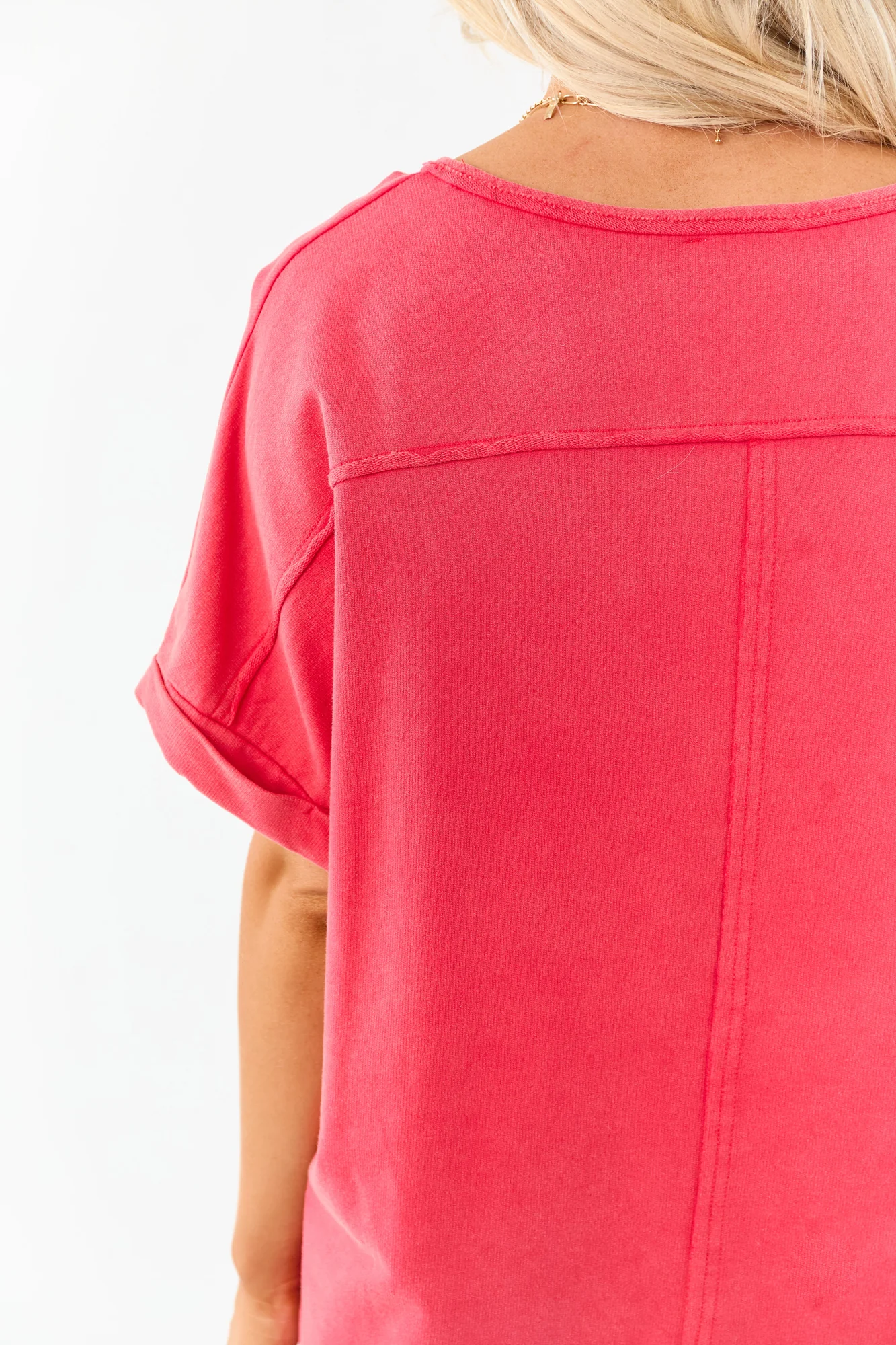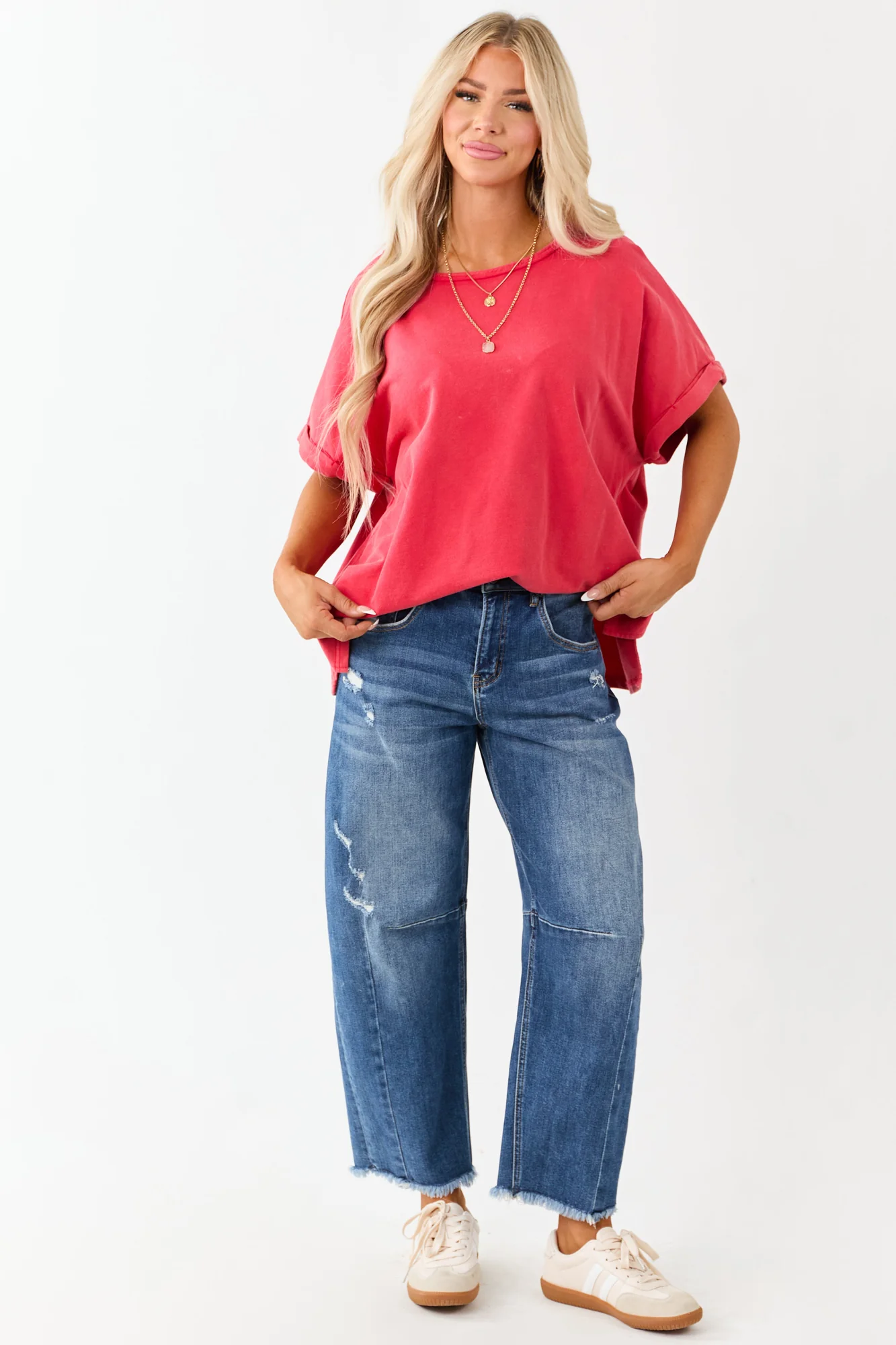 This comfortable staple in crimson color features an oversized fit, mineral wash design, and breathable cotton material. Ideal for casual wear, it includes semi-stretchy knit, rolled cuffs, side slits, and is imported. Available in sizes S, M, and L. Make it yours today!