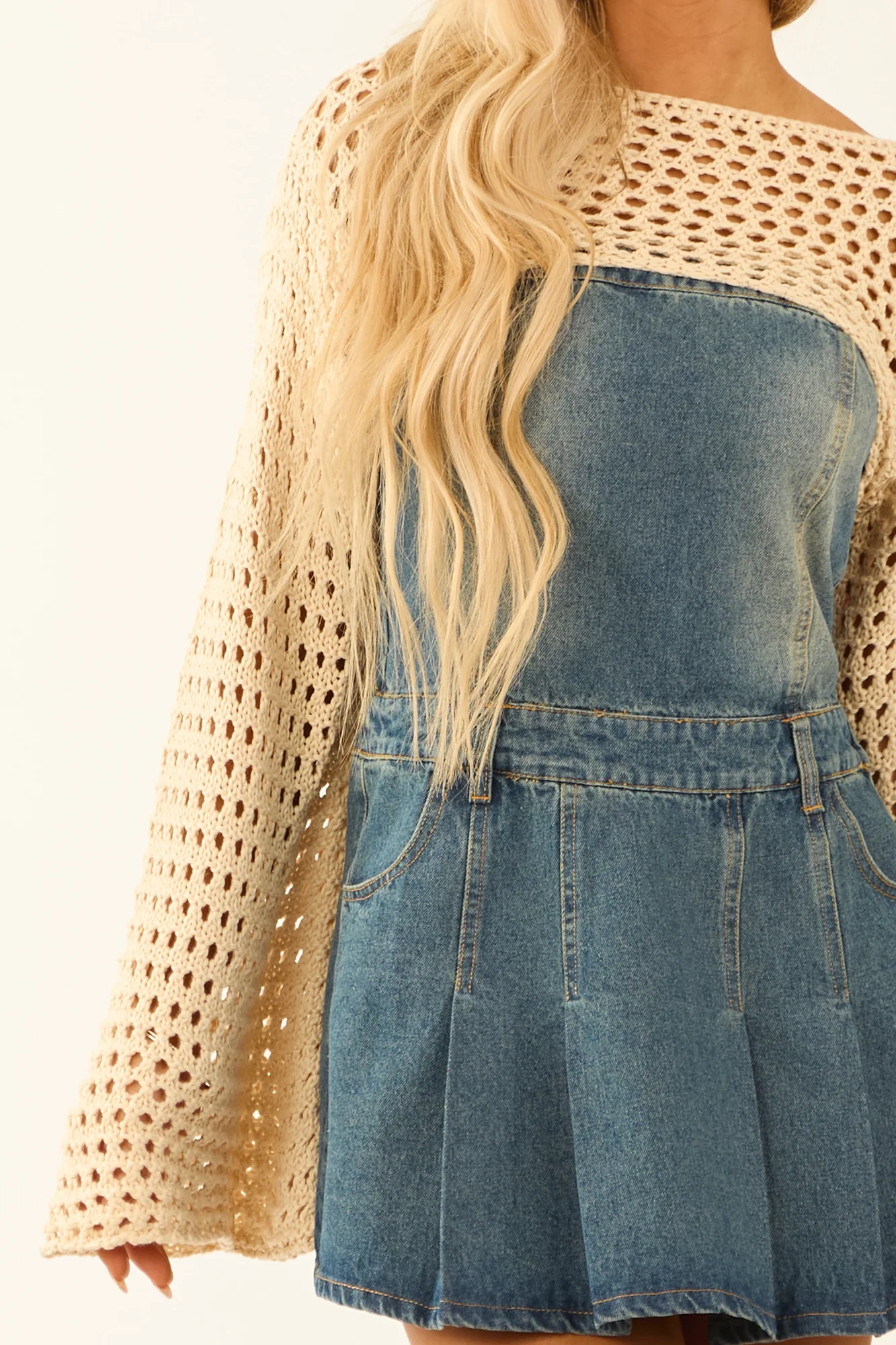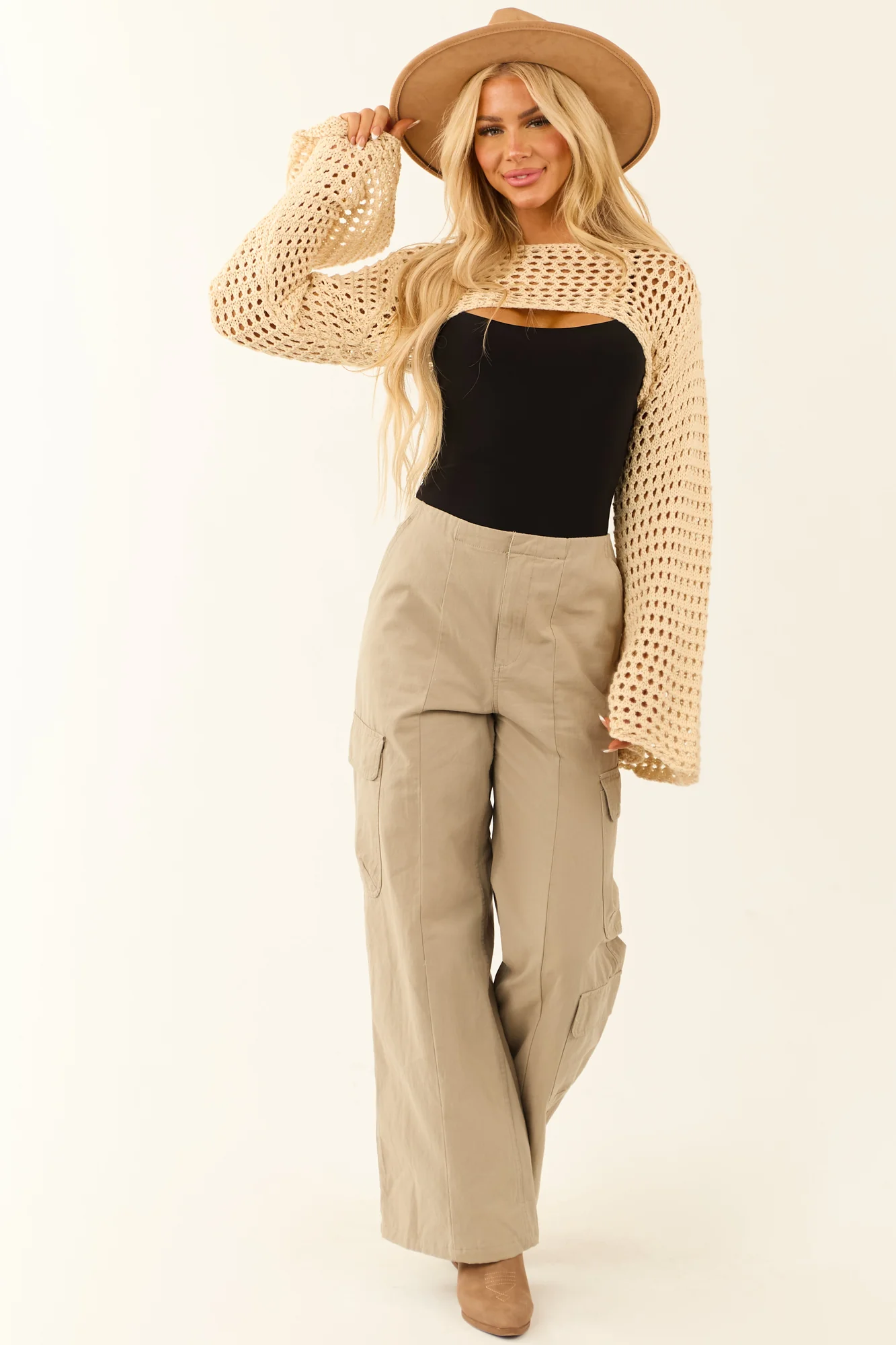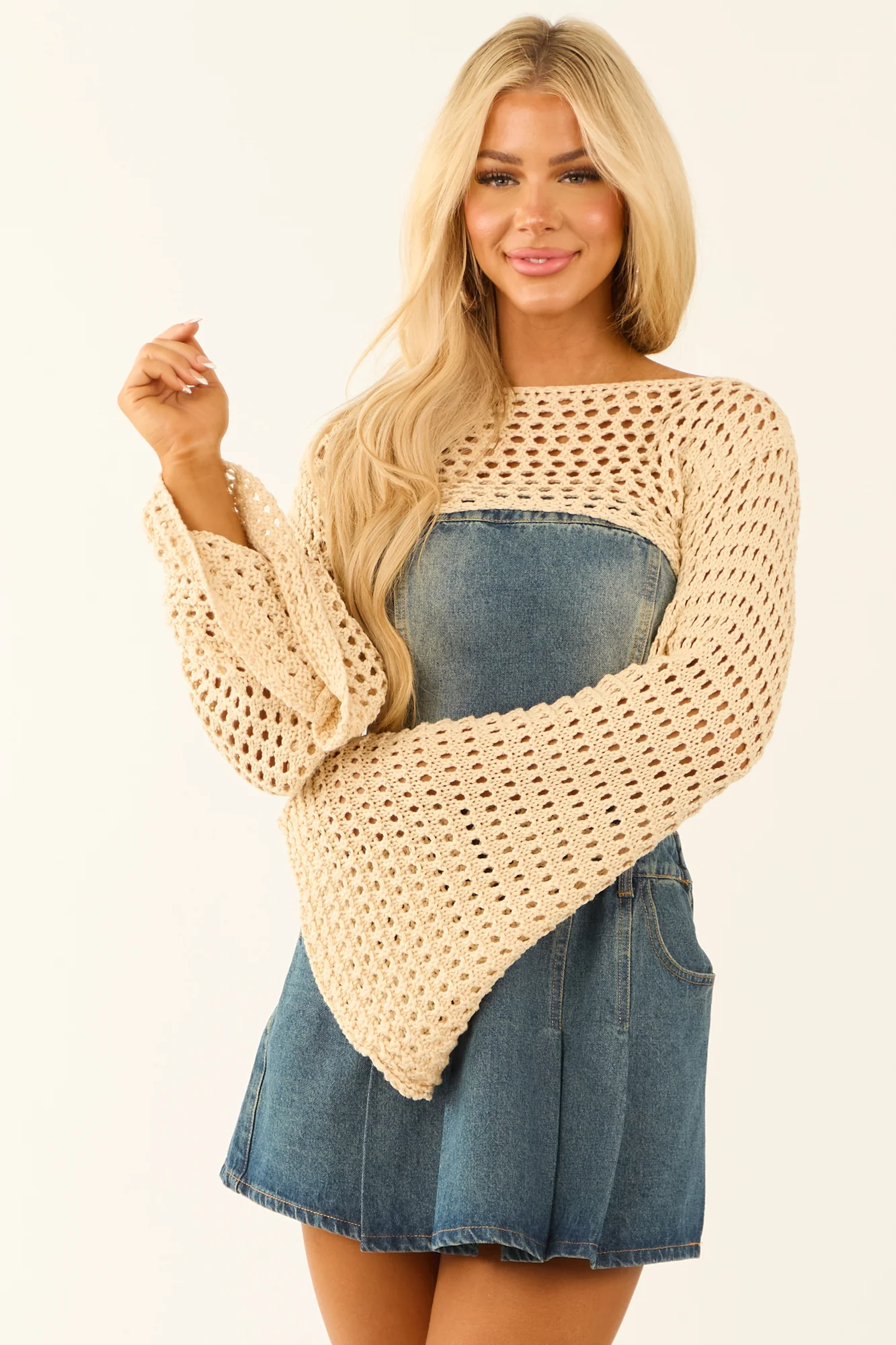 Stay cozy and stylish with our ultra-cropped knit shrug sweater in a delightful light buttercream color. This sweater features long flare sleeves and a boat neckline for a chic look. Made of 55% Acrylic and 45% Cotton, it offers stretch and comfort. Perfect for spring, this sweater is a wardrobe essential that pairs beautifully with any bottom. Hand wash cold and line dry for easy care. Available in sizes S, M, and L.
