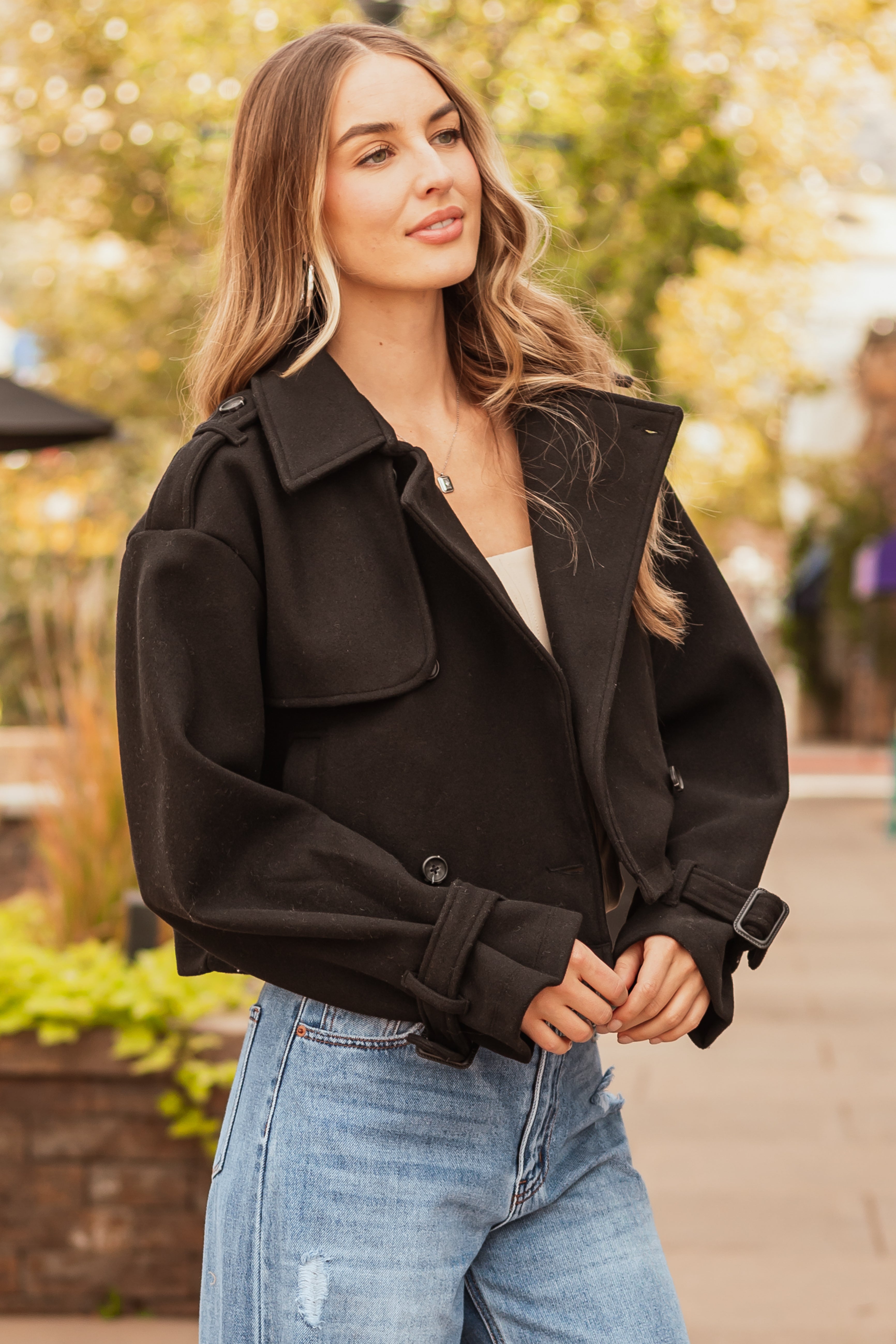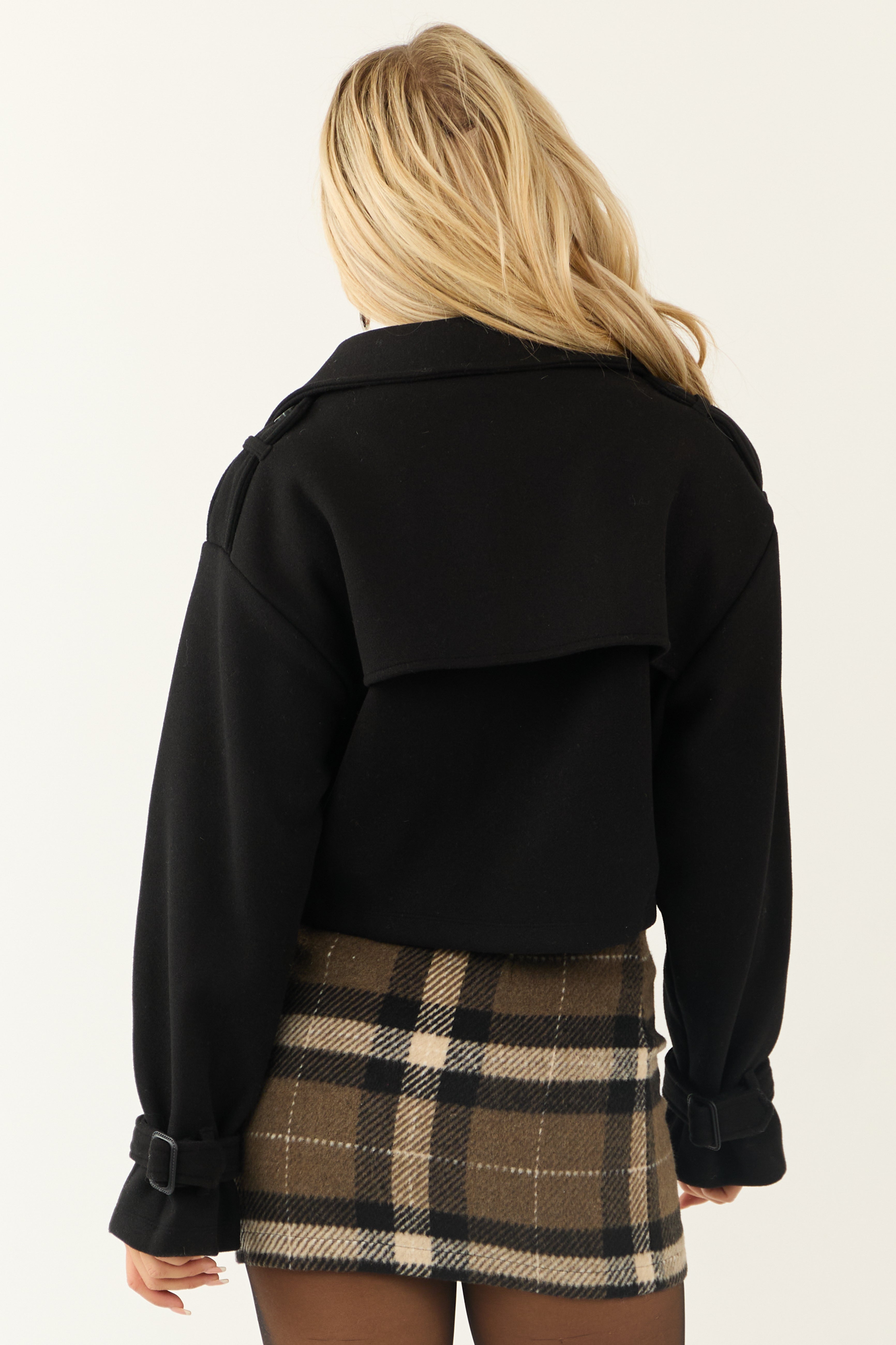 Elevate your style with our chic Cropped Black Jacket featuring a double-breasted front closure. Crafted from 100% polyester, this non-stretchy woven jacket offers long wide sleeves, buttoned shoulder straps, and adjustable cuffs for a tailored fit. Stay fashionable and warm in this unlined outerwear piece. This jacket is hand washable and easy to maintain. Model is wearing a size Small.