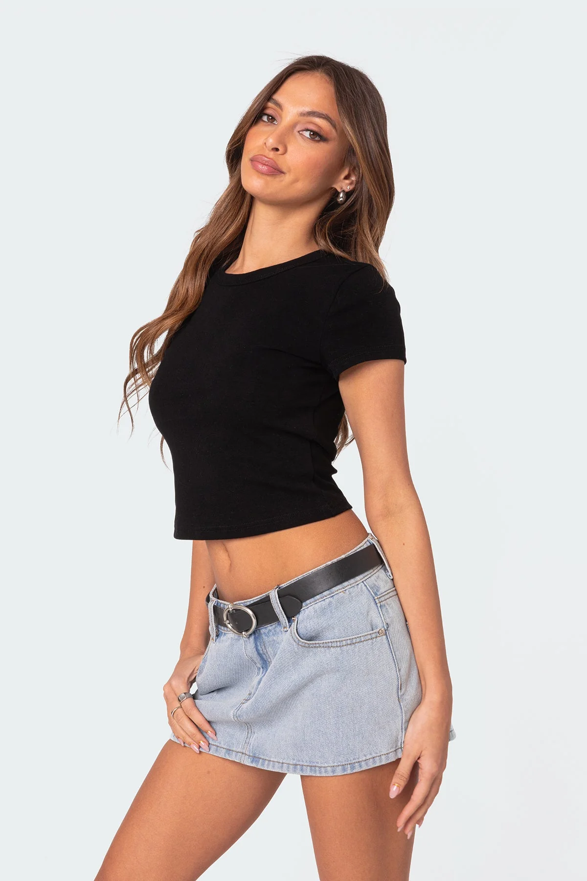 Experience ultimate comfort and style with our Cropped Cotton Spandex T-Shirt in Black. This T-shirt features a cropped fit that keeps you on-trend effortlessly. Made of high-quality cotton and spandex blend, it offers a perfect balance of softness and stretch. The model is wearing size S with a height of 59 for reference. Care instructions: Machine wash with like colors.