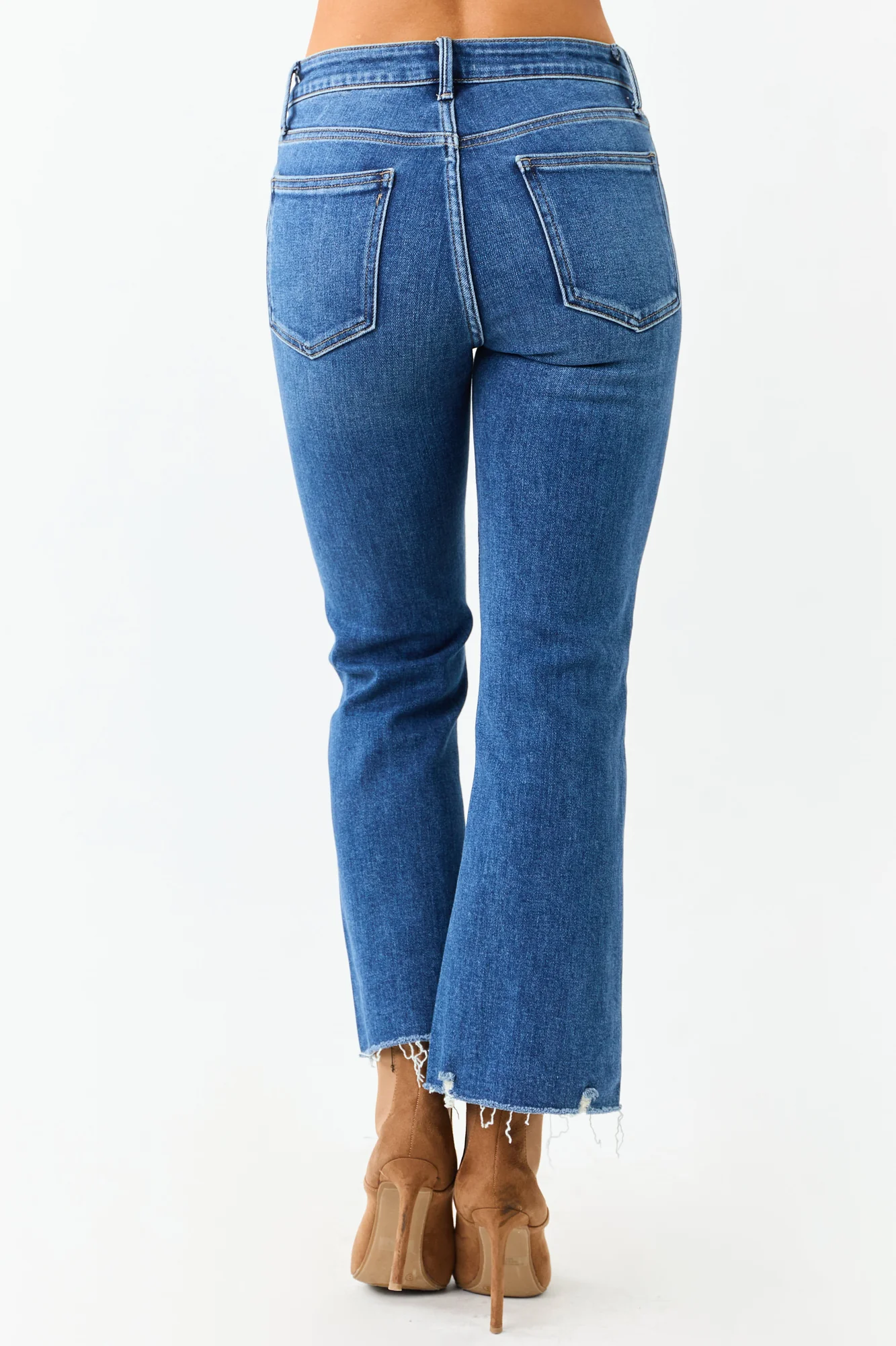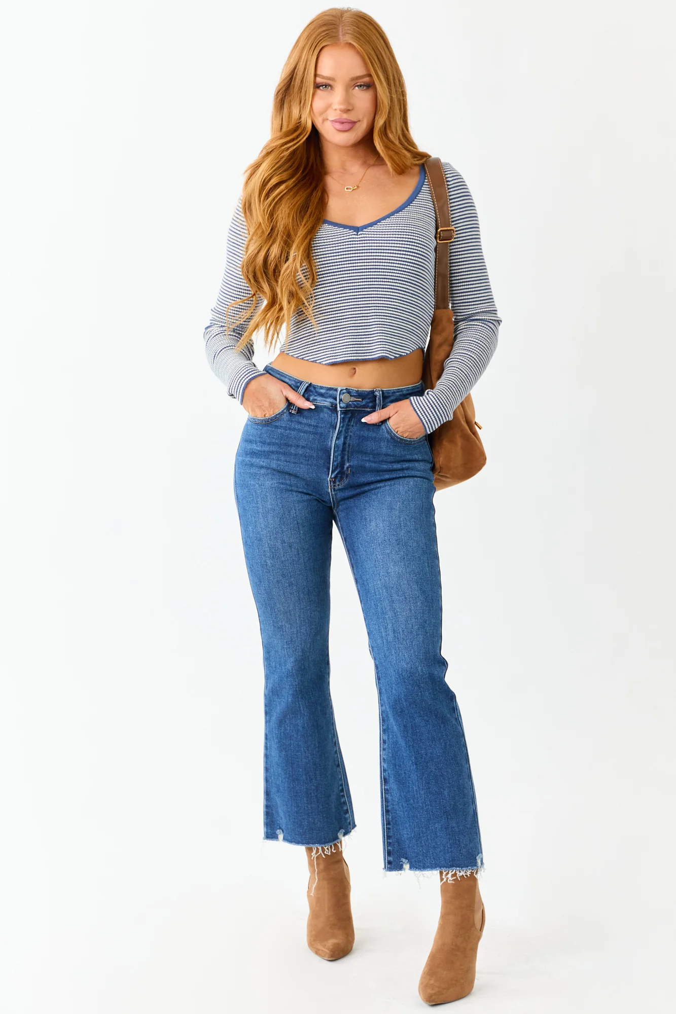Experience retro-modern fusion with these dark wash cropped flare jeans featuring a stretchy fit, frayed cut-off hem, and high rise design. Crafted from 93% Cotton, 5% Polyester, and 2% Spandex for utmost comfort and style. These jeans with 26″ inseam, light distressing, and 5 pockets are the perfect choice for a trendy look that pairs well with sneakers or ankle boots. Embrace true size or size up for a very fitted hip feel. Elevate your fashion game with these imported wardrobe essentials .