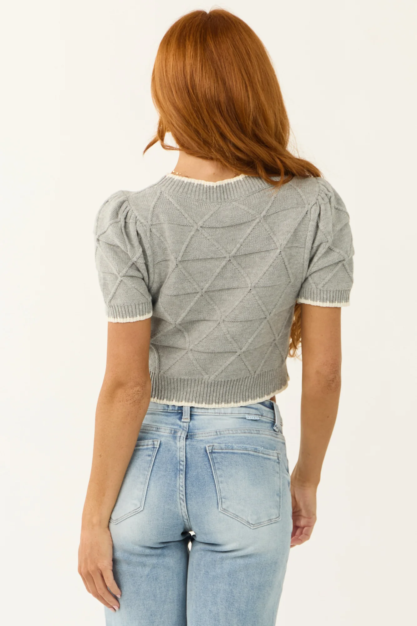 Experience style and comfort with our Cropped Grey Sweater with Ivory Trim. Made from a stretchy knit blend of 60% Cotton and 40% Acrylic, this sweater features a chic geometric pattern, round neckline, short sleeves, and pleated shoulders for a trendy look. The contrast ivory trim adds a touch of sophistication. Perfect for any occasion, whether its a casual day out or a special event. This versatile sweater is available in sizes S, M, and L. Care instructions: Hand wash cold, do not bleach, do not tumble dry, hang dry. Model is wearing a size Small. Model’s Profile: Size 1, Height 55, Bust 31, Waist 24