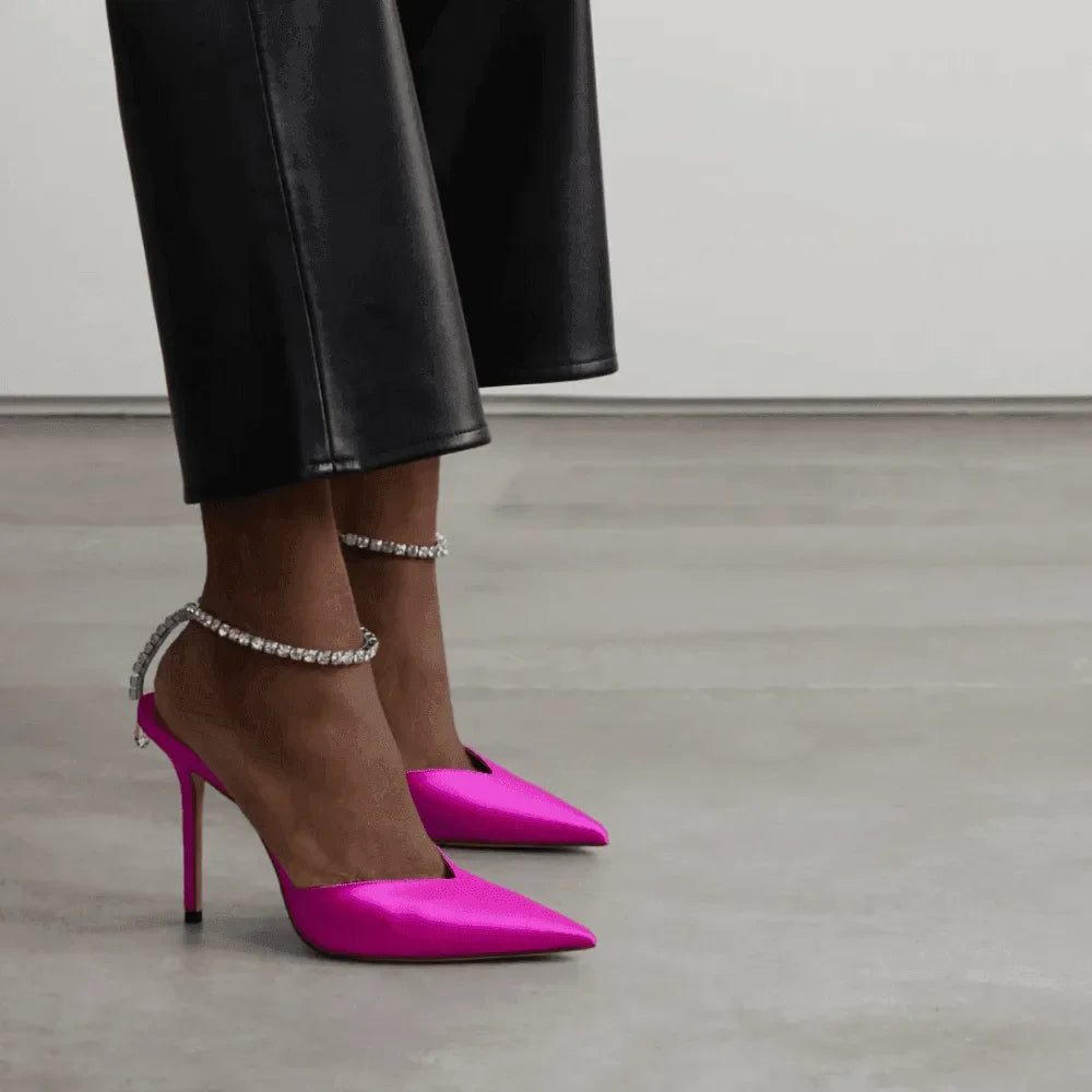 Elevate your style with our Crystal Chain Satin High Heels. These stunning high heels feature a dazzling crystal chain detail, exuding elegance and glamour. The luxurious satin finish adds a touch of sophistication to any ensemble, making them a versatile choice for both casual outings and formal events. Crafted for both comfort and style, these high heels boast a slender silhouette and a secure fit for all-day wear. Stand out on any occasion with our collection of chic high heels that guarantee a fashion statement wherever you go. Step into these stylish heels today and make every stride a statement of elegance and grace! Explore fashion inspiration on Instagram @mermaid_way for more style ideas.