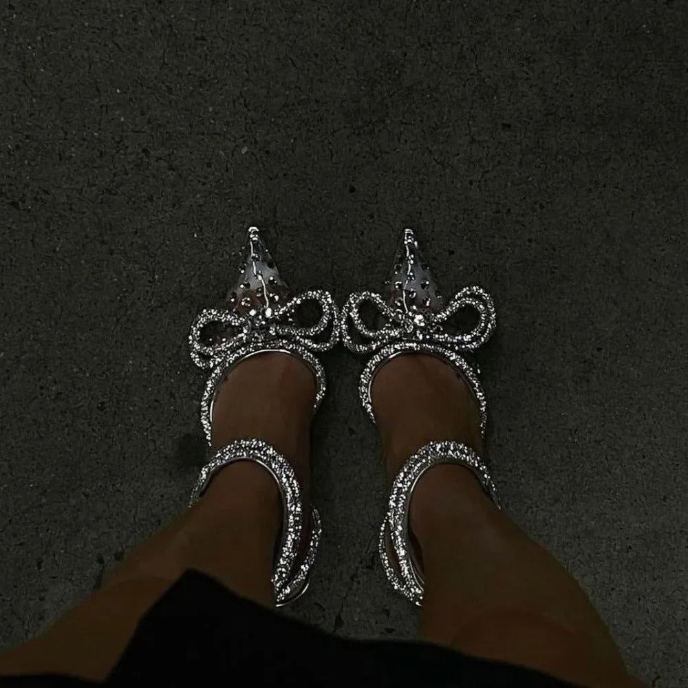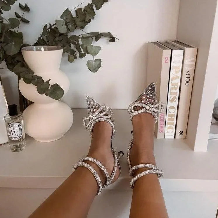 Elevate your style with these Crystal Embellished Heels featuring intricate crystal embellishments that catch the light beautifully. The elegant double bow detail adds sophistication to any look. Perfect for special occasions, these heels offer both comfort and glamour. Stand out at any event with these stunning heels! Explore more fashion ideas on Instagram @mermaid_way.