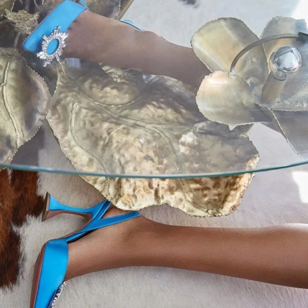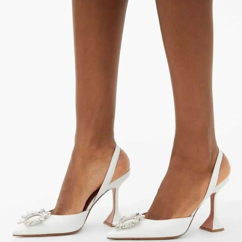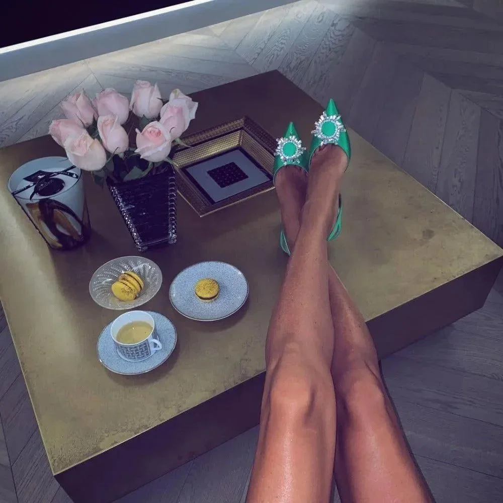 Elevate your style with our Crystal Embellished Pointed Toe Heels. These stunning heels feature a pointed toe design adorned with a dazzling crystal brooch that adds sophistication and glamour. Made from high-quality materials for comfort and style throughout the night. Pair them with dresses or jumpsuits for a fashionable look. Explore more outfit ideas on our Instagram @mermaid_way. Heel height: 3 inches. Satin fabric with crystal cup decoration. Tailor-made item.