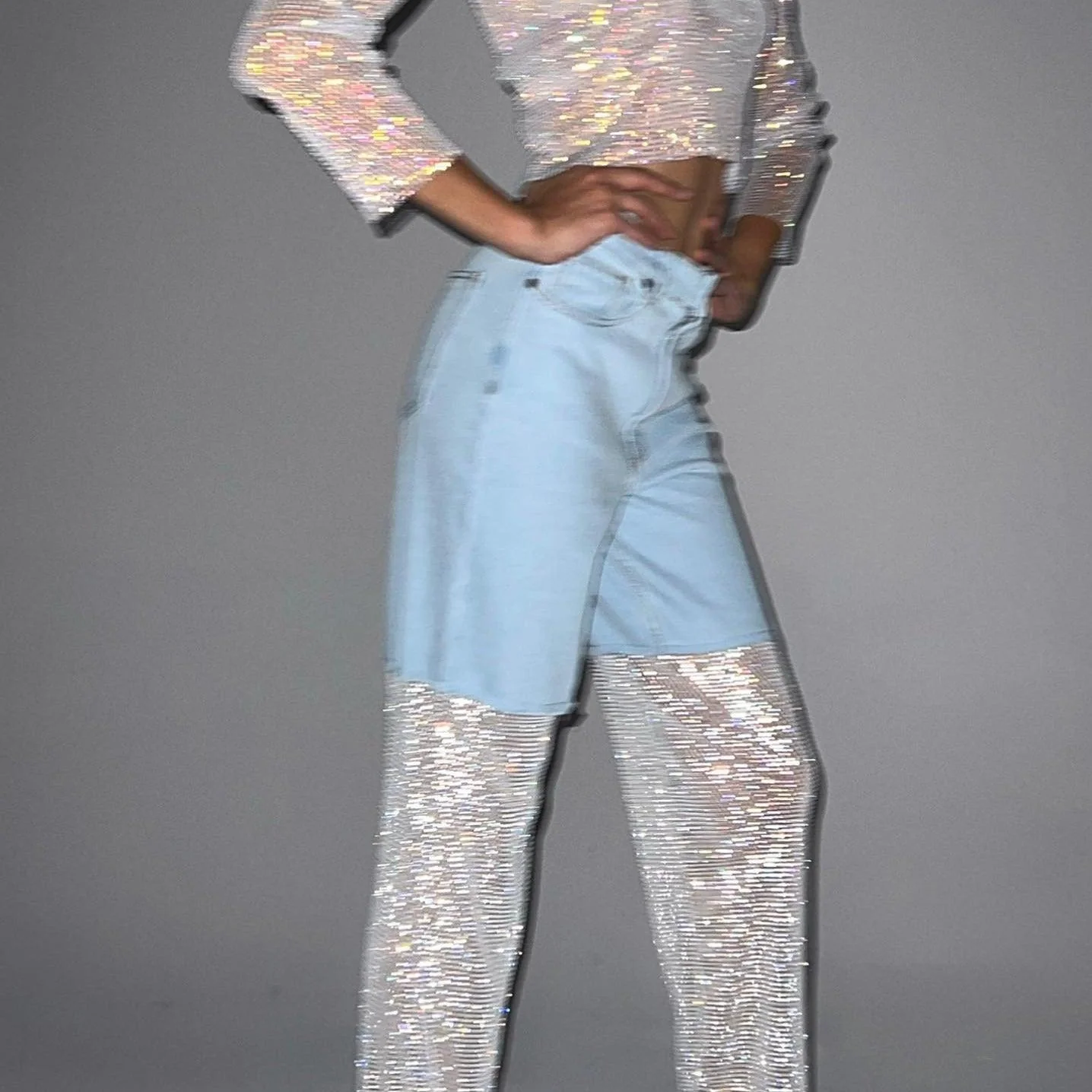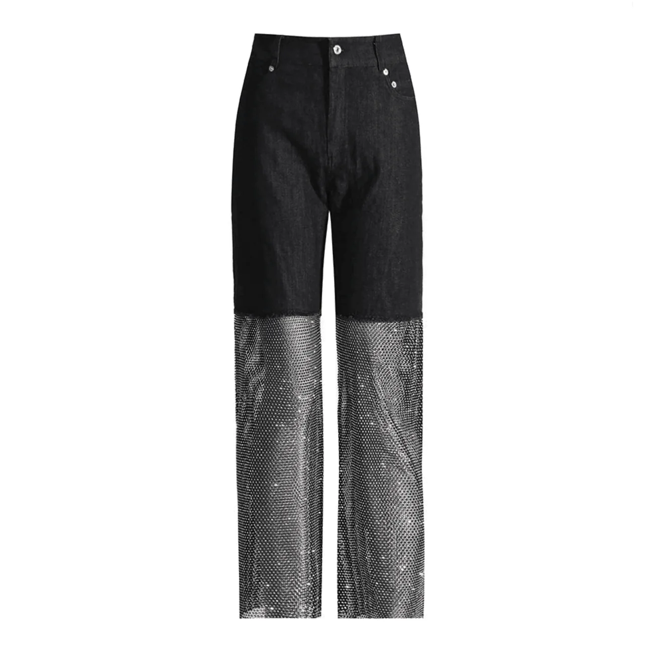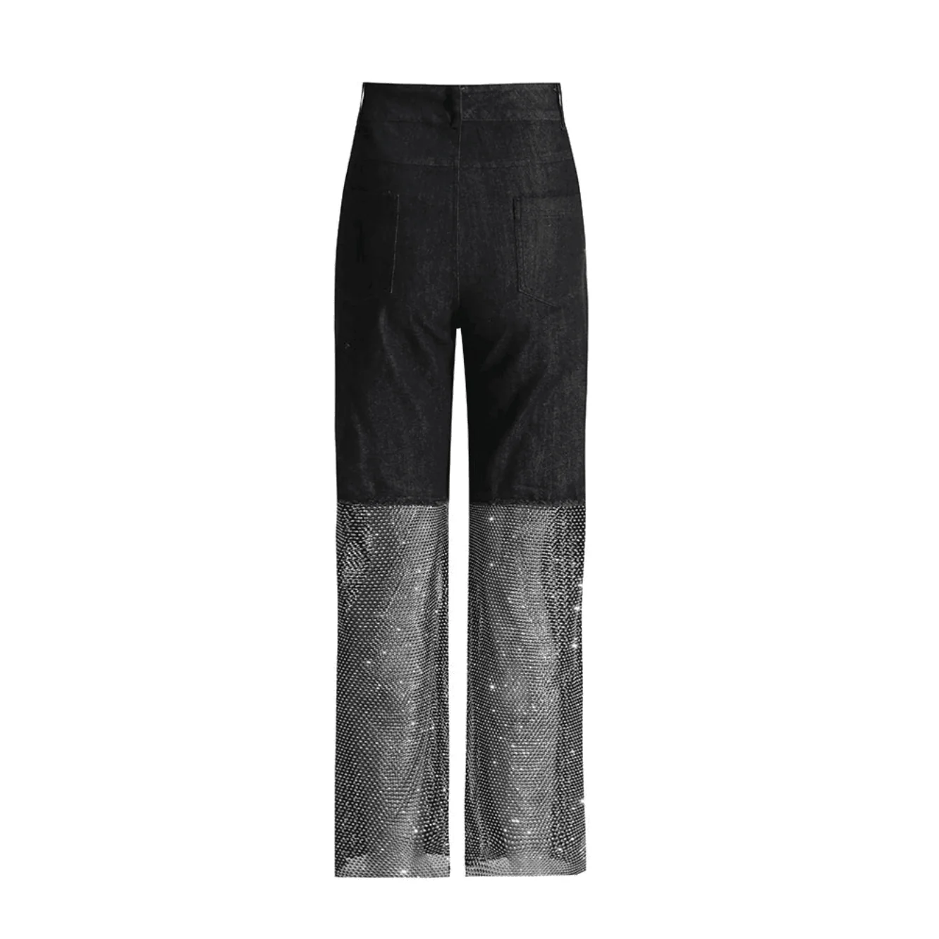 Elevate your style with our Crystal Mesh Wide Leg Jeans featuring a stunning diamond mesh design. Crafted for both glamour and modern sophistication, these jeans offer a flattering wide leg silhouette that transitions effortlessly from casual to chic. Made with a blend of high-quality materials including rhinestone and cotton, these jeans exude comfort and luxury. Perfect for any occasion, these versatile jeans will be your go-to choice. Explore fashion innovation with these essential mesh wide leg jeans now! Hand wash recommended. If the fit isnt right, well happily exchange for a different size.