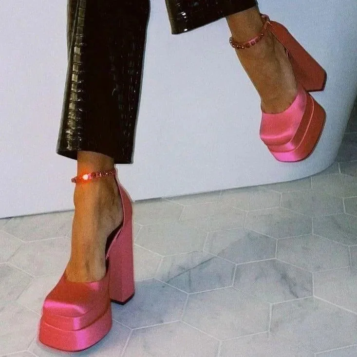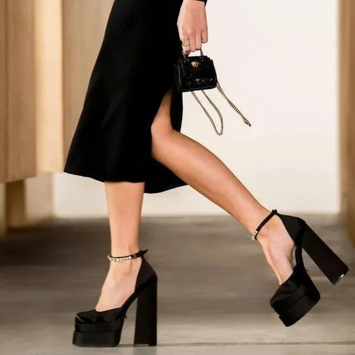 Elevate your style with our Crystal Strap Satin Platform Pumps. Perfect for special occasions, the satin finish adds a luxurious touch. Featuring a sparkling crystal strap and a comfortable double platform design, these pumps offer all-night wear without discomfort. The ankle strap provides both security and style, while the classic pointed toe shape exudes timeless sophistication. Explore more style inspirations on our Instagram @mermaid_way and transform your wardrobe with these elegant high heel shoes.