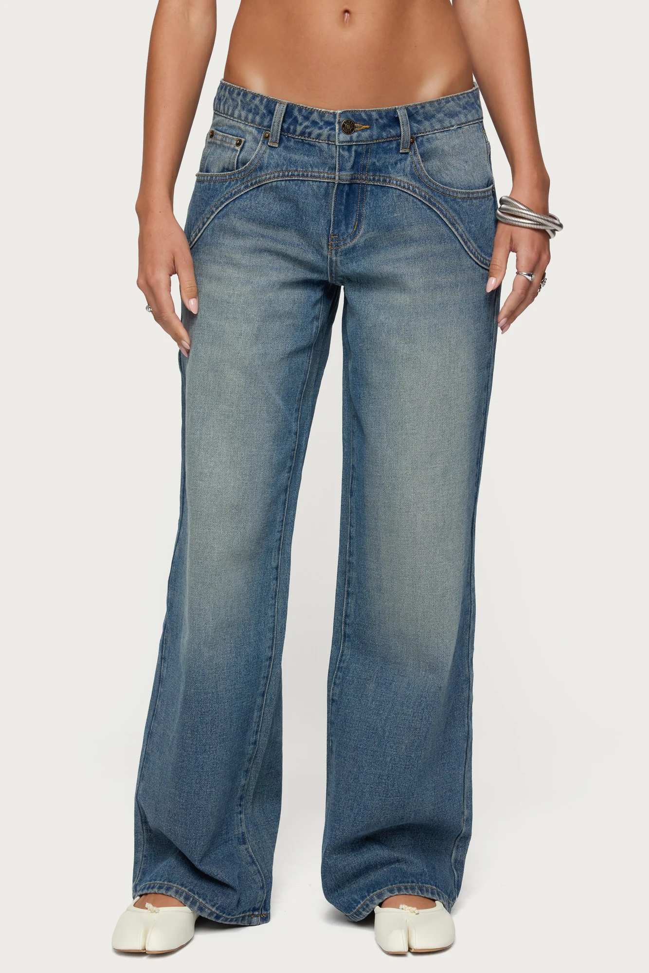 These Blue Low Rise Denim Jeans feature a stylish curved stitch detail, made from 100% Cotton fabric for comfort and durability. The low-rise waist adds a modern touch, perfect for casual wear. Machine washable. Model wears size S with inseam length of 32.09 inches. Model height is 58. Care: Machine wash cold, do not bleach, tumble dry low, iron on low heat, do not dry clean.