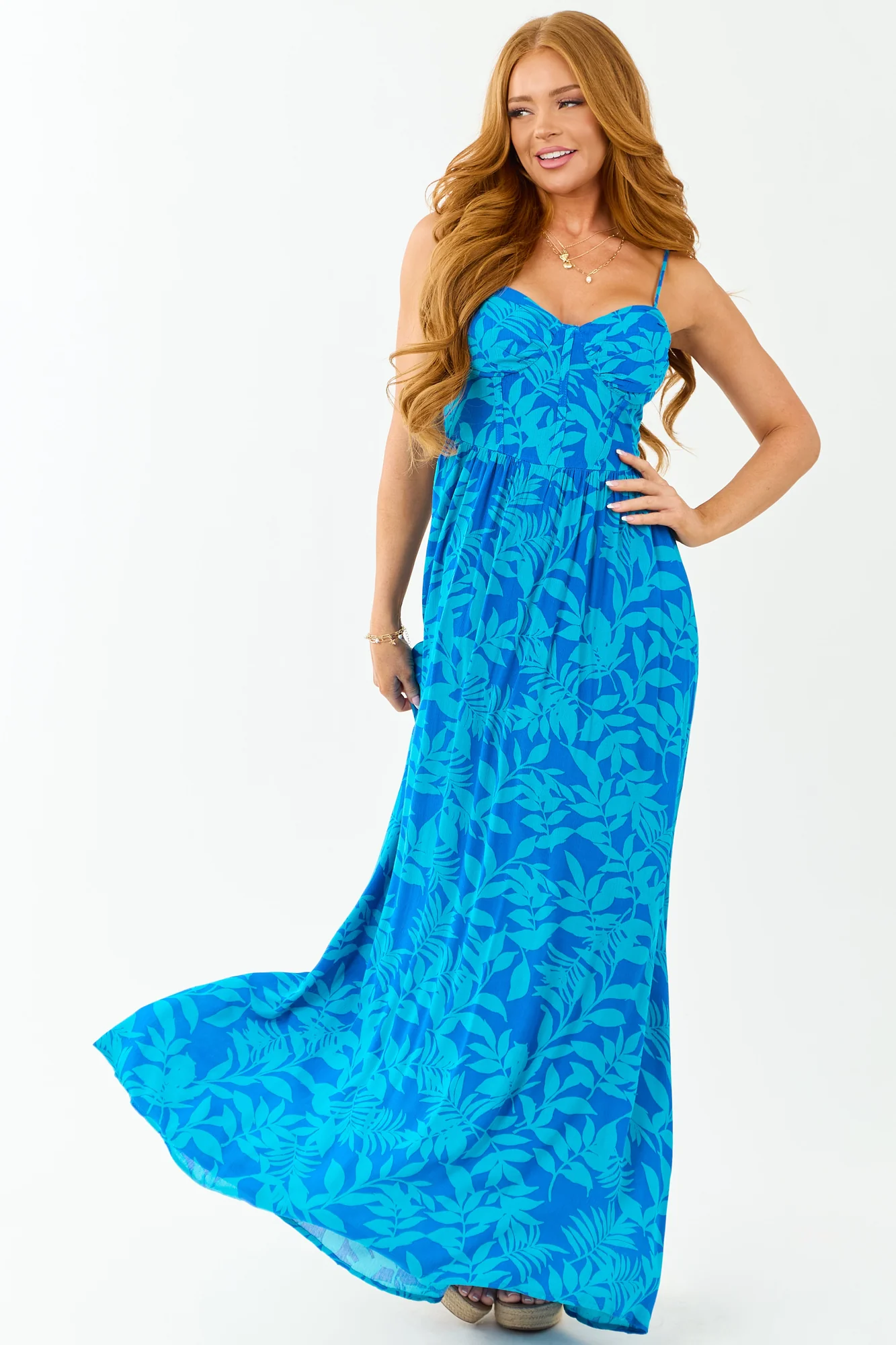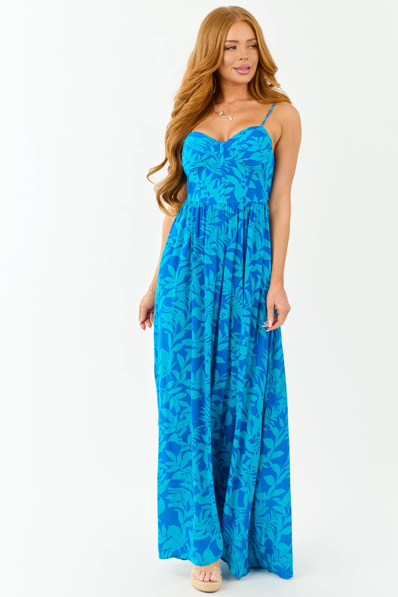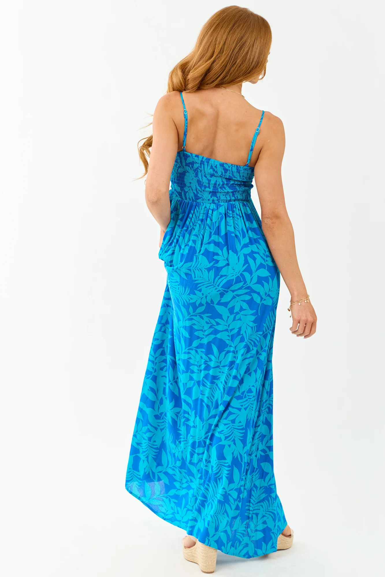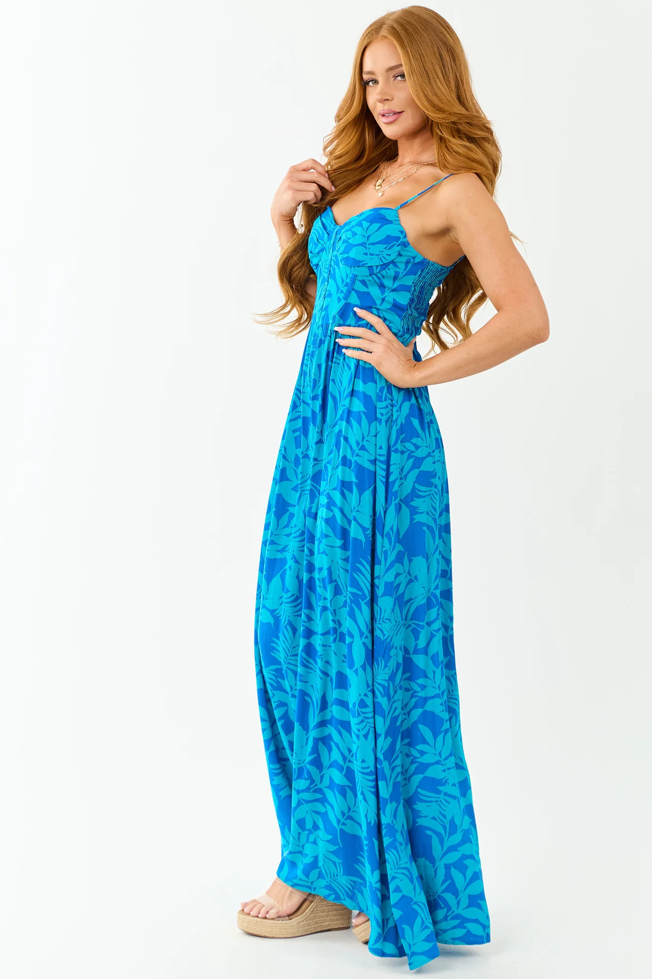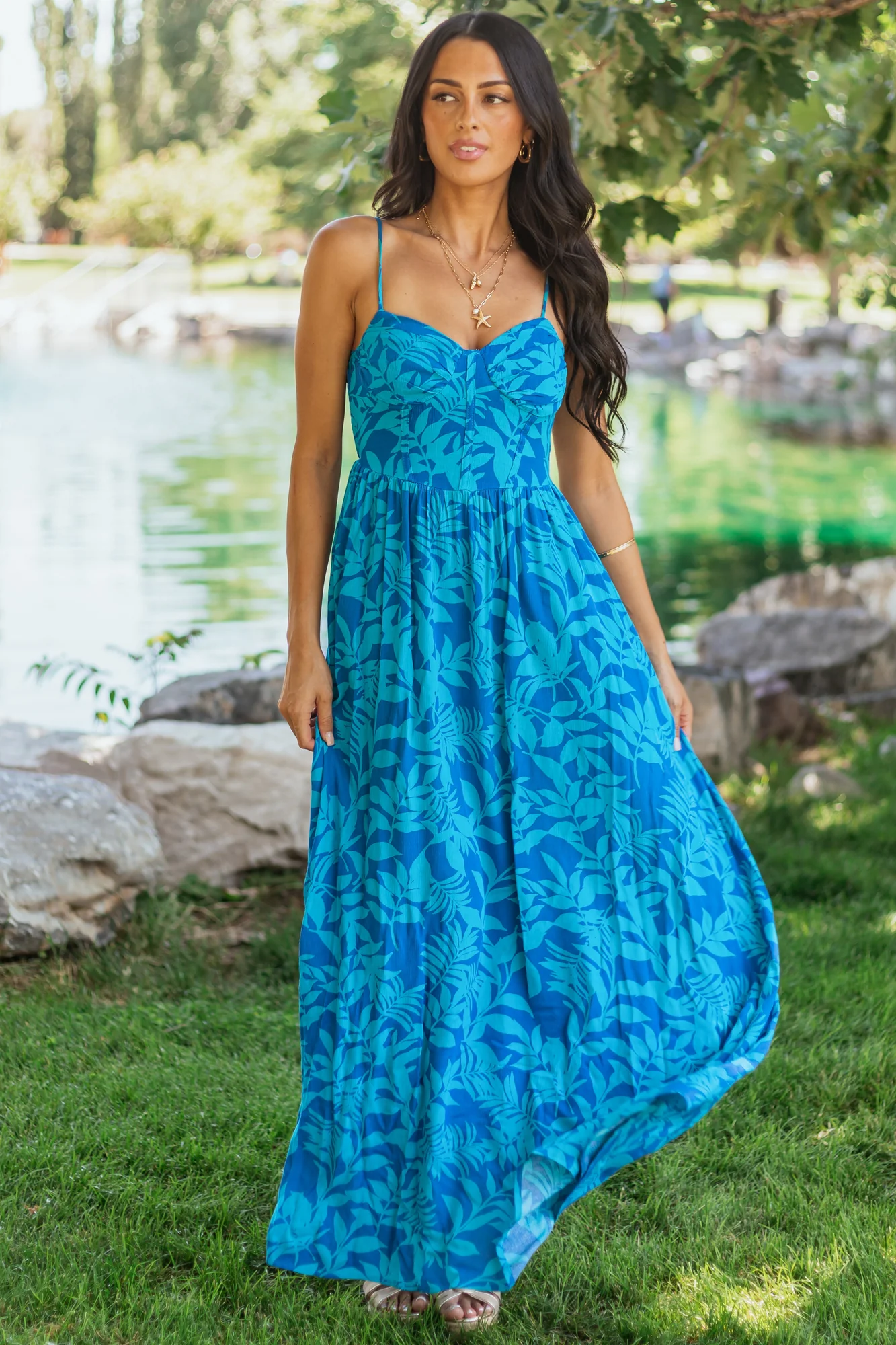 This Dark Aqua Tropical Print Maxi Dress brings the perfect blend of cobalt and tropic prints for beach days and evening outings. Designed with a stretchy smocked back, adjustable spaghetti straps, and a corset-style bodice, this dress offers comfort and style. The padded and lined bust ensures a flattering fit. Made of 100% Rayon with a 88% Polyester, 12% Spandex lining. Each piece may vary slightly due to the cutting process. Embrace the tropical vibes with this stunning piece.