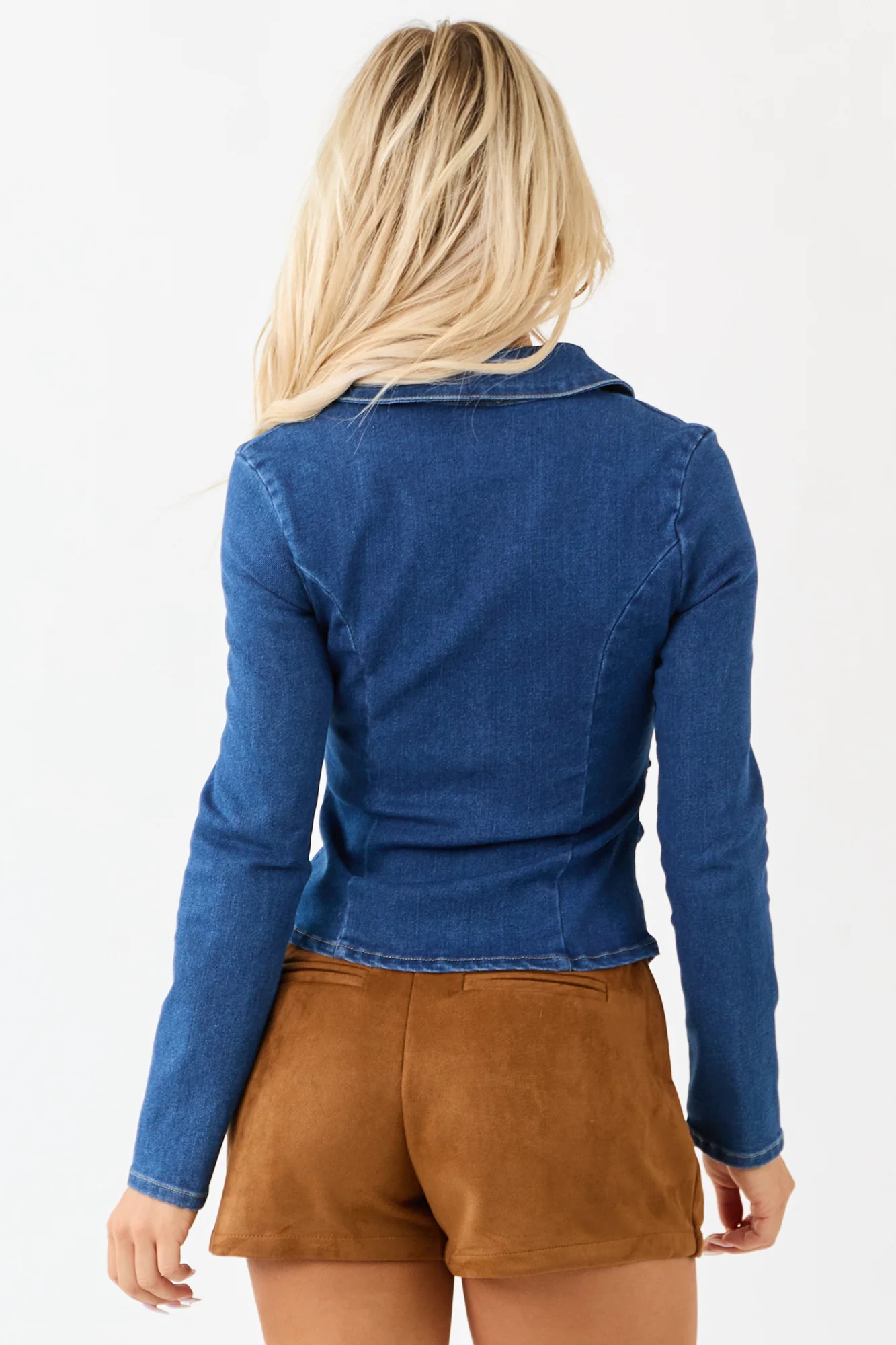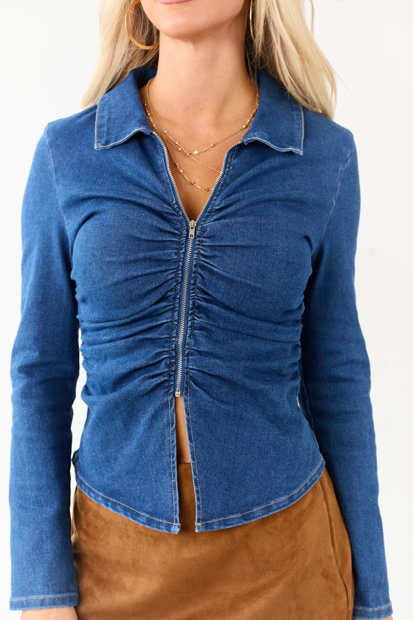 Make a style statement with our Dark Wash Denim Ruched Long Sleeve Zip Up Top. This top features flattering ruching, a convenient front zipper, and classic denim vibes. Expertly crafted from a stretchy blend of 68% cotton, 24% polyester, 6% rayon, and 2% spandex for ultimate comfort. Perfect for any casual or semi-formal setting. Available in sizes S, M, and L. Embrace the trend with Blue Blush!
