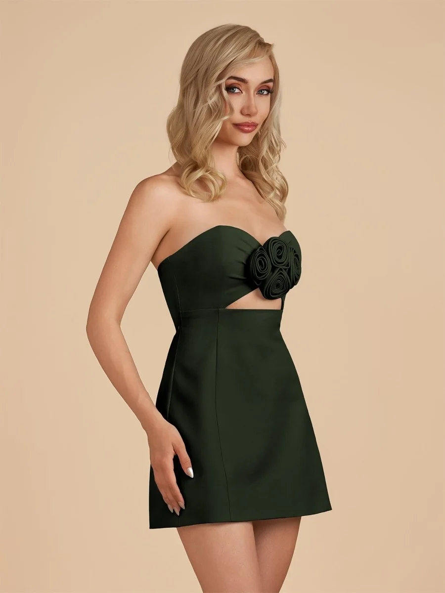 Indulge in the elegance of this dark green sheath homecoming dress crafted from luxurious satin, boasting a strapless design, intricate flowers, and a flirtatious front cutout. Perfect for homecoming, cocktail gatherings, or lavish nights out, the figure-enhancing silhouette and adjustable lace-up back make it a versatile and chic choice. Let this dress be your style statement – whether you sway on the dance floor or mingle with friends, count on standing out in impeccable charm. Available in various lengths and colors like sky blue, pink, ivory, and more. Embrace your allure with Kaida! Silhouette: Sheath; Material: Satin; Colors: Dark Green, Sky Blue, Pink, Ivory, Royal Blue, Black, Burgundy, Red, Navy Blue; Length: Short; Neckline: Strapless; Sleeves: Sleeveless; Back: Lace-up; Embellishment: Flowers, Cutout.