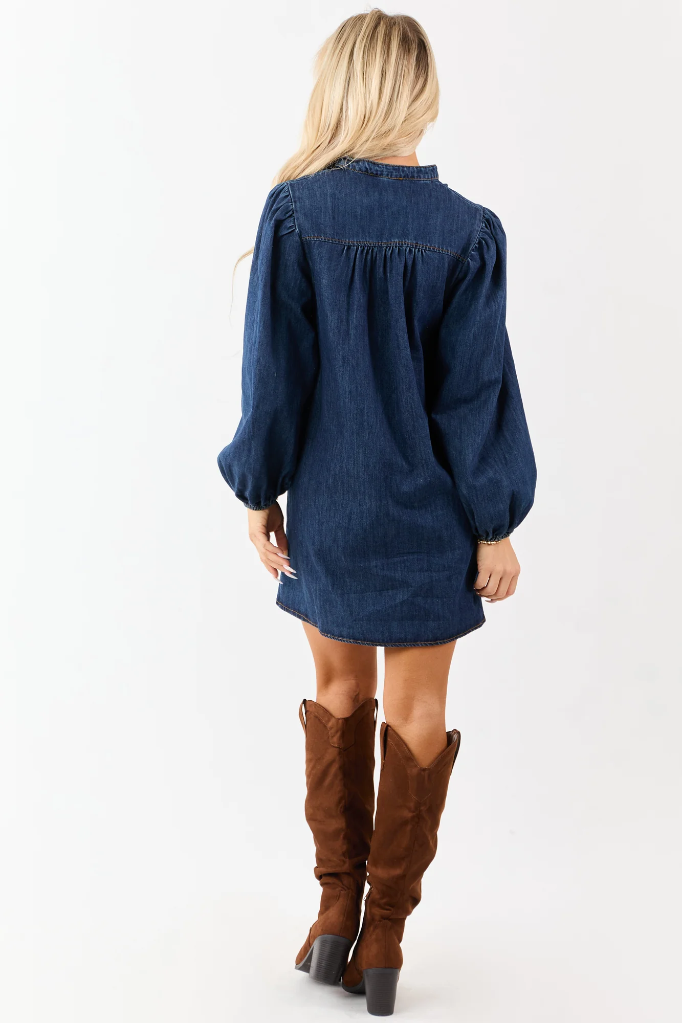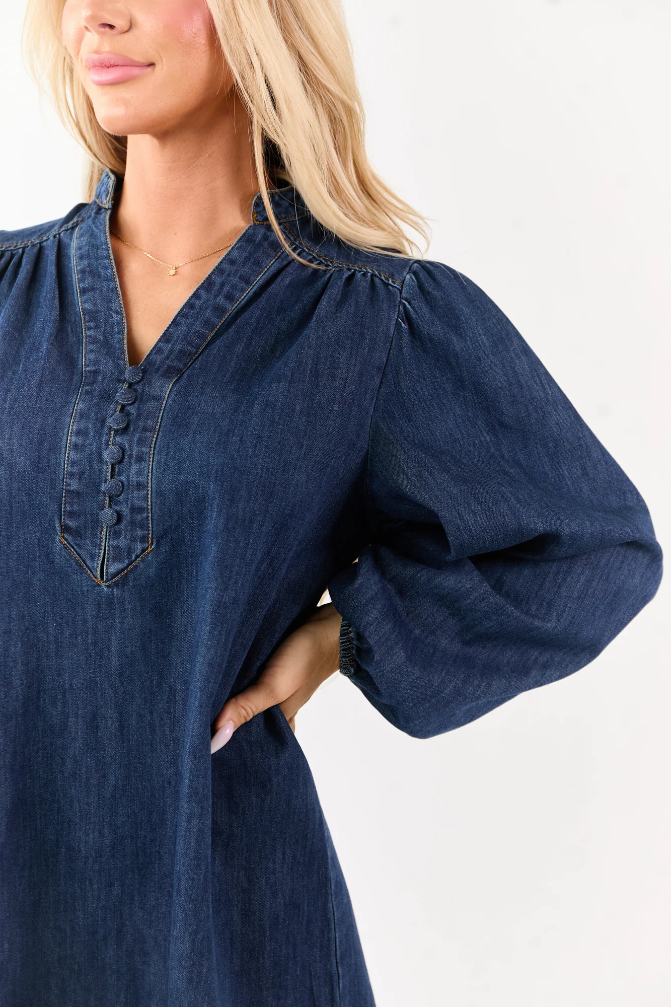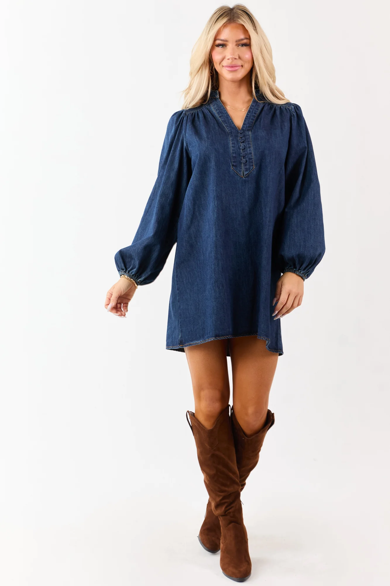 Discover the chic twist of denim in this Dark Wash Mini Dress . Embrace the flowy tent silhouette, the deep V-neckline with stylish button details, and the non-stretchy denim construction. Perfect for the fashion-forward woman, this dress is as comfortable as it is trendy. Imported, unlined, featuring elastic cuffs, and made of 90% Cotton and 10% Polyester. Size Small specifications: Bust 42 inches, Length 34.5 inches. Available in sizes XS, S, M, L, XL. Elevate your wardrobe with this unique piece!