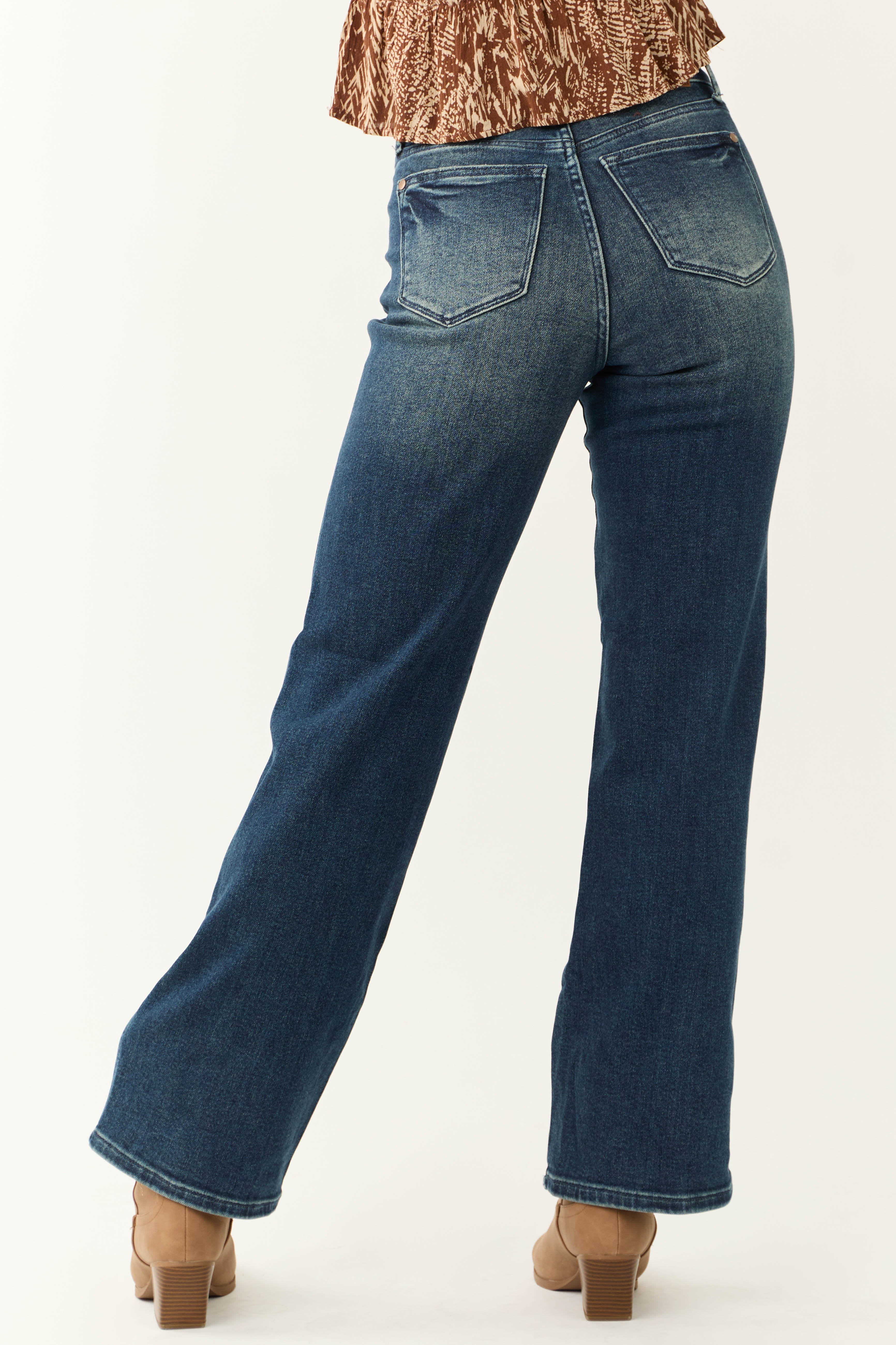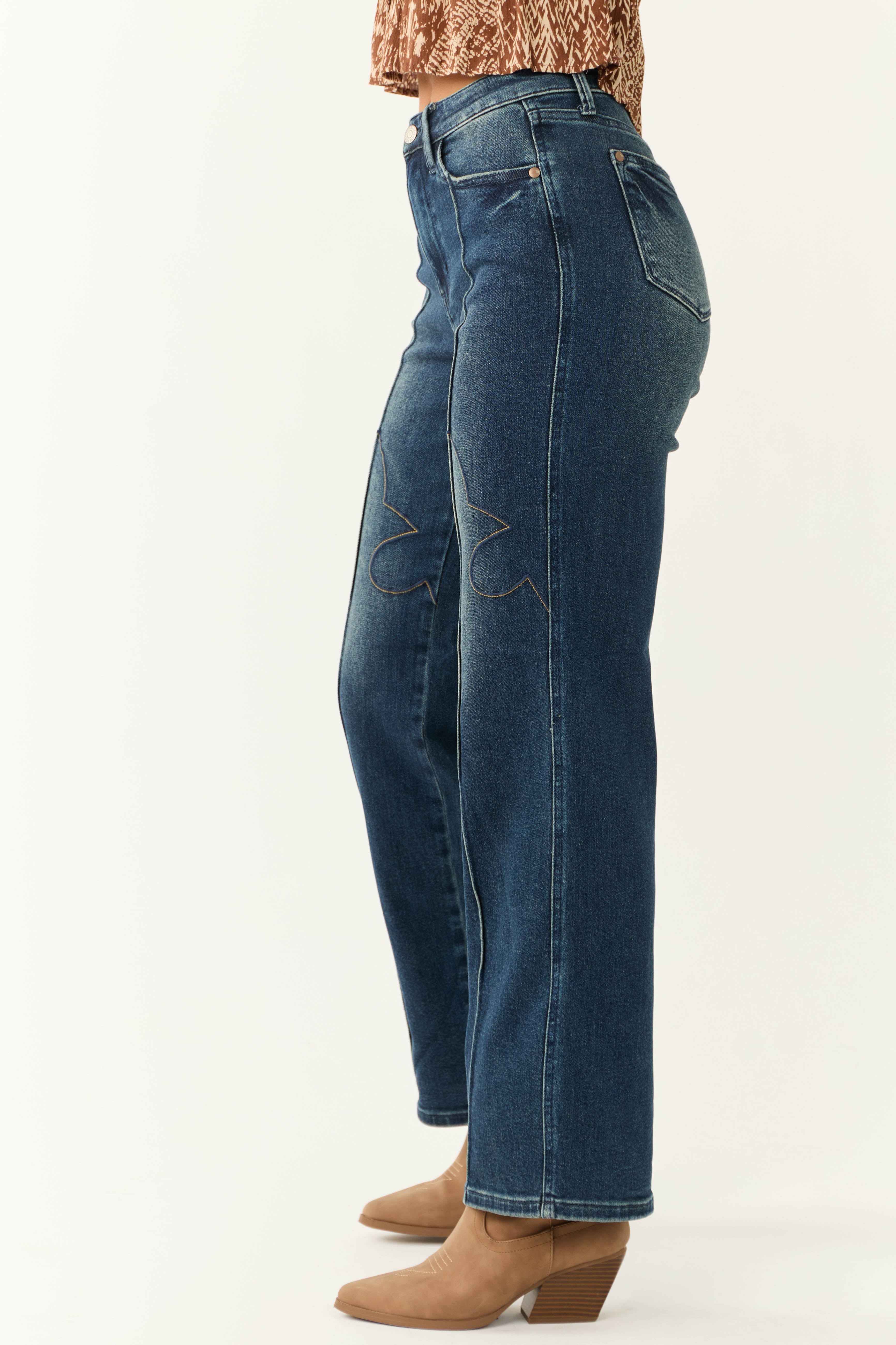Achieve effortless style with our Dark Wash Embroidered Detail High-Waisted Jeans. Crafted from semi-stretchy denim for comfort, these jeans feature 5 pockets, a zipper fly with a button closure, belt loops, and a straight leg cut. The high-rise design provides a flattering fit while the stretchy material offers flexibility in sizing. Made of 94% Cotton, 5% Polyester, and 1% Spandex. Hand wash cold and air dry for lasting quality. Elevate your look with these timeless jeans.
