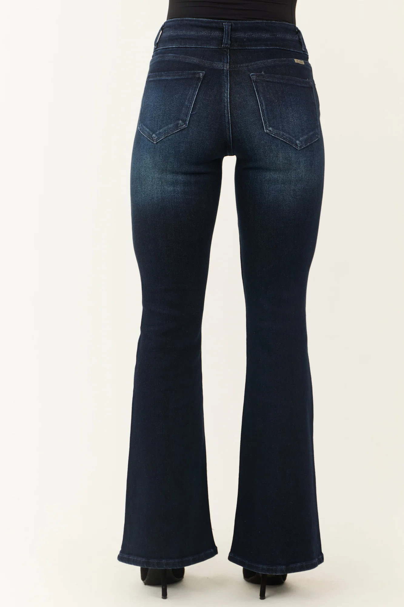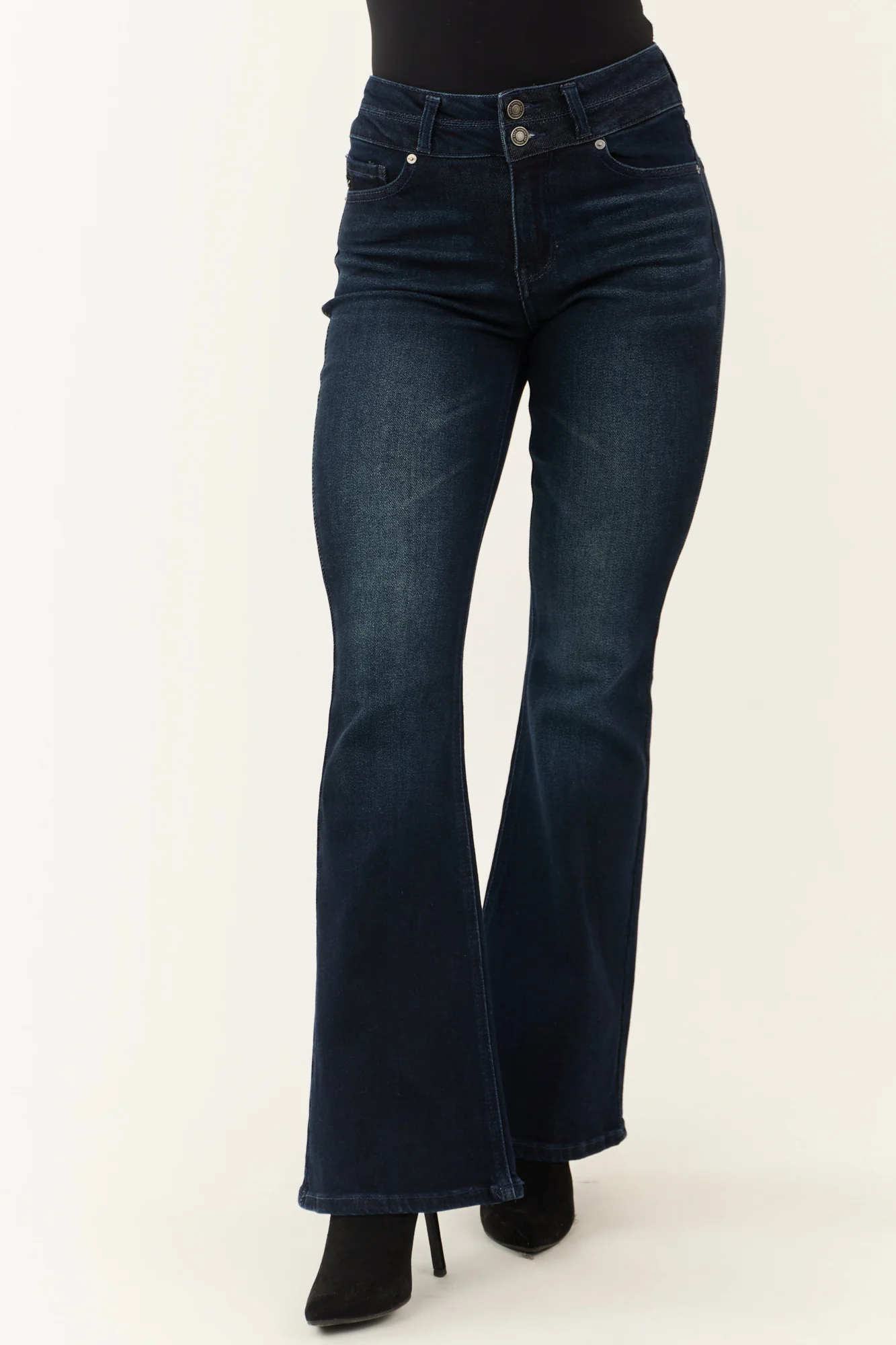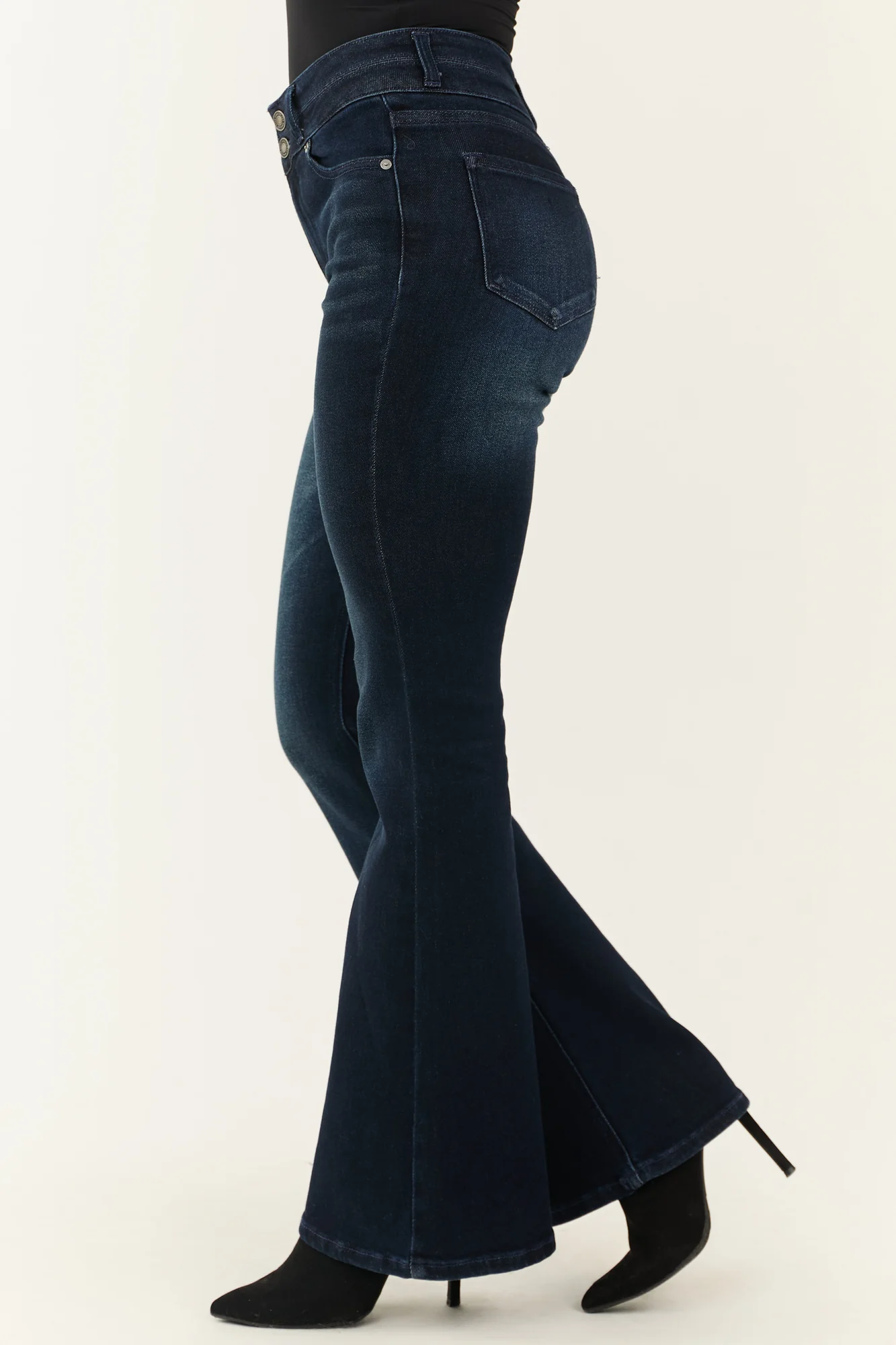 Stay on trend with our KanCan Dark Wash High Rise Double Button Flare Jeans. Available in multiple sizes, these jeans feature a slightly stretchy denim material that allows for extra comfort and a perfect fit. With a zipper fly, double button closure, and five functional pockets, these jeans combine style and functionality effortlessly. The high rise design and 32″ inseam provide a flattering silhouette. Made of 94% Cotton, 4% Polyester, and 2% Spandex, these imported jeans offer durability and stretch for everyday wear.