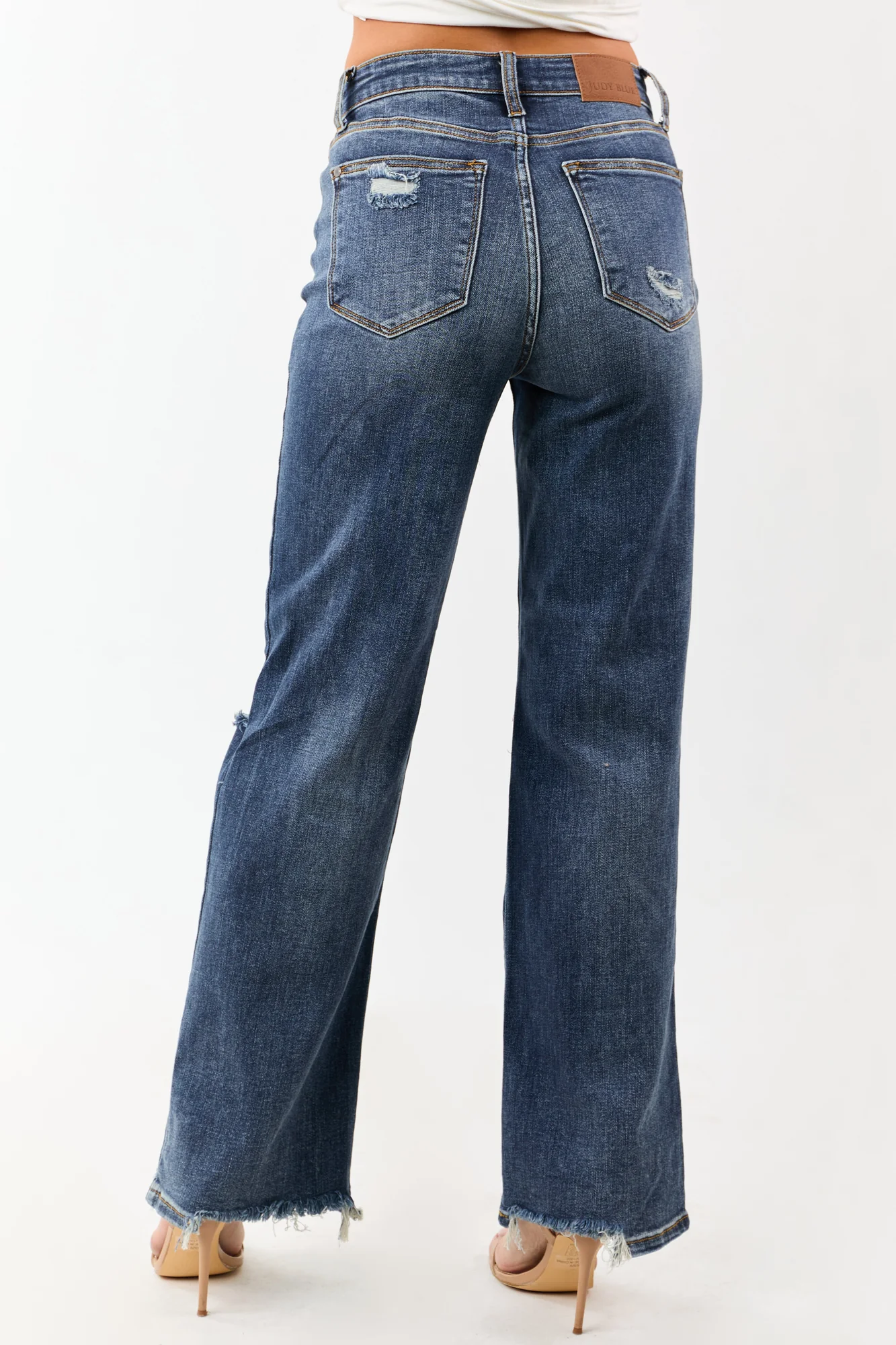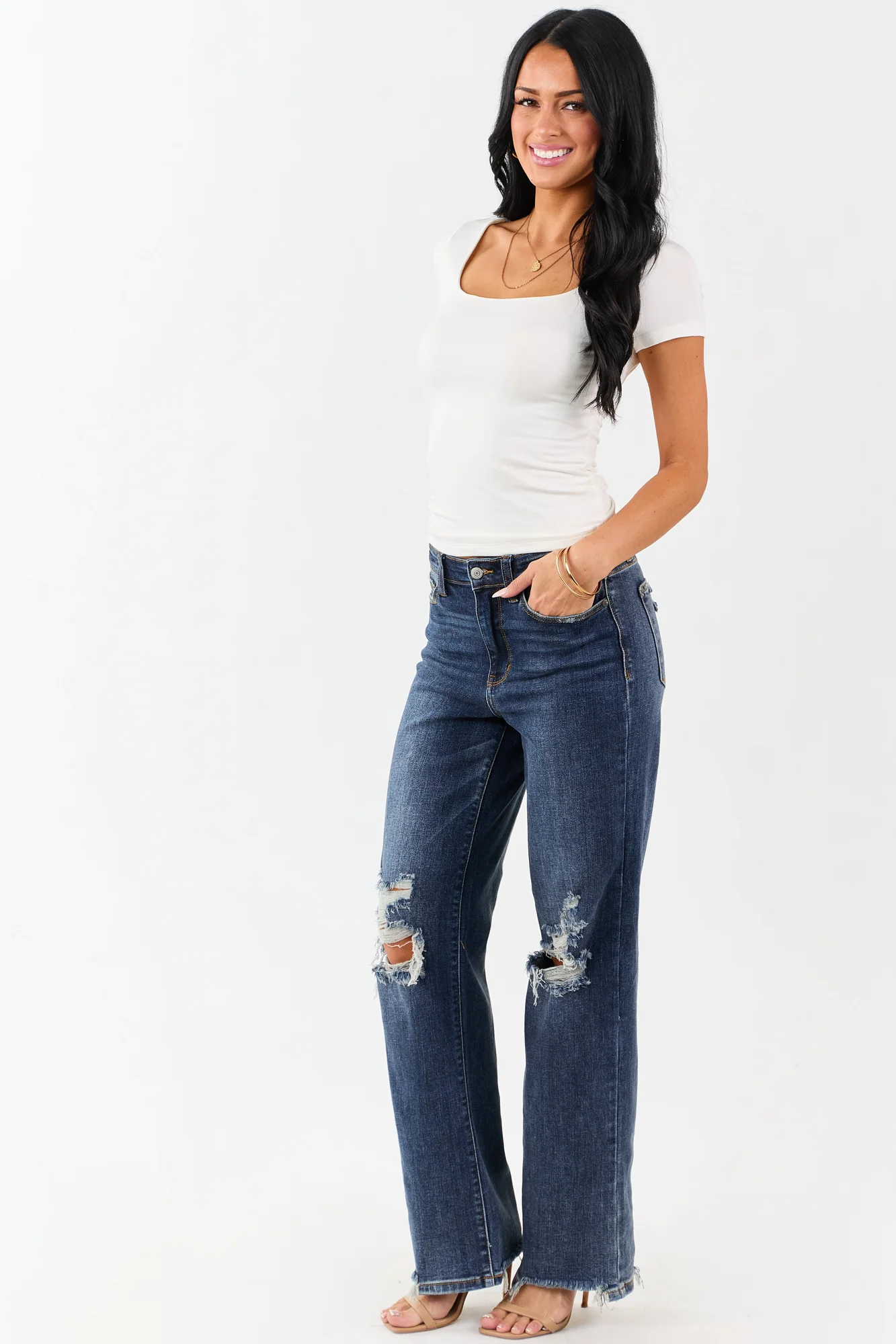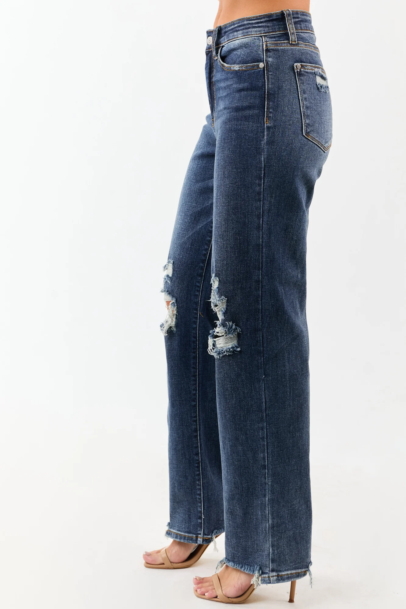 Discover the perfect blend of style and comfort with our Dark Wash Relaxed Straight Stretchy Jeans. Crafted from premium stretchy denim, these jeans feature a high rise for a flattering fit. The distressed details and shark bite hem add an on-trend touch. Equipped with 5 pockets, zipper fly, and button closure, these versatile jeans are a wardrobe essential. Made of 93% Cotton, 6% Polyester, and 1% Spandex, they offer both durability and flexibility. Whether youre running errands or headed out for a night with friends, these jeans will keep you looking chic. Models height and size information included for reference.
