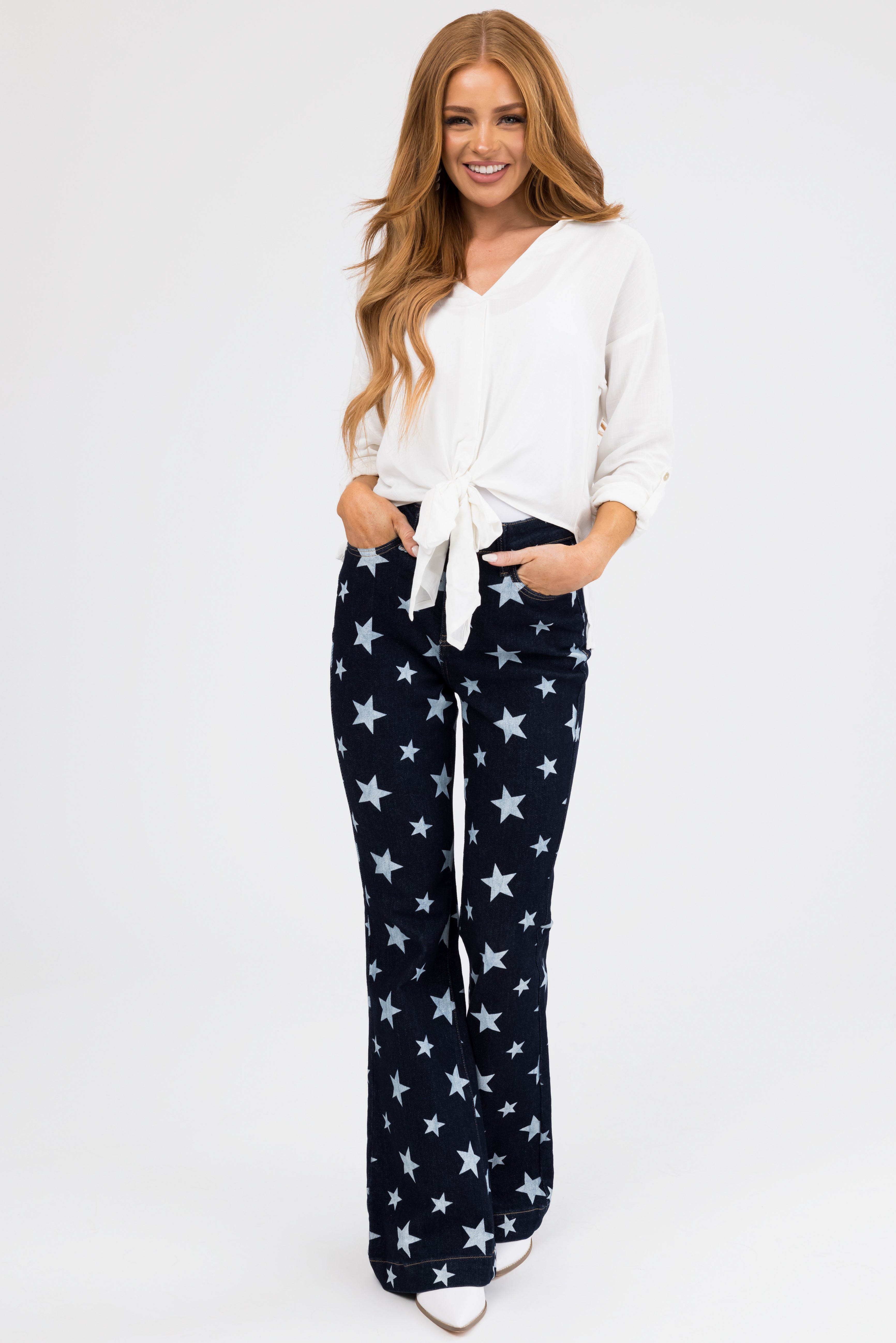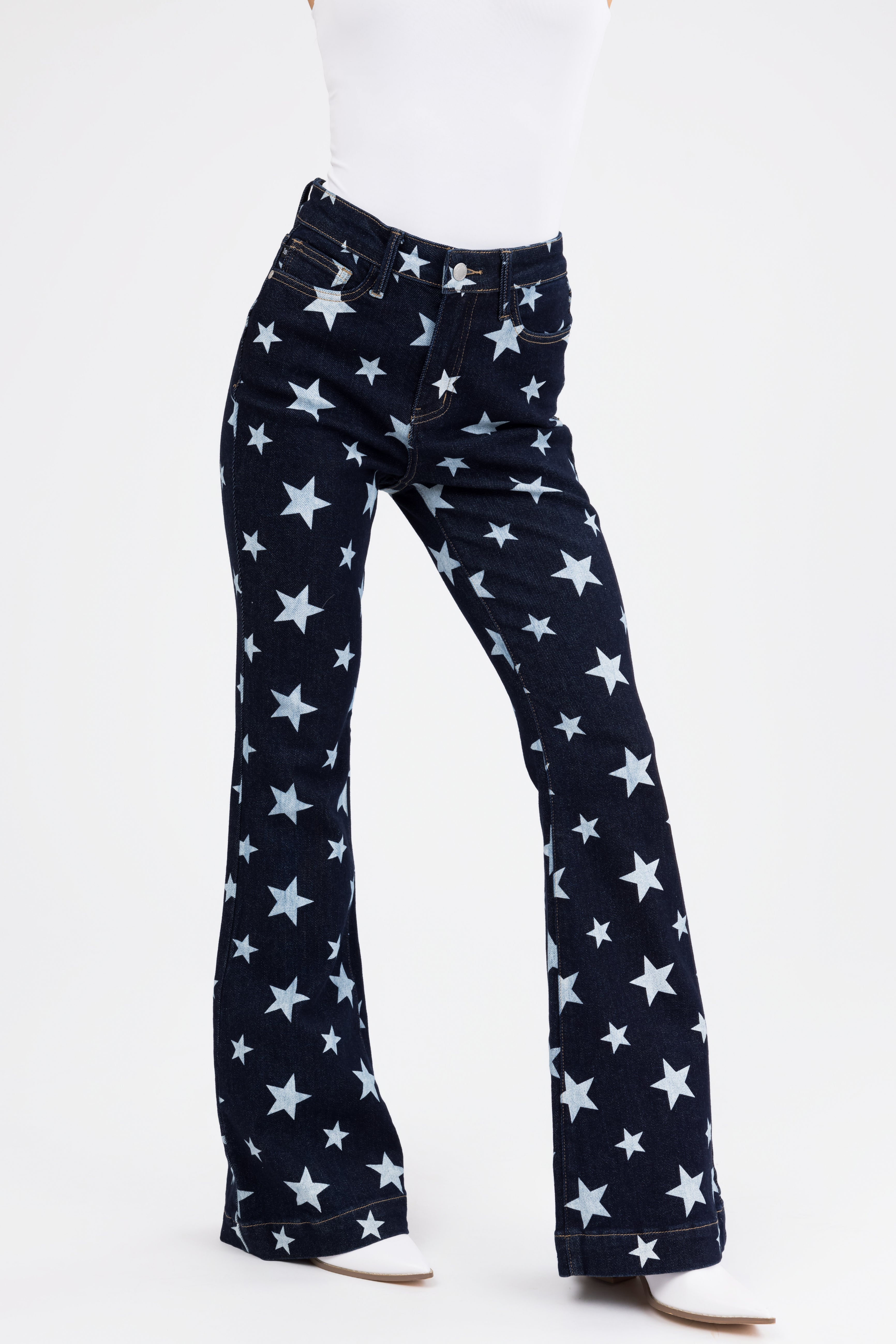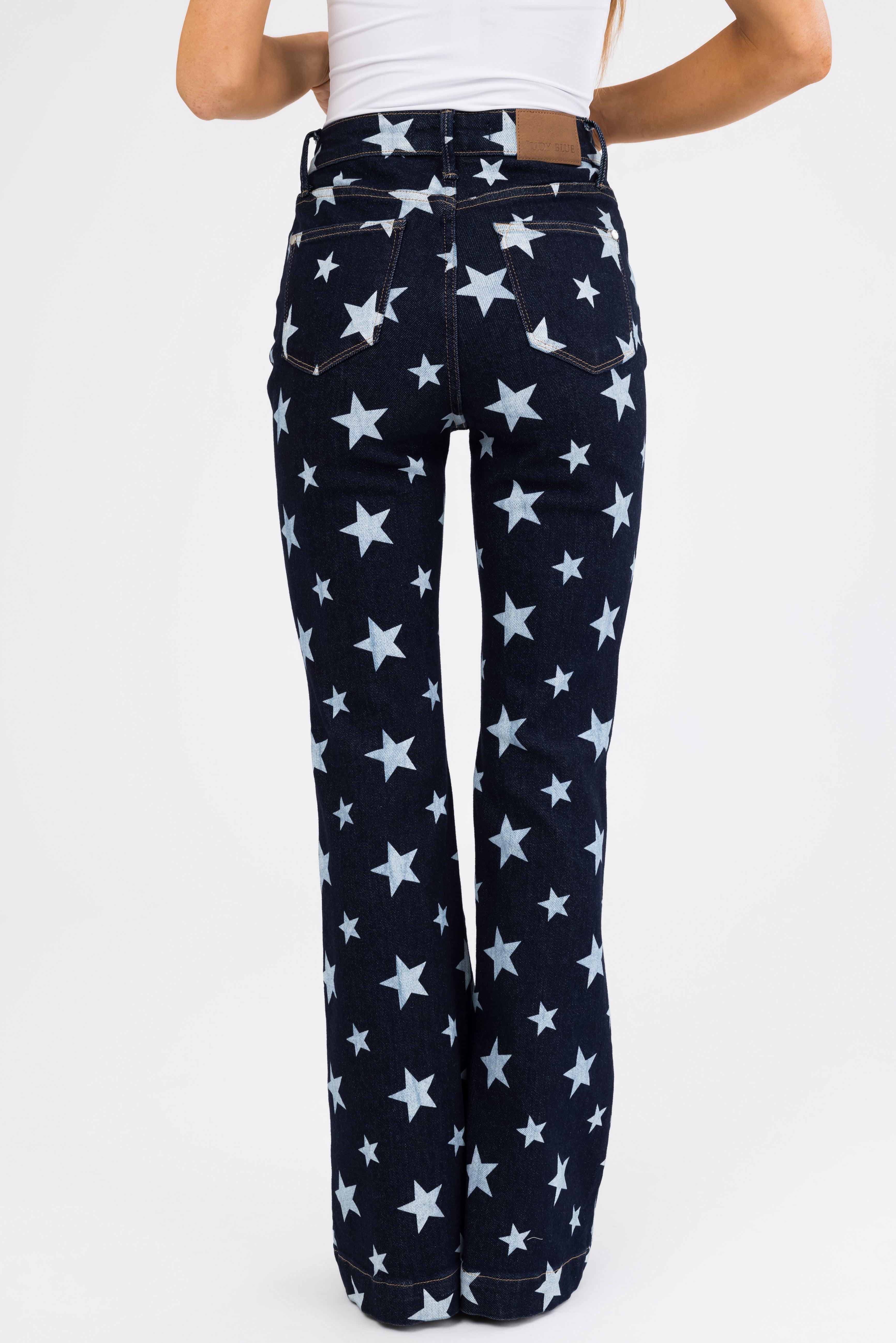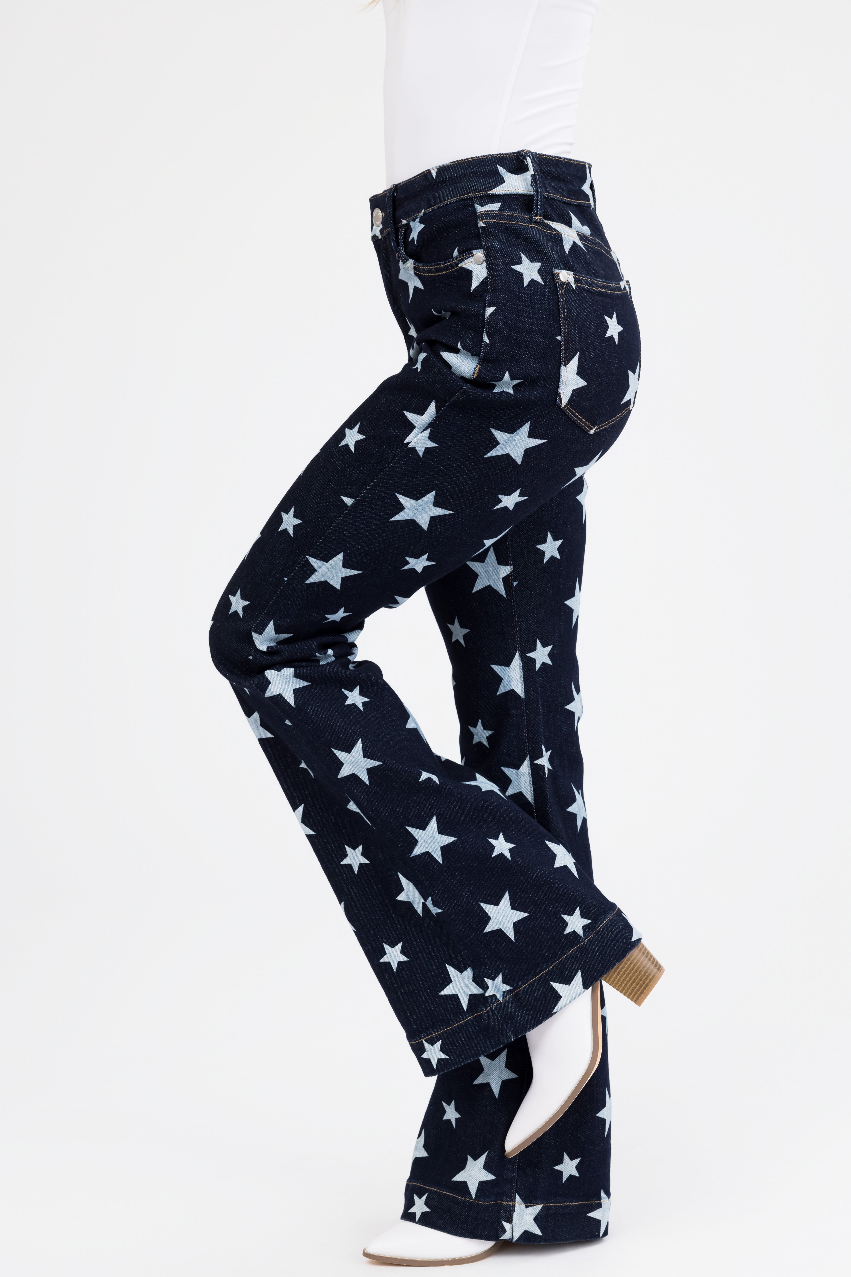 Upgrade your style with these flattering Dark Wash Star Print Flare Leg Jeans . Made of 43% Cotton, 5% Polyester, and 1% Spandex, these jeans offer a comfortable fit with a 10.5″ front rise and a 32″ inseam. The high-rise design and stretchy denim ensure a perfect blend of style and comfort. Express your unique fashion sense with subtle star print details in shades of Vanilla. Be ready for compliments wherever you go! Care instructions: Hand wash cold, wash dark colors separately, do not bleach, lay flat to dry, and use a cool iron if needed.