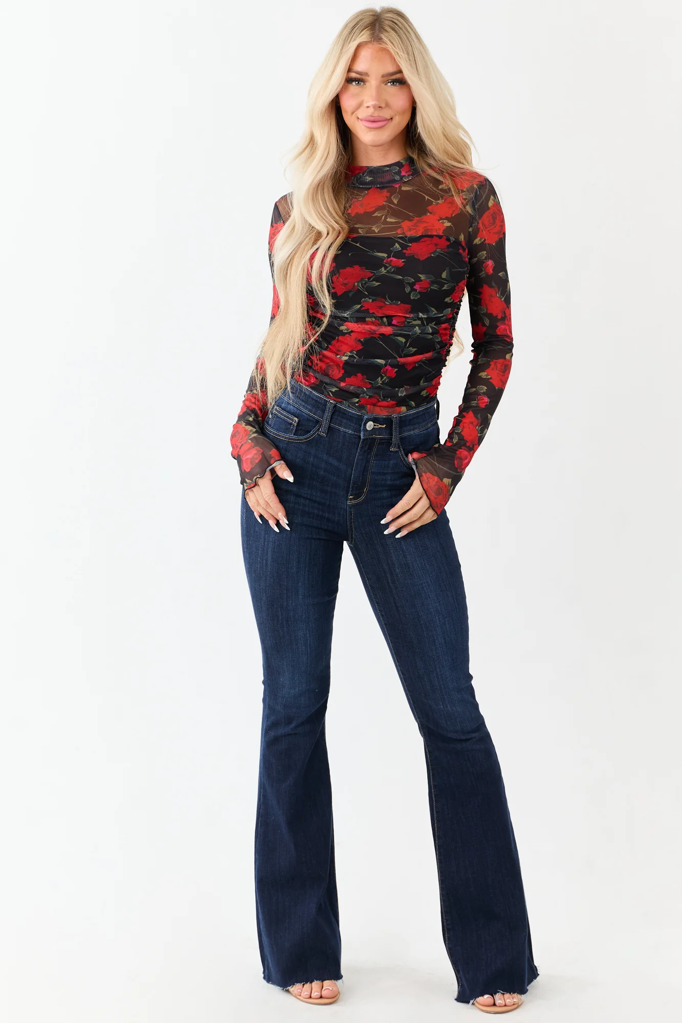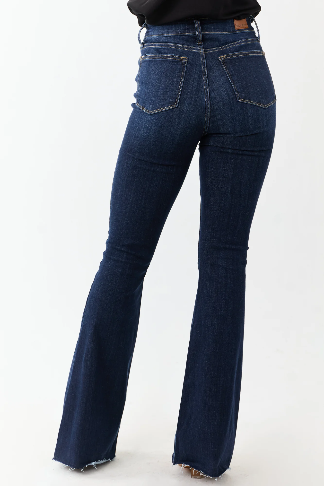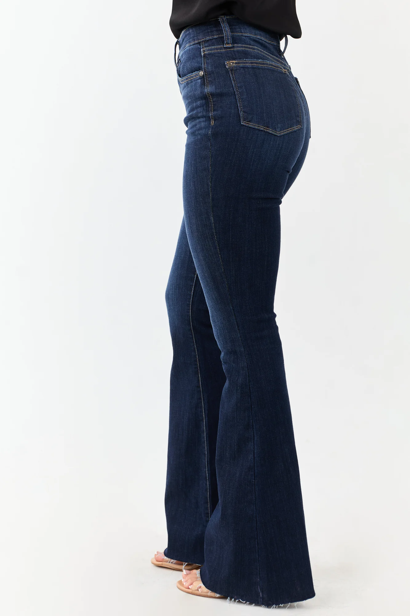 Elevate your style with these dark wash stretchy flare leg jeans . Designed for height and curves, the high-rise silhouette features a raw hem, zipper fly, and button closure. Crafted from 52% cotton, 23% polyester, 22% rayon, and 3% Lycra for ultimate comfort and stretch. Pair with your favorite top for a chic look that effortlessly lengthens your silhouette. Model is wearing size 3, height 57″, bust 35″, waist 26″.
