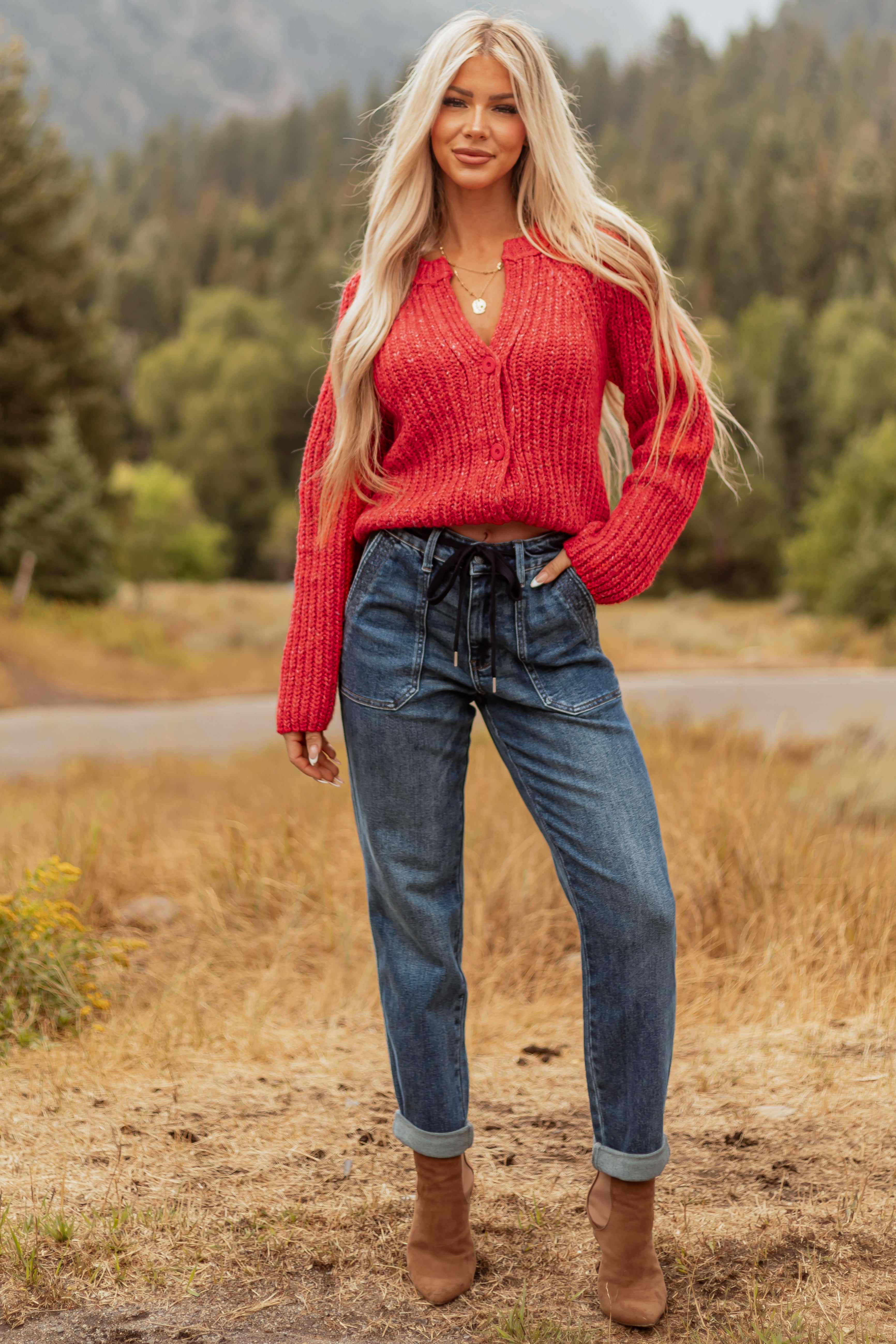 Experience the perfect blend of sporty and chic with our Dark Wash Stretchy Jogger Jeans. These high-rise jeans offer a comfy stretch, tapered cuffed fit, and stylish details including an elastic waistband with drawstring and light distressing. The durable denim, zip fly with button closure, and 4 pockets ensure both style and functionality. Available in sizes 0-15 with cuffed inseam of 28.5and uncuffed inseam of 31. Make a fashion statement with these imported jogger jeans!