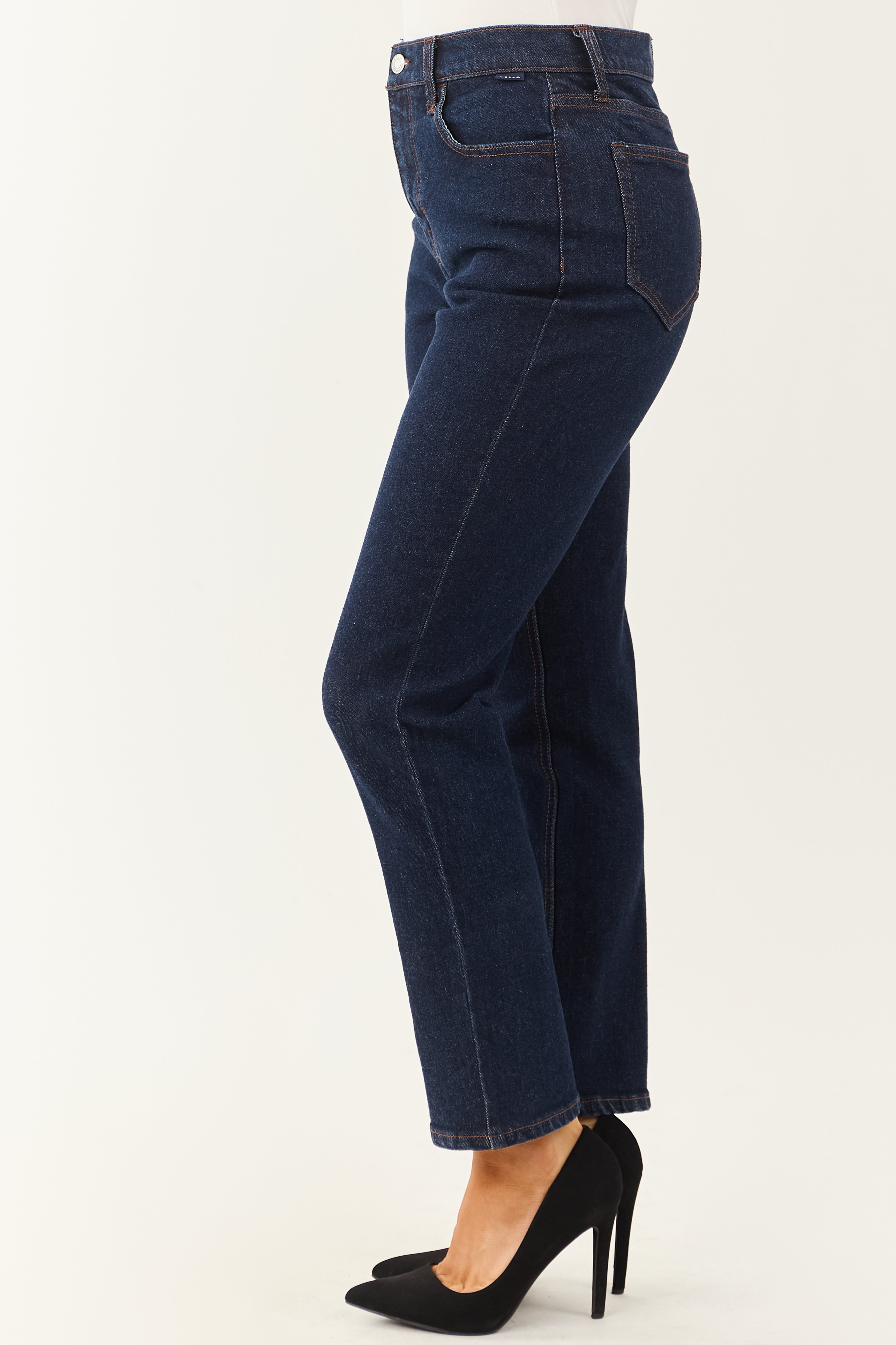 Experience timeless elegance with these Dark Wash Stretchy Straight Fit Denim Jeans . Crafted from stretchy denim, these jeans offer a comfortable slim fit with a high rise design. Featuring a zipper fly, button closure, belt loops, and five pockets, these ankle-length jeans are perfect for any occasion. The inseam measures 28 inches, and the fabric is 98% Cotton and 2% Spandex for optimal stretch and style. Elevate your wardrobe with these effortlessly chic jeans that fit true to size.