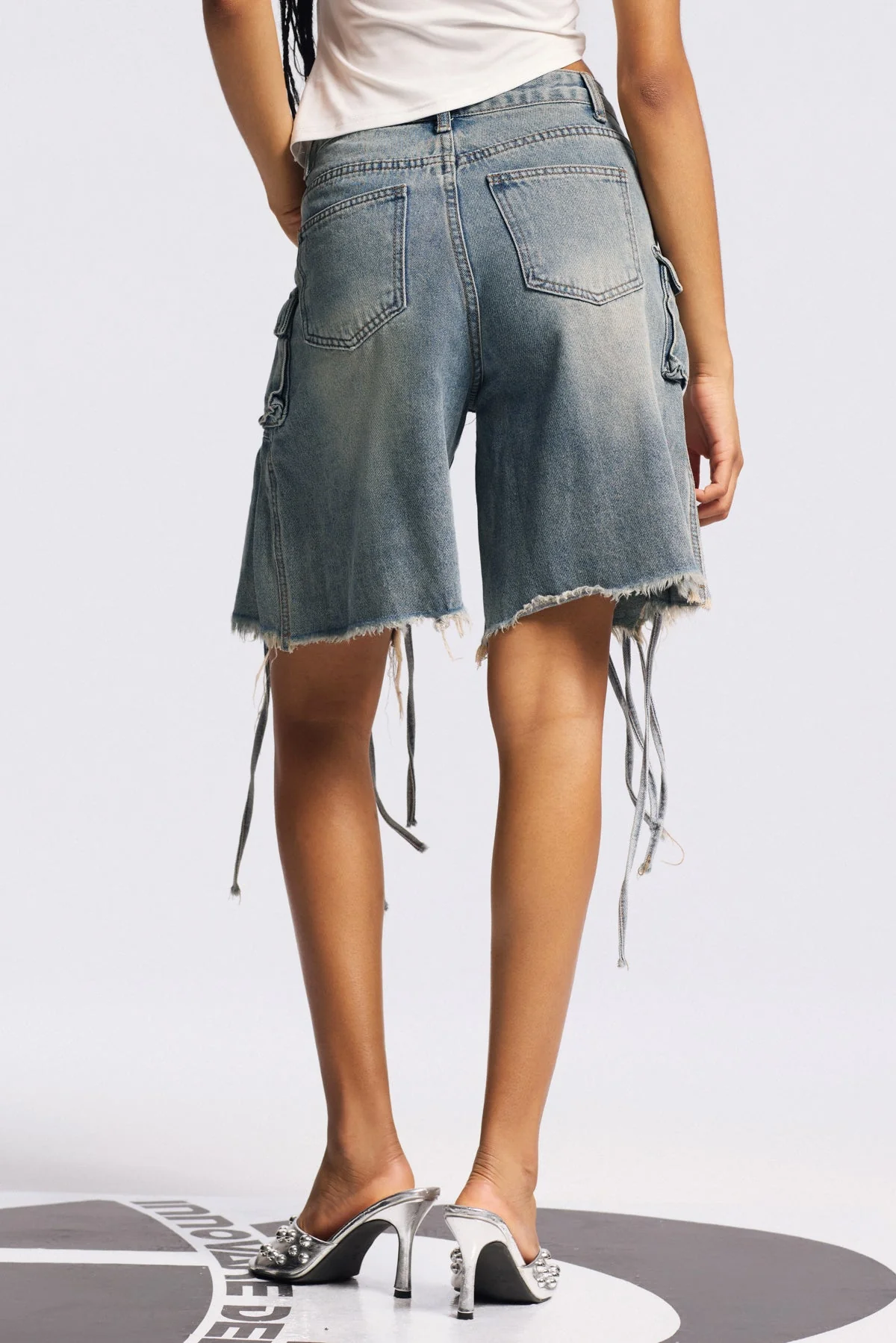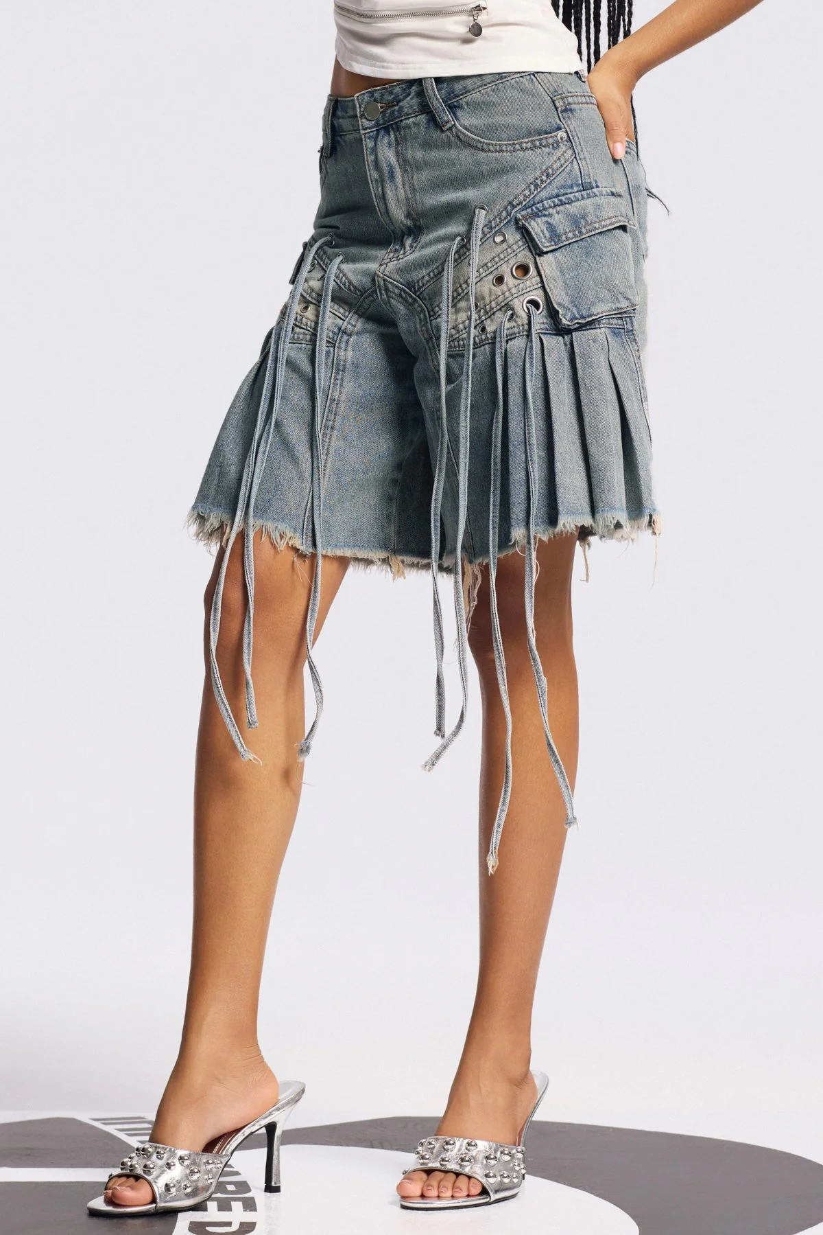 Discover the elegance of deep blue midi jeans adorned with unique bile fringe ruffle detailing. Crafted from premium denim for durability and comfort, these jeans feature a sophisticated silhouette and versatile midi length suitable for any occasion. Their non-stretch design ensures a clean look that pairs perfectly with casual or elevated outfits. Experience a blend of style and sophistication with these exquisite jeans. Color may vary due to lighting in images.