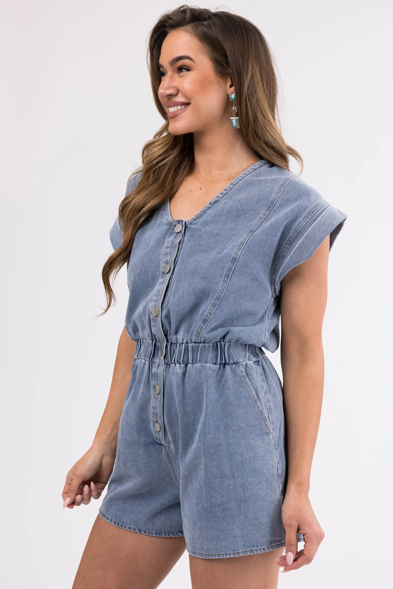 This stylish Denim Button-Down Romper offers a relaxed fit with short sleeves and an elastic waistband for extra room. Made of 92% Cotton and 8% Polyester, it features a V neckline, rolled cuffs, and convenient pockets. Perfect for casual or daytime occasions. Hand wash cold and lay flat to dry. Model is 59″ wearing a size Small (S).