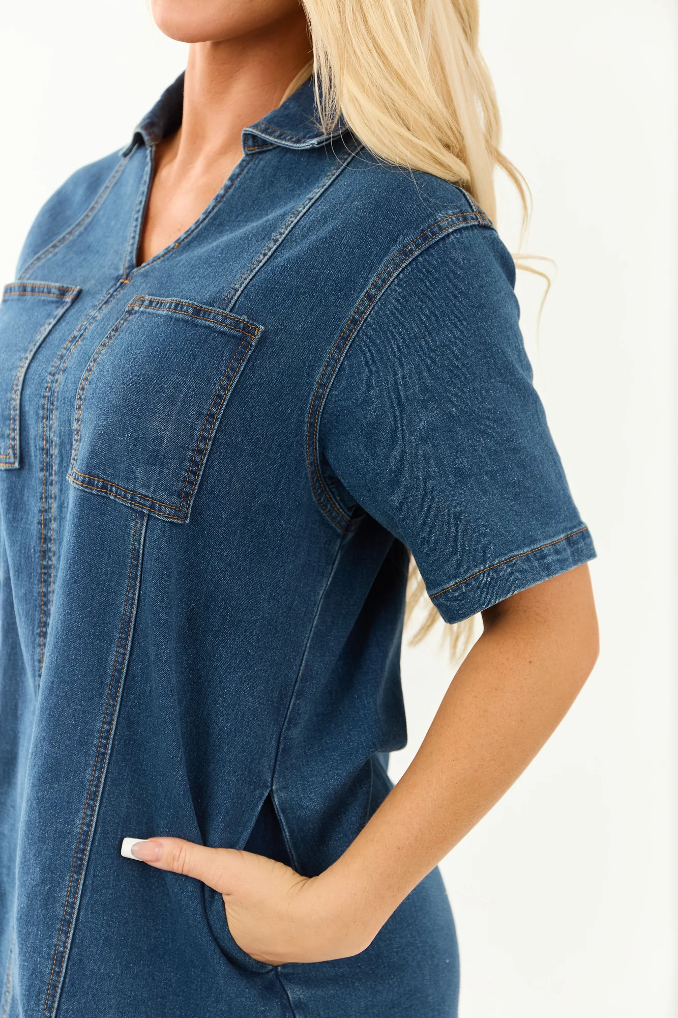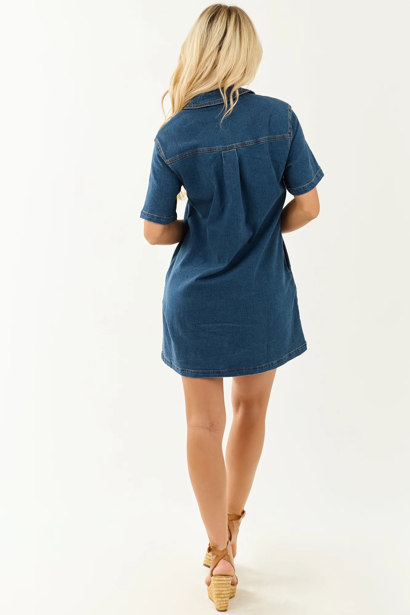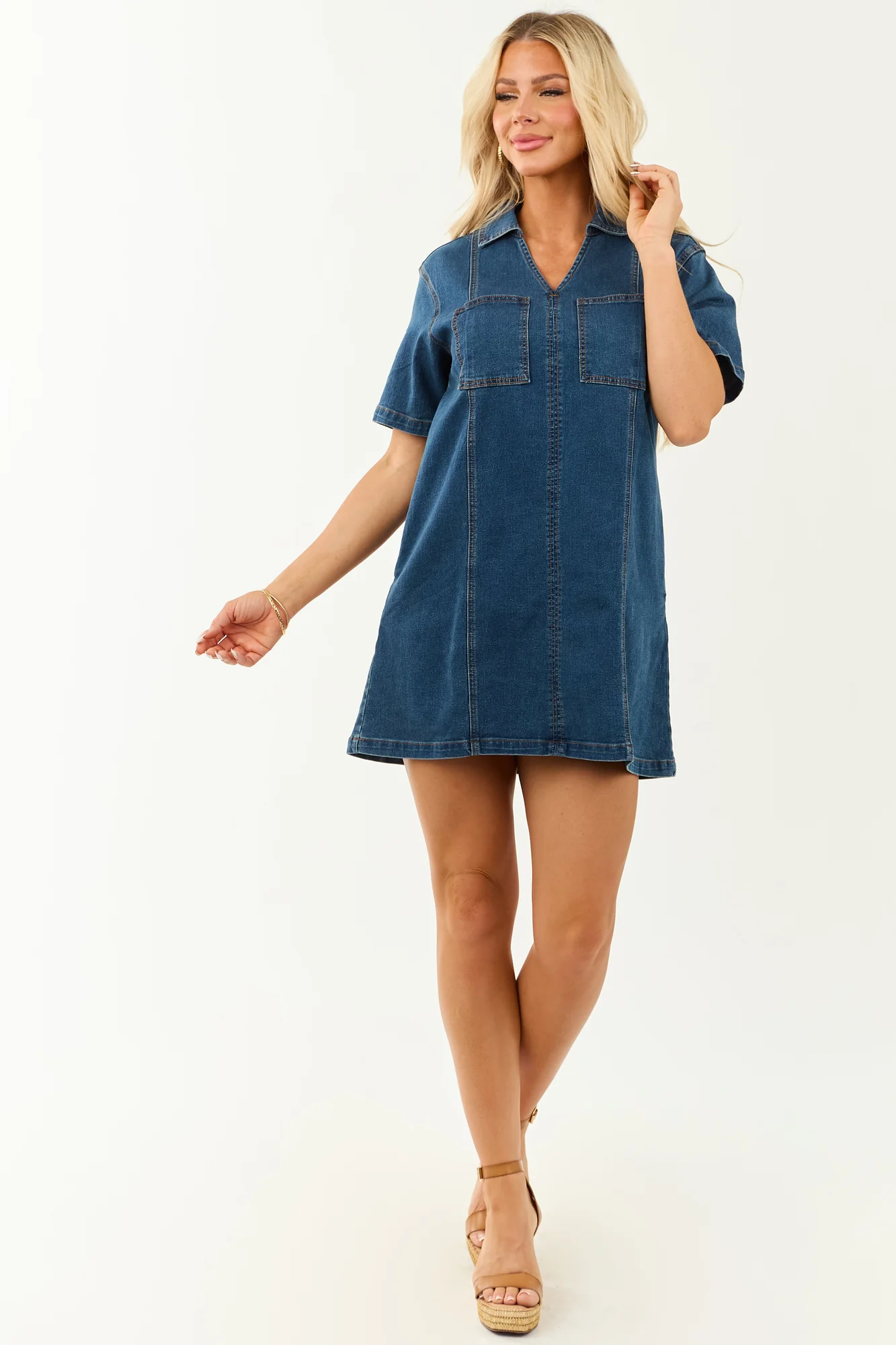 Effortlessly elevate your look with our stylish Denim Collared Shift Mini Dress. From coffee runs to casual dates, this dress offers a low-effort, high-impact option for every occasion. Featuring a shift fit design with stretchy denim, side and chest pockets, this dress combines comfort with functionality. Unlined and made of 75% Cotton, 23% Polyester, and 2% Spandex, it provides a flattering silhouette that fits large, so we recommend sizing down. Pair it with your favorite accessories for a chic ensemble that exudes confidence. Our model is wearing a size Small. Her measurements: Size 1, Height 57″, Bust 34″, Waist 26″.