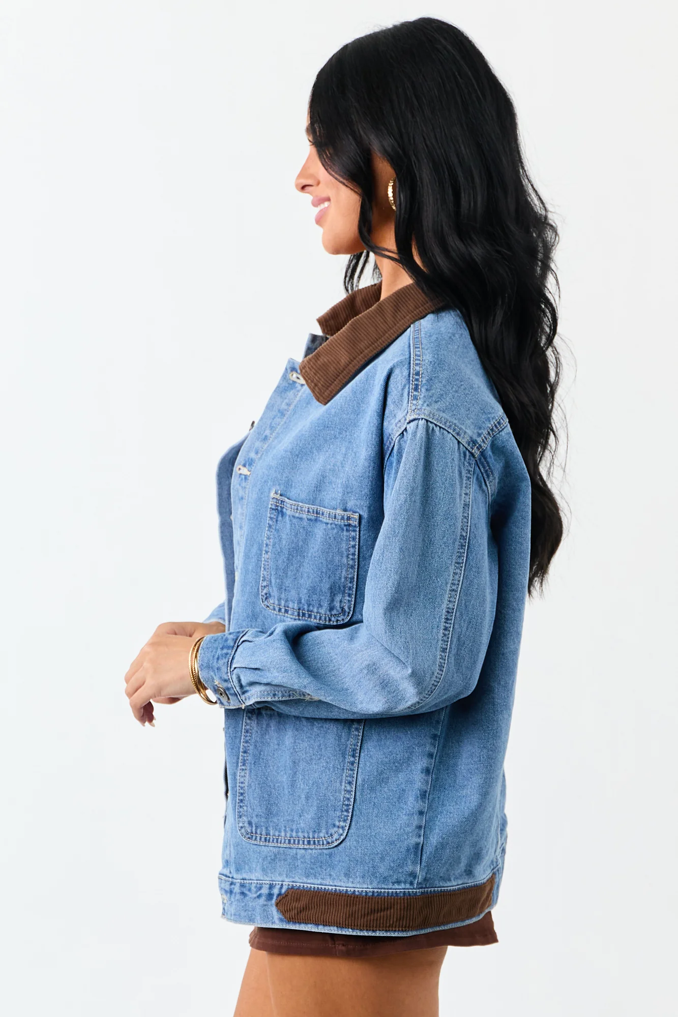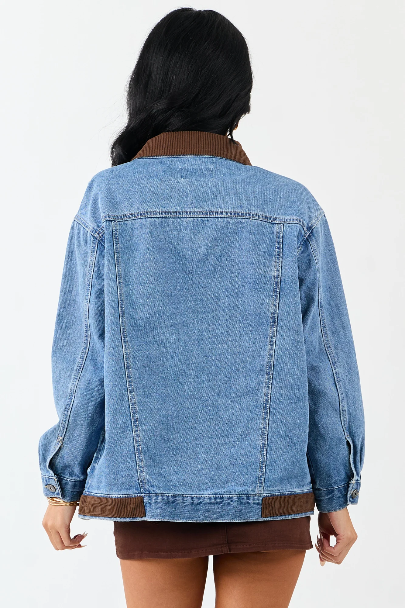 This denim jacket combines classic denim with a cozy corduroy collar, featuring a cute flap pocket and a relaxed wide fit for a stylish look. Made of non-stretchy 100% cotton with corduroy hem detail, button cuffs, and four pockets. Imported. Available in sizes S, M, and L. Model #1: Size 1, Height 55″, Bust 33″, Waist 24″. Model #2: Size 1, Height 59″, Bust 34″, Waist 26″.