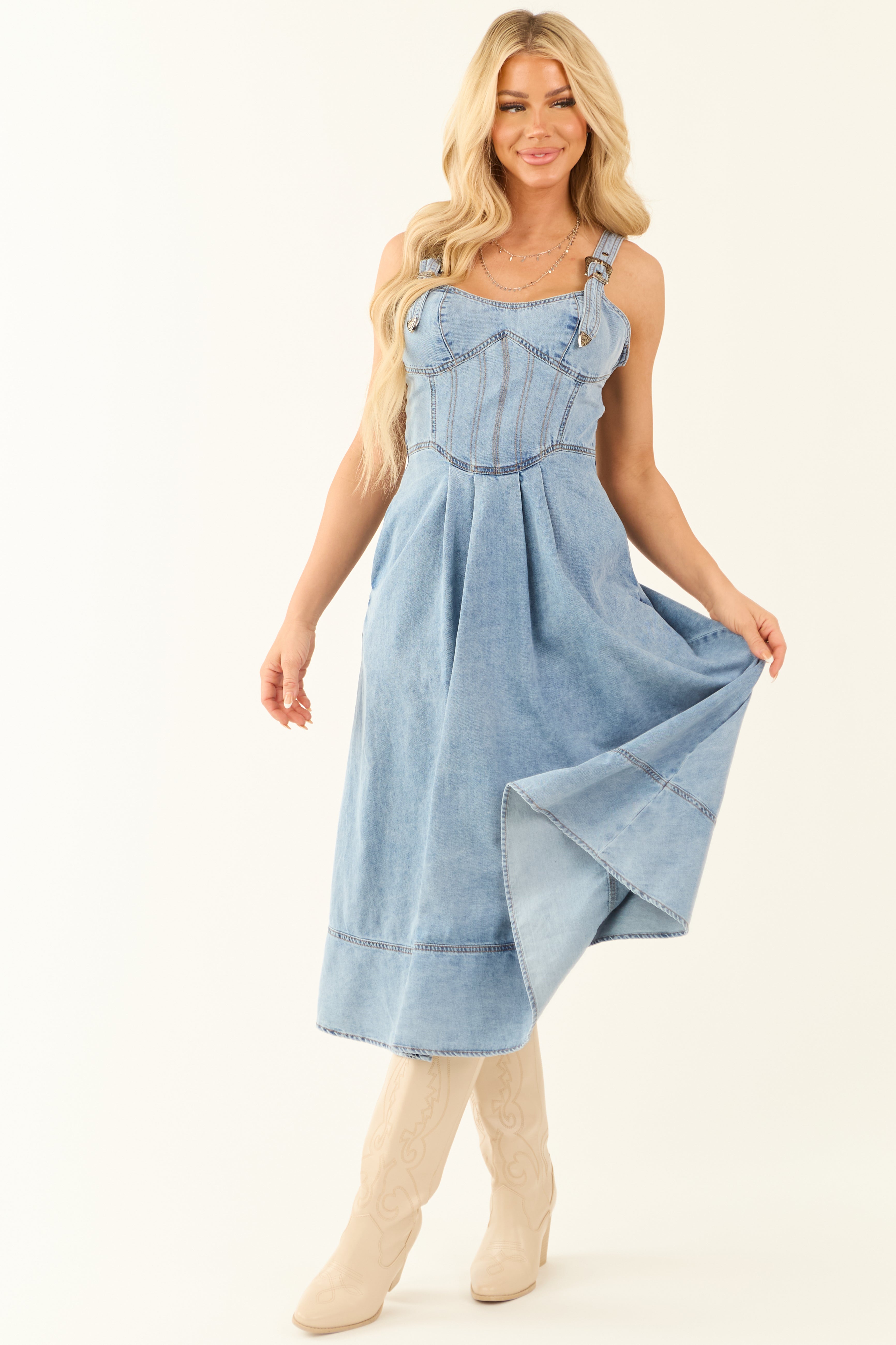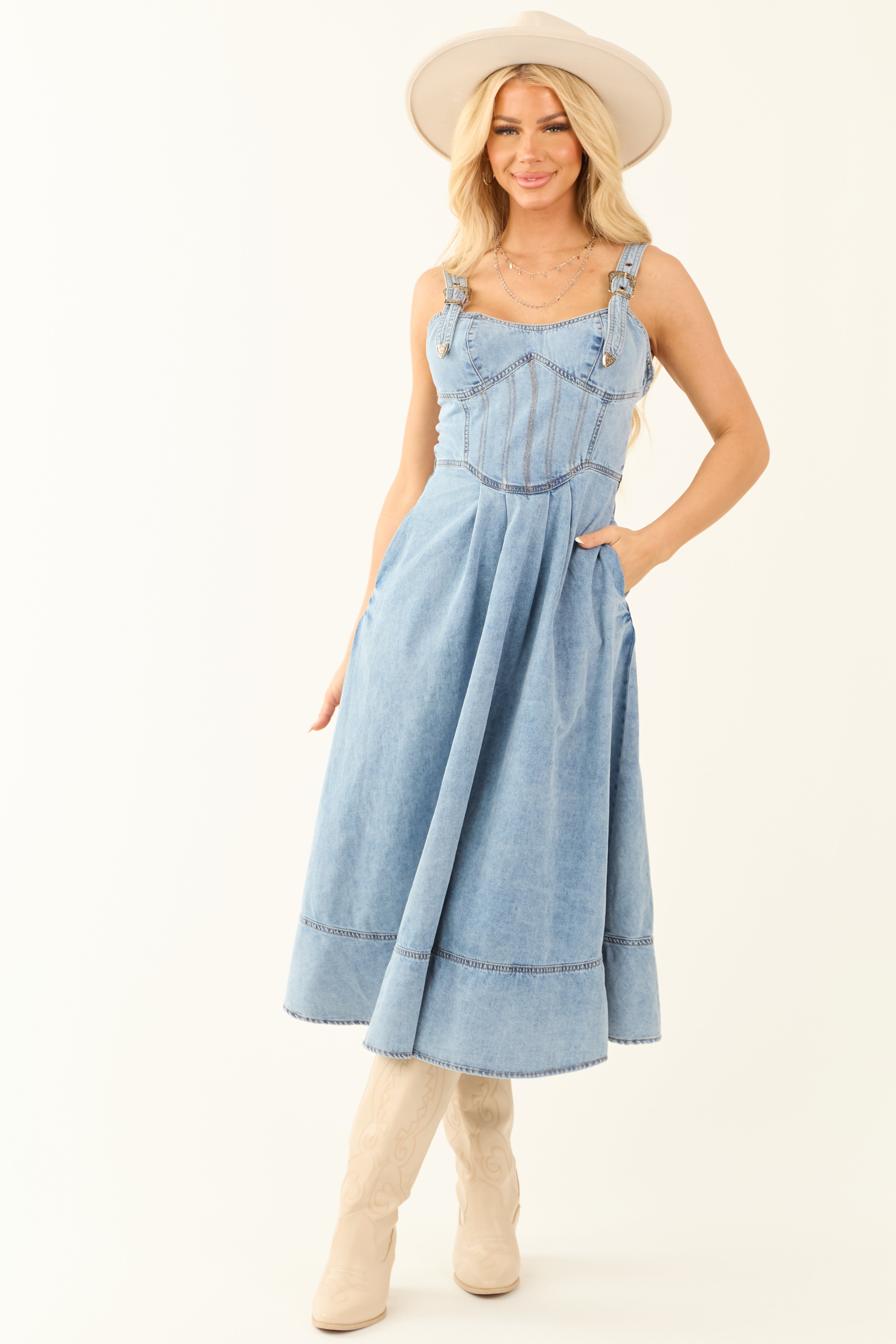 Stay stylish in this denim corset style midi dress with silver buckle straps and a sweetheart neckline. Made of 100% cotton, this semi-stretchy dress features princess seams for a flattering fit. The adjustable straps and back button closures add a touch of elegance. Perfect for a casual day out or a special occasion. Care instructions: Hand wash cold, do not bleach, line dry, iron on low heat. Model is 57″ tall, wearing a size Small.