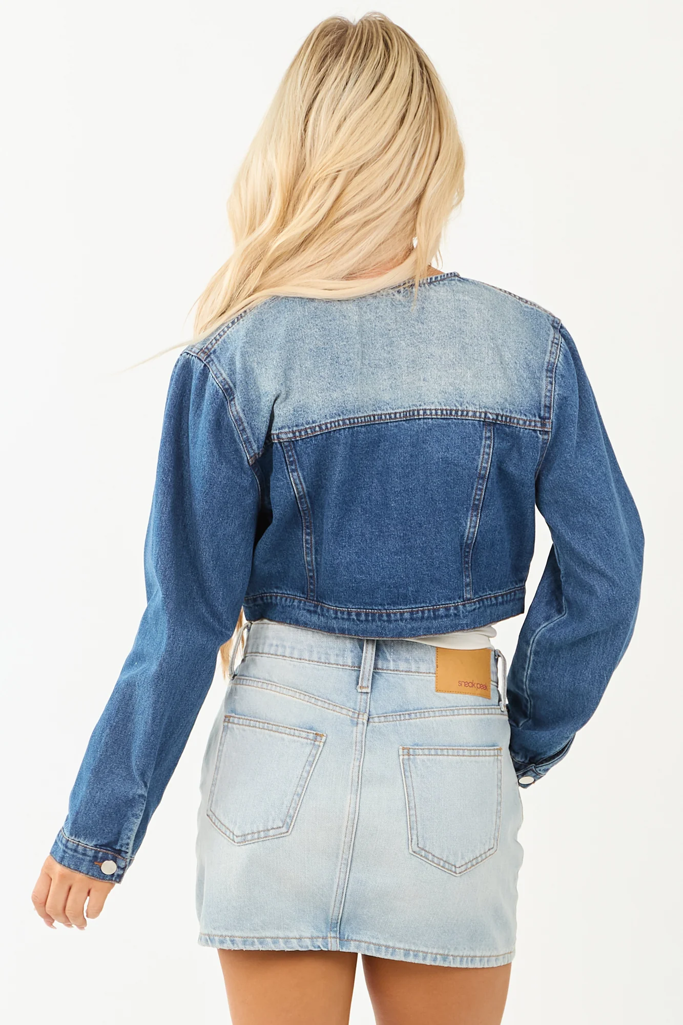 This Medium Wash Cropped Denim Jacket is a bold yet vintage addition to your wardrobe, perfect for a modern edgy vibe. Crafted from non-stretchy lightweight denim (100% Cotton), it features functional chest pockets with button closures, banded cuffs with button closure, and a cropped silhouette. Embrace the edgy look with this versatile piece that goes well with various outfits. Model is wearing a size Small.