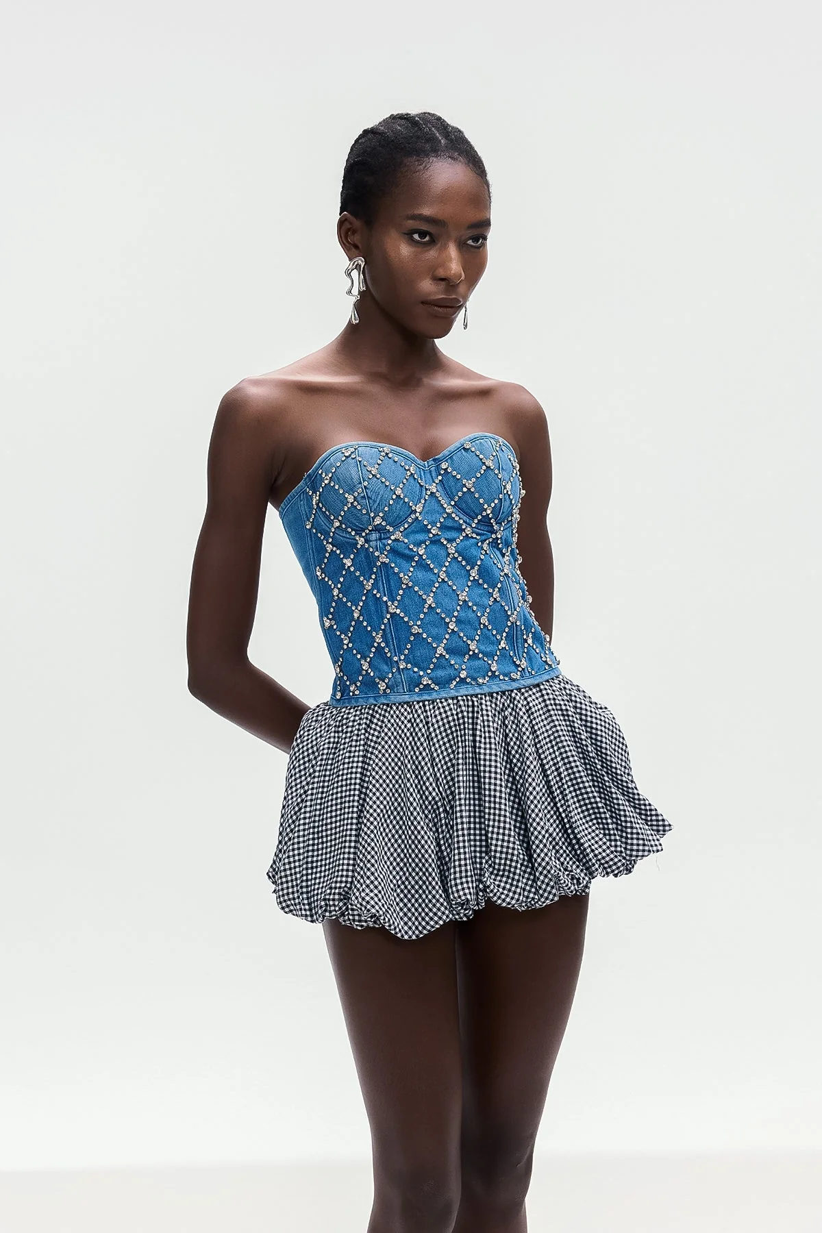 Elevate your wardrobe with the Denim Crystal Embellished Strapless Top in Blue, expertly crafted to combine edgy denim with refined sparkle. This elegant strapless top offers a sleek silhouette and crystal embellishments for a touch of sophistication and glamour. Whether for evening events or stylish daytime outings, this top exudes boldness and elegance with meticulous tailoring and attention to detail. The non-stretch design ensures a perfect fit. Clean with a gentle machine wash. Please note, color may vary due to lighting on images.