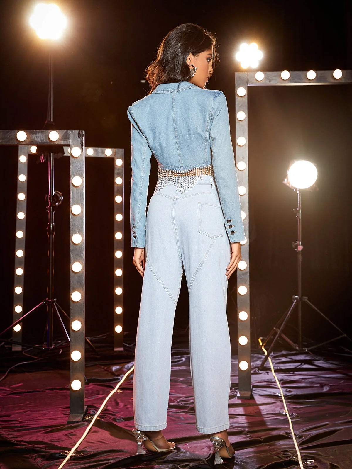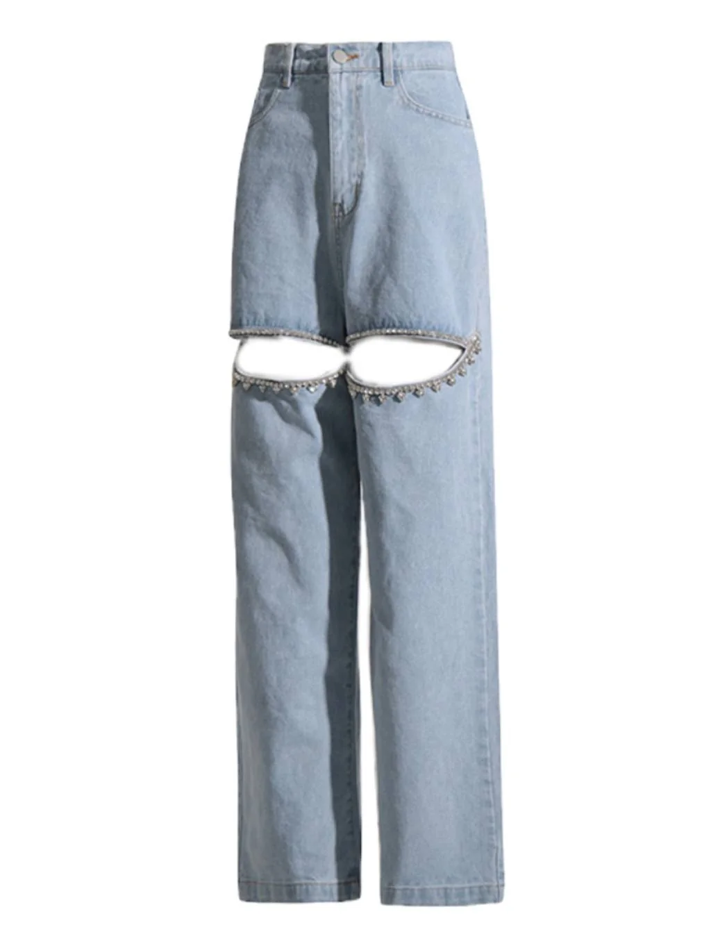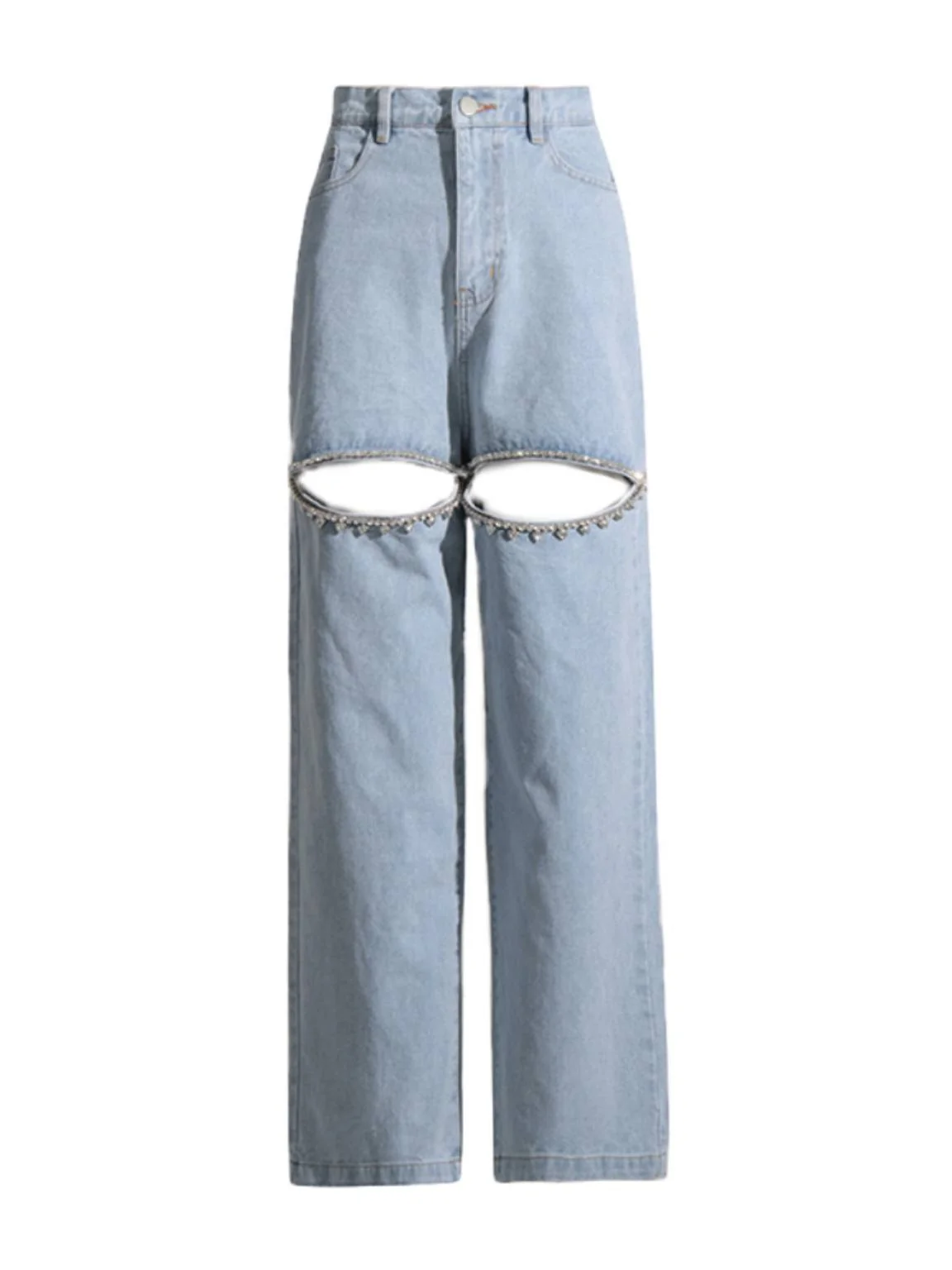 Experience style and sophistication with our Denim Cutout Pants with Embellishments. Crafted from high-quality polyester, these pants feature intricate cutout details and a classic 5-pocket design for a timeless appearance suitable for any dressy occasion. Hand wash cold for easy care. Please note that slight color variations may occur due to lighting. Get this elegant pair for a night out or special events. Available sizes: S, M