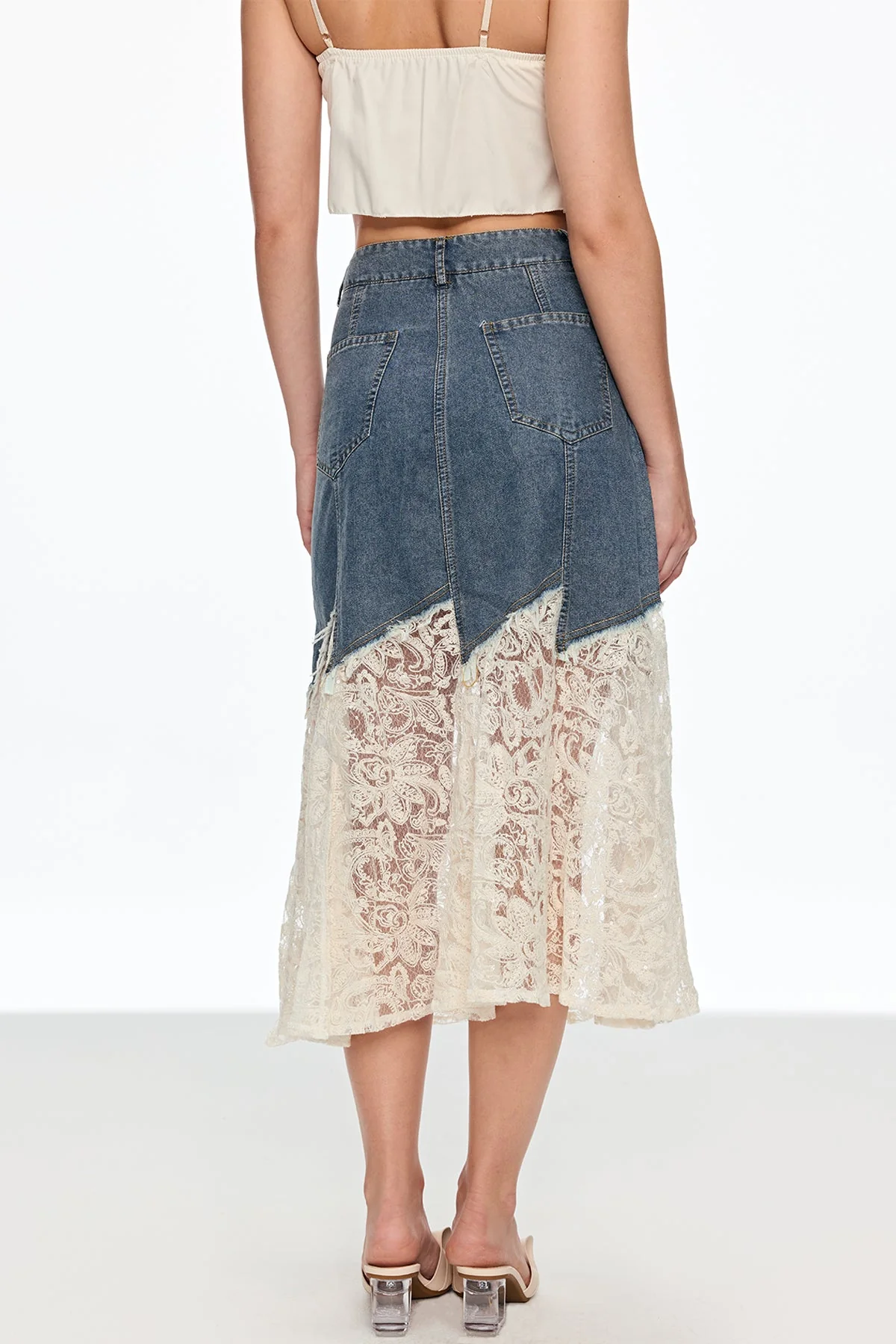 Elevate your wardrobe with the timeless sophistication of the Denim Lace Midi Skirt. Combining classic denim durability with delicate lace detailing, this skirt offers a versatile option for both casual and refined looks. Enjoy the expertly crafted silhouette that exudes elegance and comfort. Explore a unique fusion of textures showcasing the finest craftsmanship. The midi length allows for various styling options. Non-stretch fabric. Care: Gentle machine wash. Color may vary due to lighting. Add this exquisite piece to your collection today!