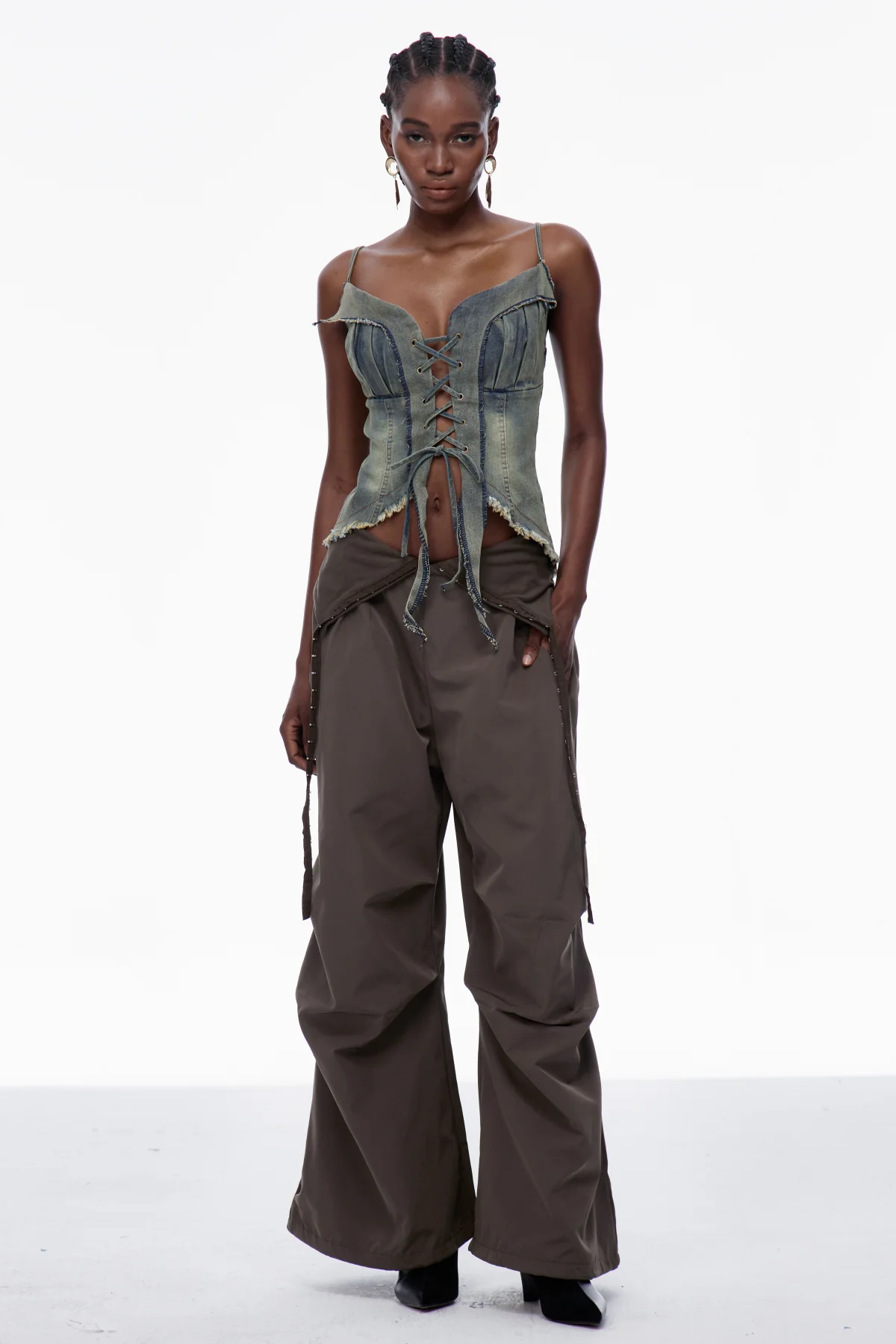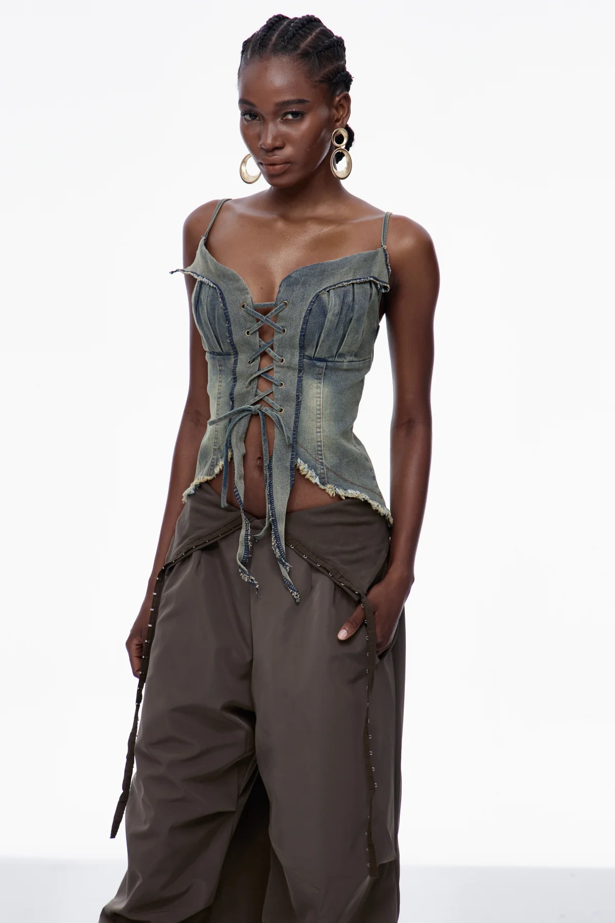Elevate your casual wardrobe with the Denim Lace Up Fringe Sleeveless Top in blue. This top combines classic denim durability with urban edge style, featuring a lace-up front for adjustable fit and dynamic fringe detailing. Crafted with expert attention to detail, it offers comfort and a distinctive look suitable for layering or wearing solo. Whether youre dressing up or down, this top adds a touch of flair to your outfit. Stretch Factor: Non-Stretch Clean: Gentle machine wash Due to lighting variations, color may appear slightly different in person.