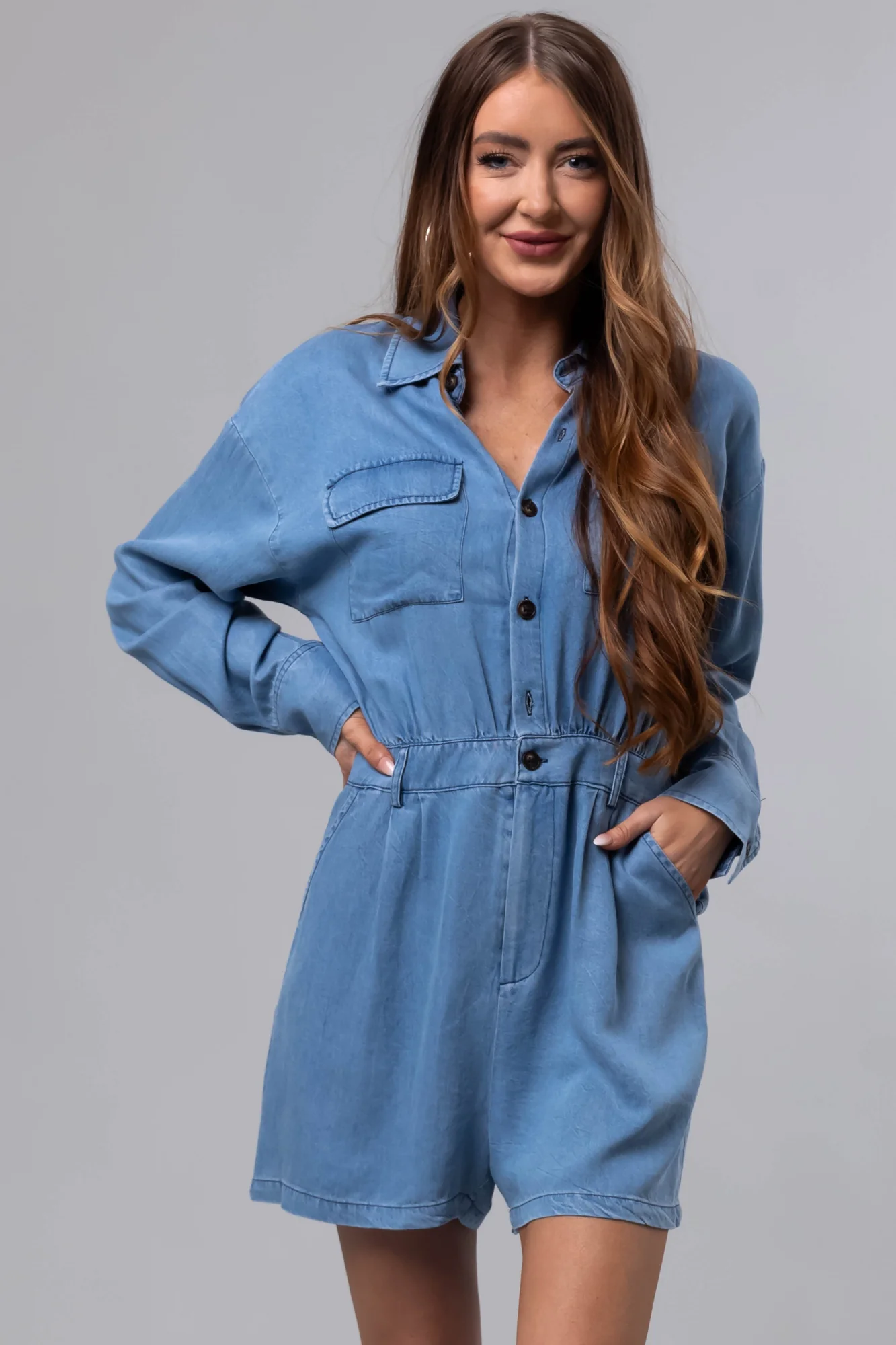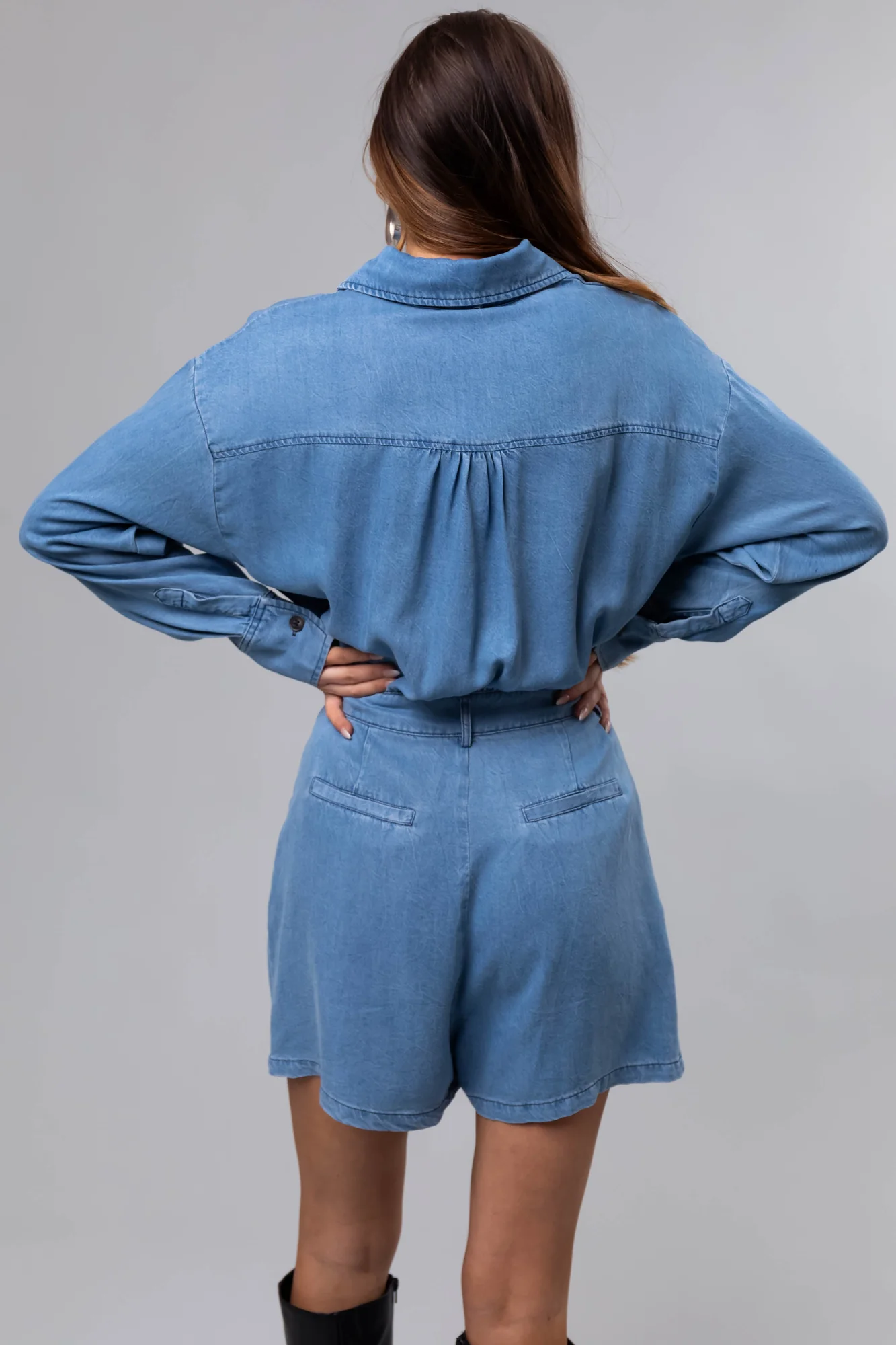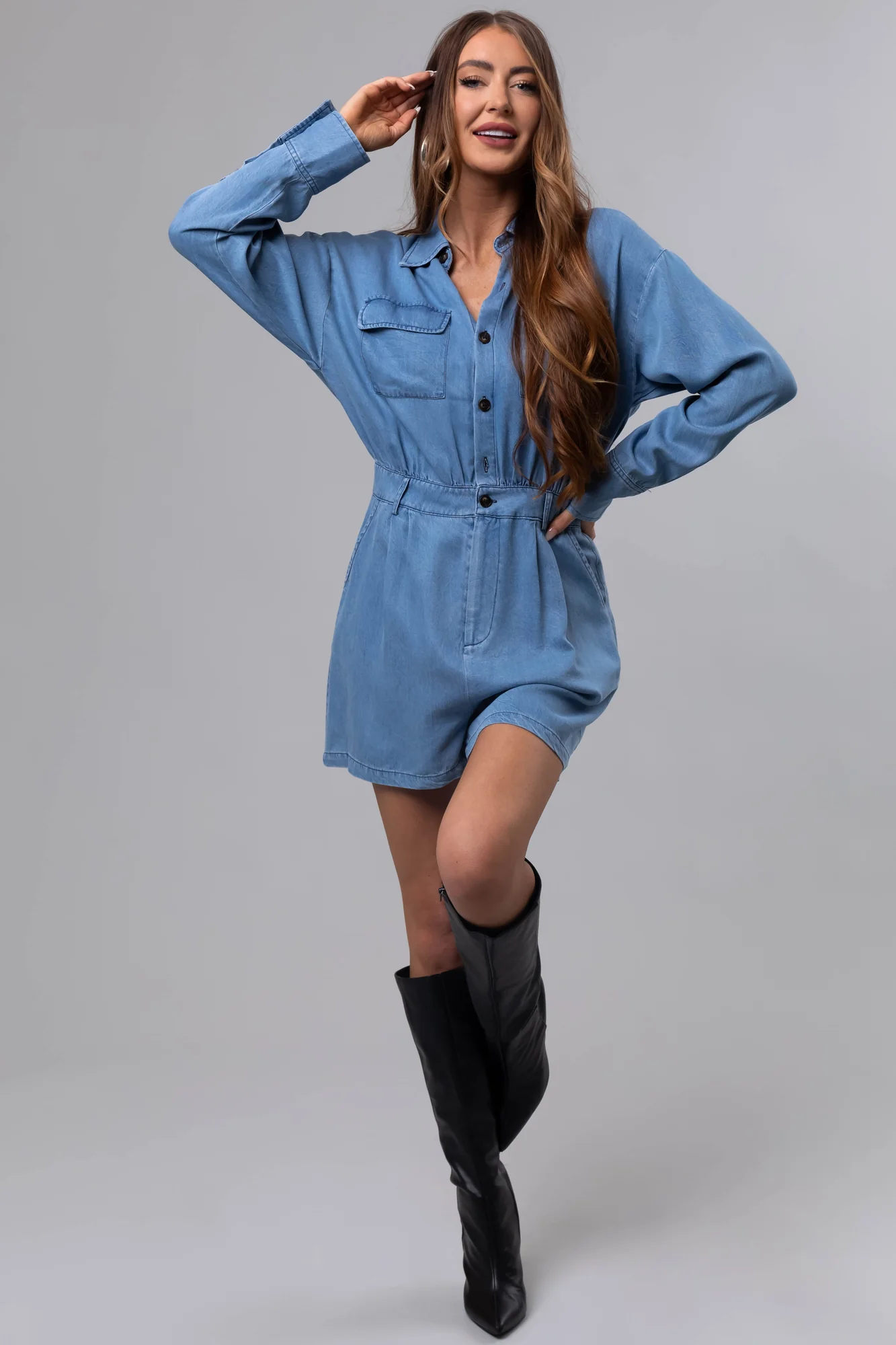 Upgrade your wardrobe with this denim long sleeve romper featuring a collared neckline, belt loops, decorative back pockets, and side/front pockets. Made of non-stretchy lightweight denim, this romper offers comfort and style. Perfect for casual and daytime occasions, it is imported and unlined. Care instructions: Hand wash cold, wash separately, do not bleach, flat dry, iron if needed. Model is wearing a size Small, with a size 2 profile, 58″ height, 32″ bust, and 25″ waist.