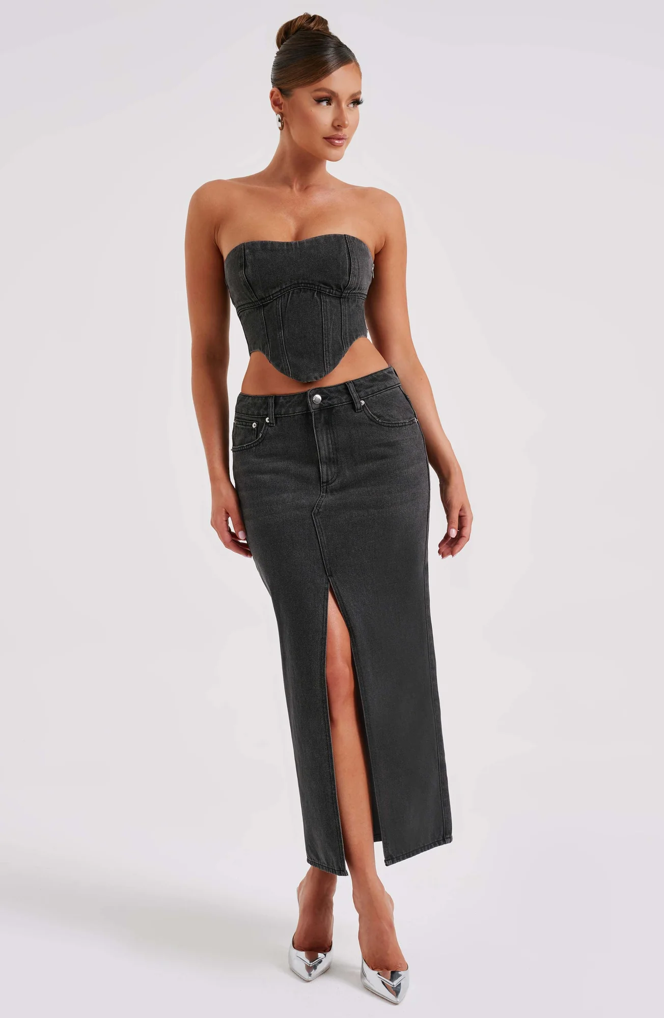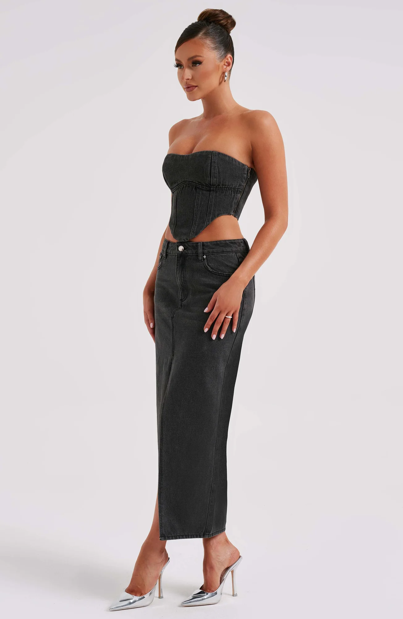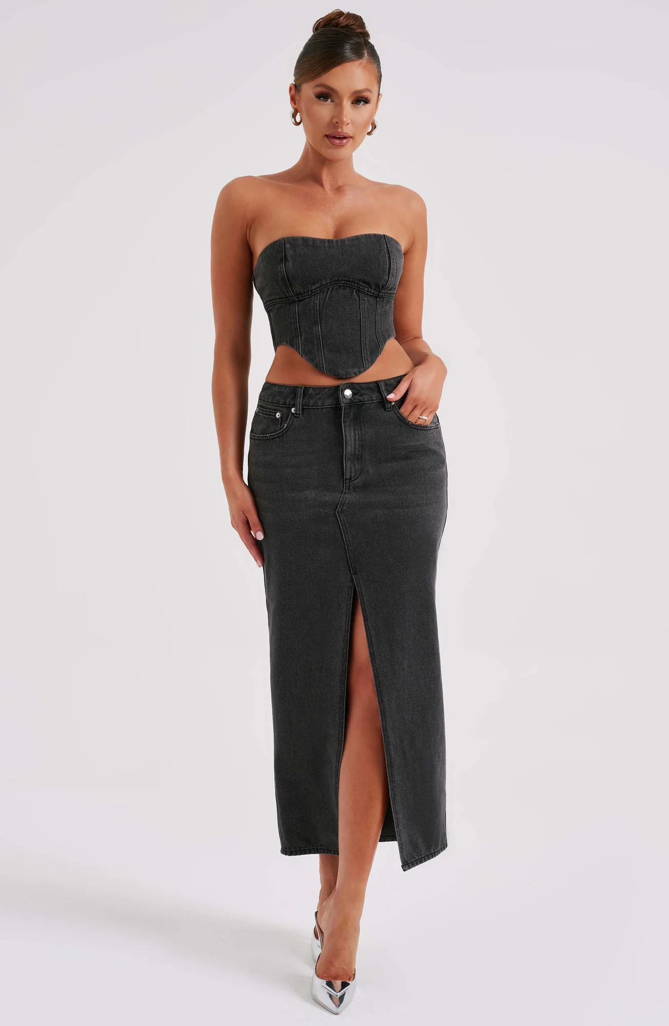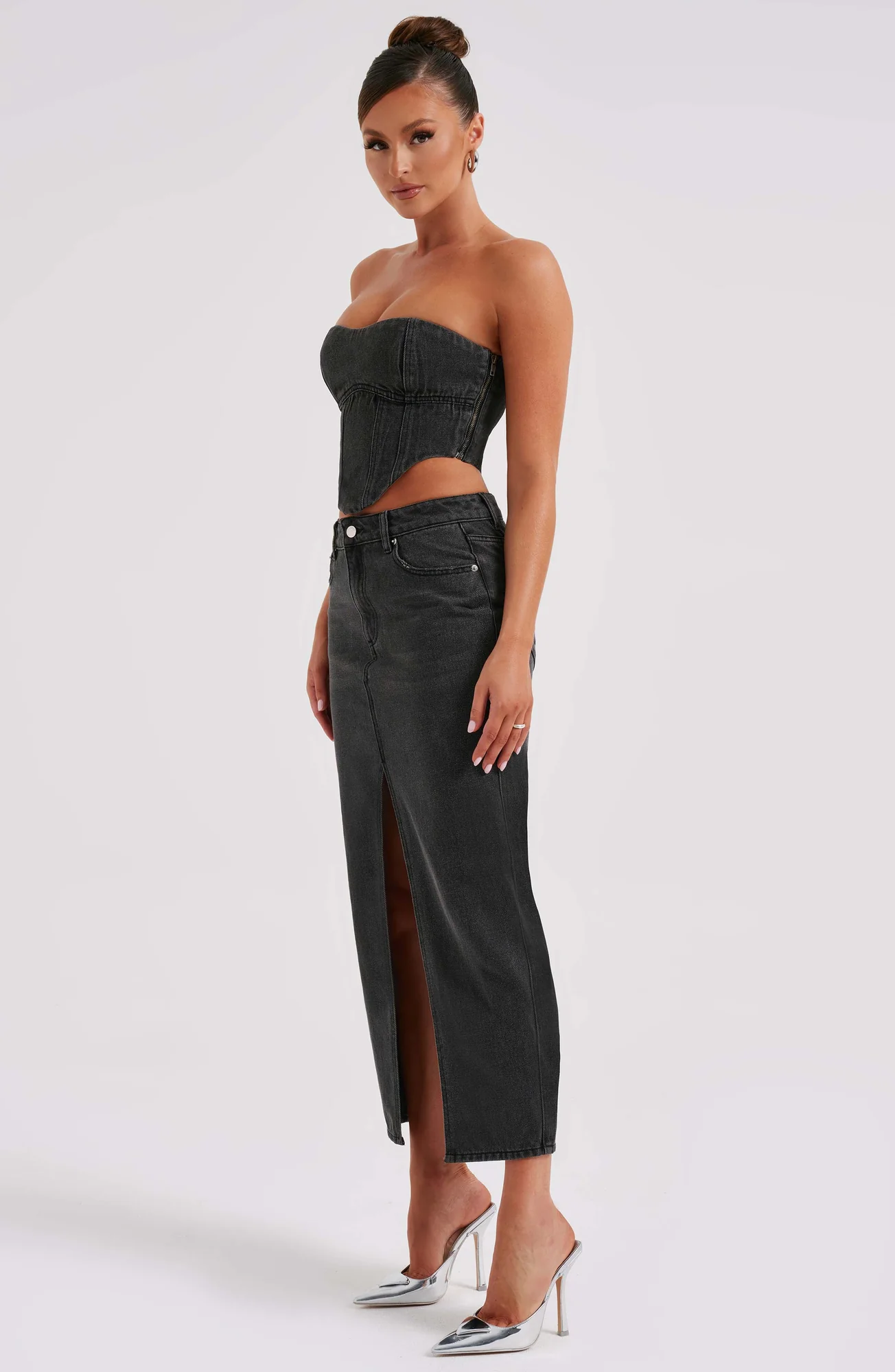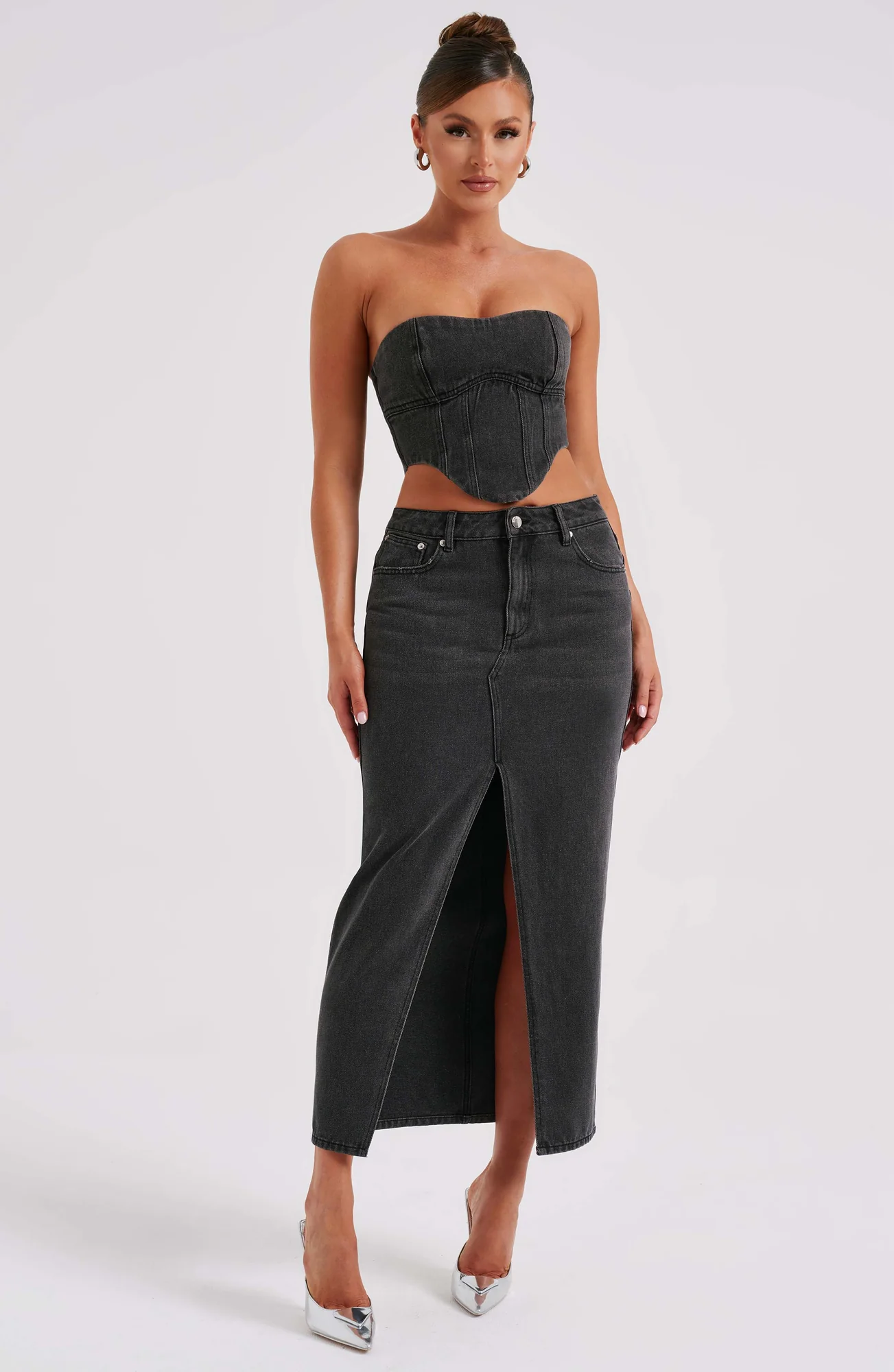 Elevate your style with the versatile Denim Maxi Skirt in Black. Featuring a high waist, middle split, button and zip fastening, this skirt is perfect for any occasion. The denim fabric and maxi length add a touch of sophistication to your look. Model is wearing size XS. Explore our collection for more trendy skirt options!