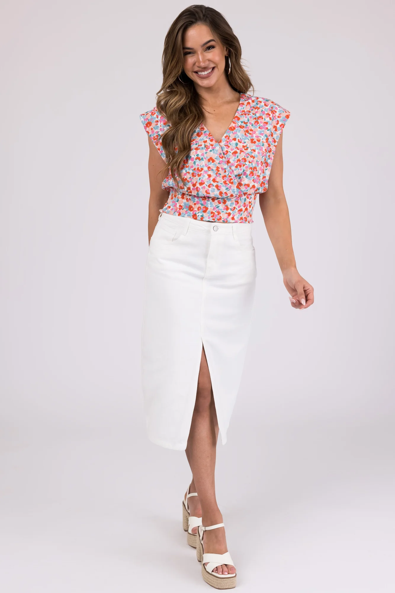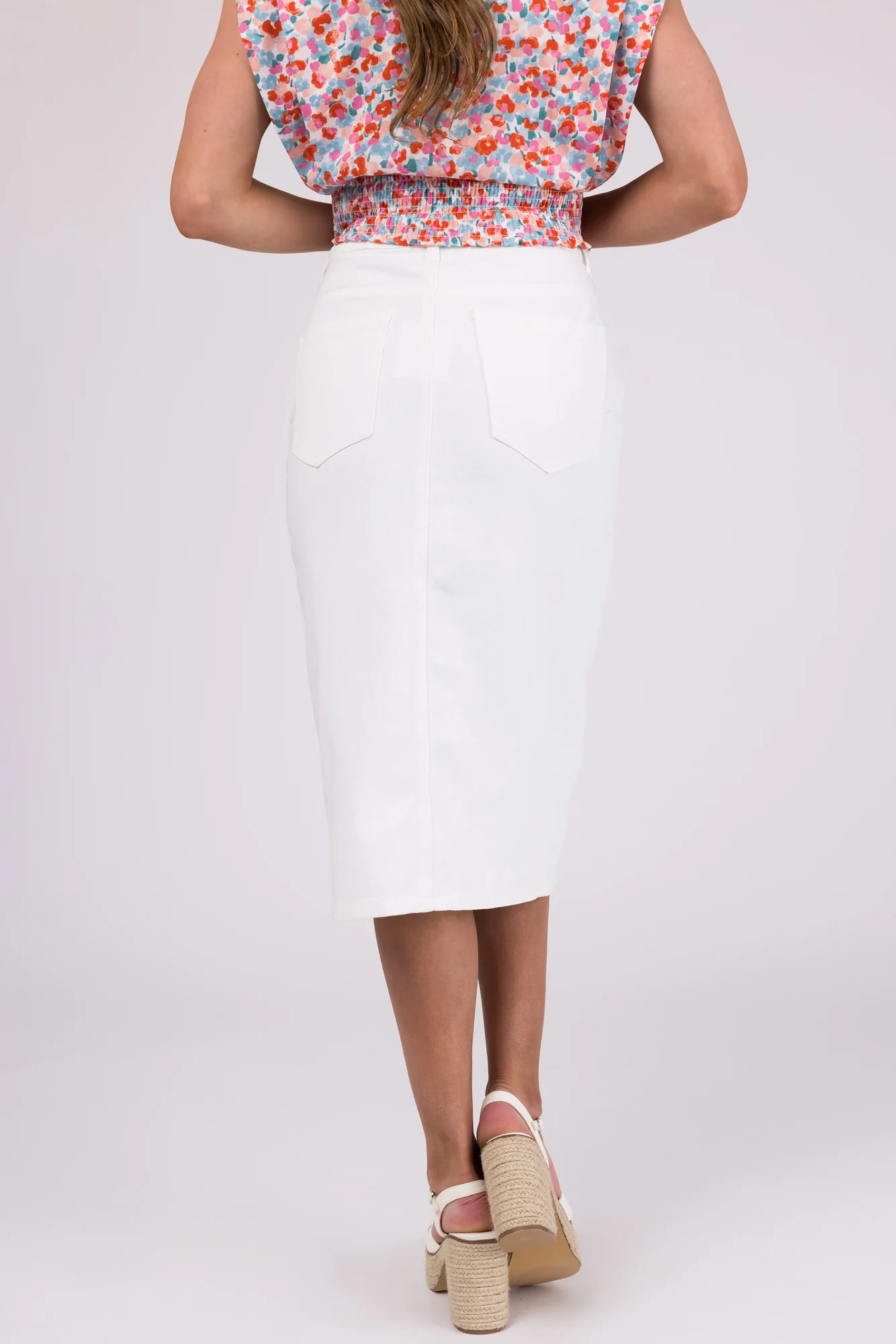 Enjoy timeless style with our Denim Midi Pencil Skirt in White. Available in sizes S, M, L with waist measurements of 27″, 28″, 29″. Crafted from non-stretchy 100% Cotton, it features front slit, belt loops, and front and back pockets. Pair with your favorite top for a versatile look. Imported. Care: Hand wash cold, do not bleach, hang dry. Model in size Small. Model height: 57″, bust 34″, waist 26″. Embrace confidence with this wardrobe essential!