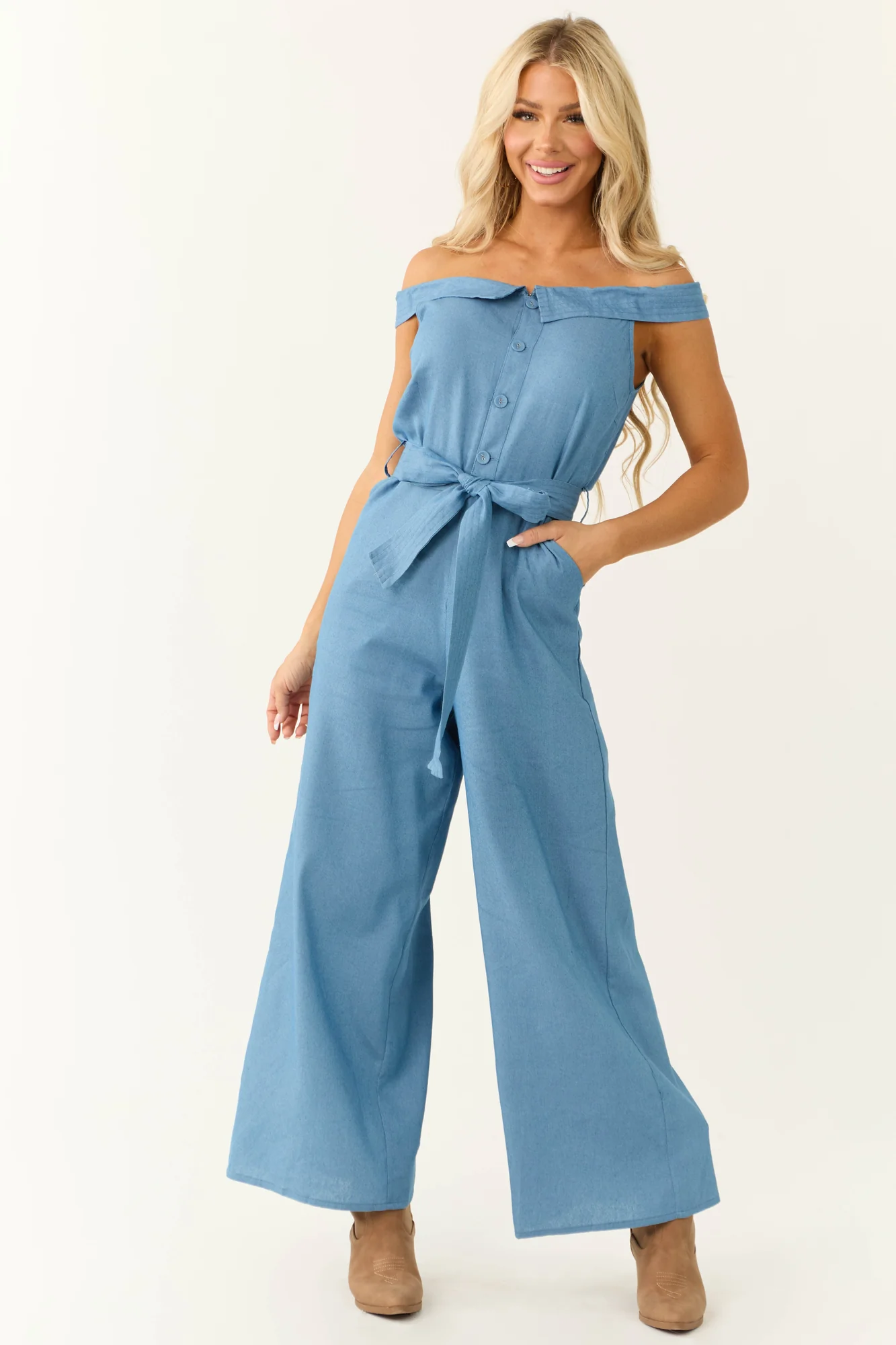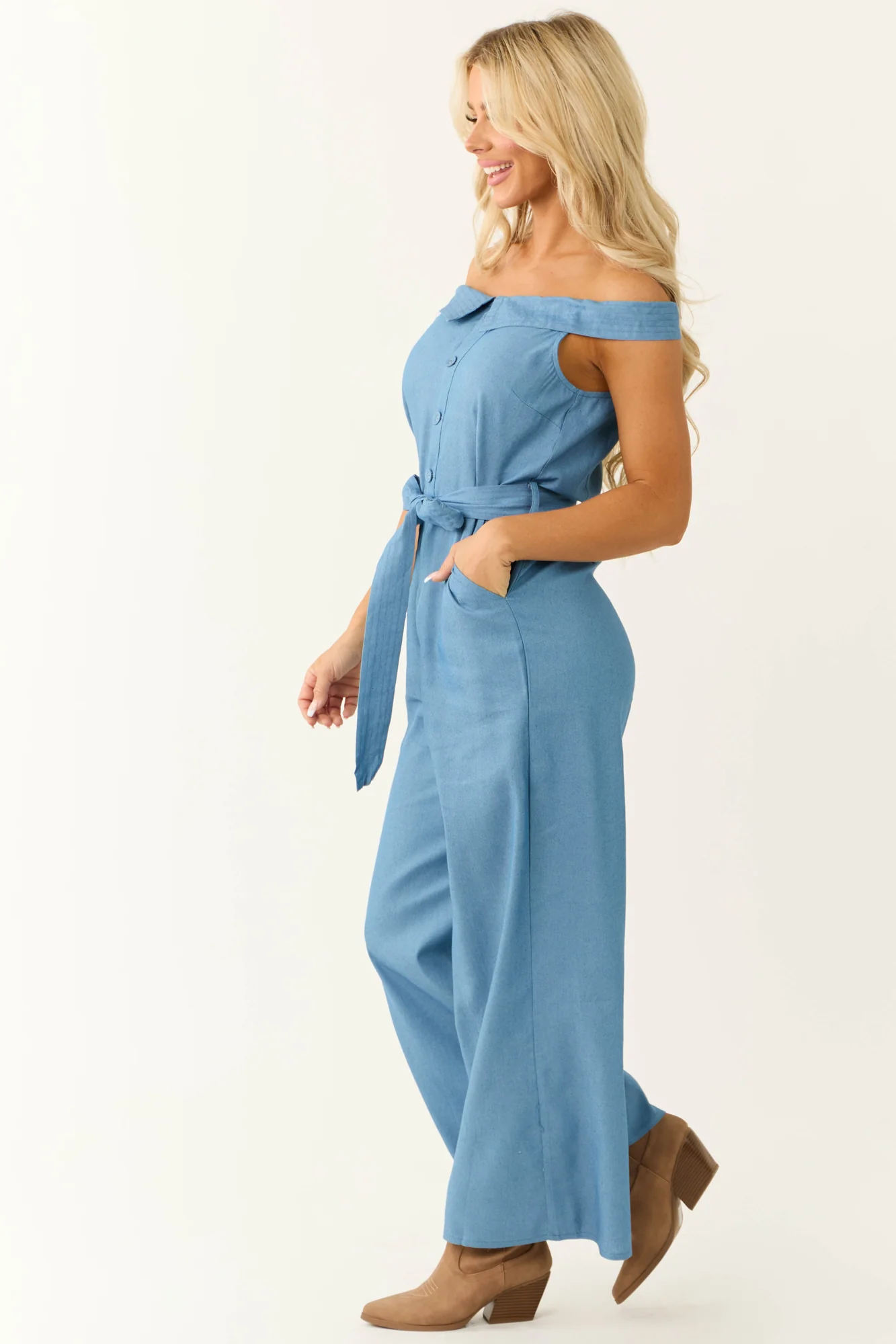 This versatile denim off-shoulder jumpsuit combines style and comfort. Featuring fold-over short sleeves, a button-down torso, zip fly, and a removable waist tie for a customizable fit. Made of 65% cotton and 35% polyester for a non-stretchy yet comfortable feel. It includes convenient side pockets and is unlined. Perfect for daytime occasions, this jumpsuit is a wardrobe essential. Care instructions: Hand wash cold, iron on low. Model is 57″ tall, wearing size Small. Bust: 34″ Waist: 26″