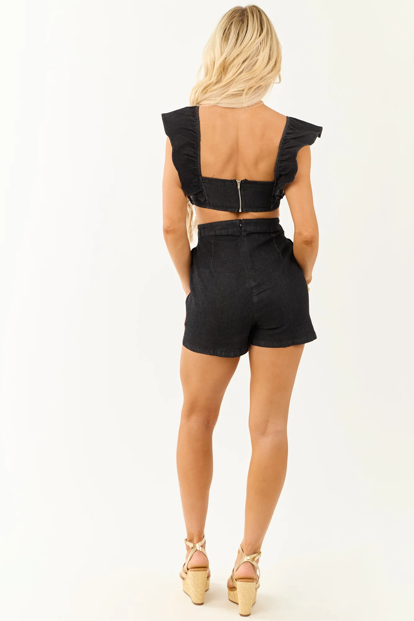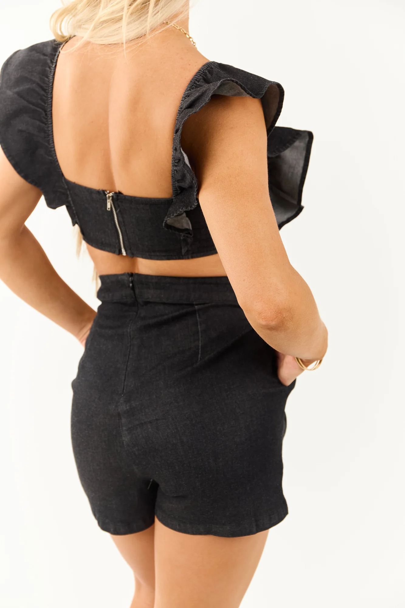 Tags: Day-to-Night Outfit, denim romper, open back, Ruffled Cap Overlay