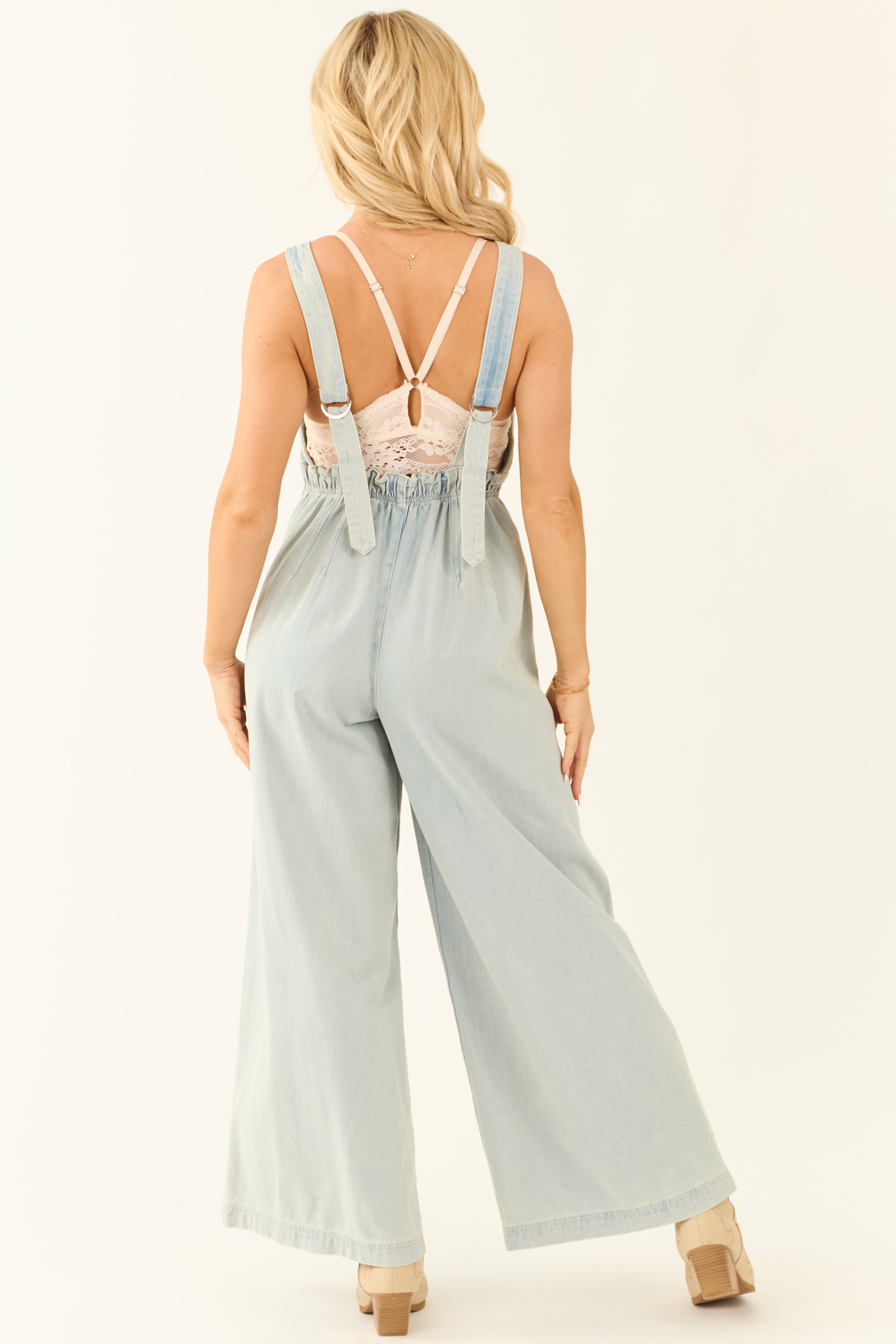 Stay fashionable and comfortable in this denim wide leg jumpsuit. Featuring an overalls style fit, adjustable straps, elastic back waistband, and front seam details. Made of non-stretchy denim with waist pleating and pockets. Crafted from a blend of 48% Cotton, 36.1% Viscose, 15.9% Polyester. Perfect for spring and summer, this jumpsuit is unlined and ideal for a casual yet trendy look. Available in sizes S, M, and L.