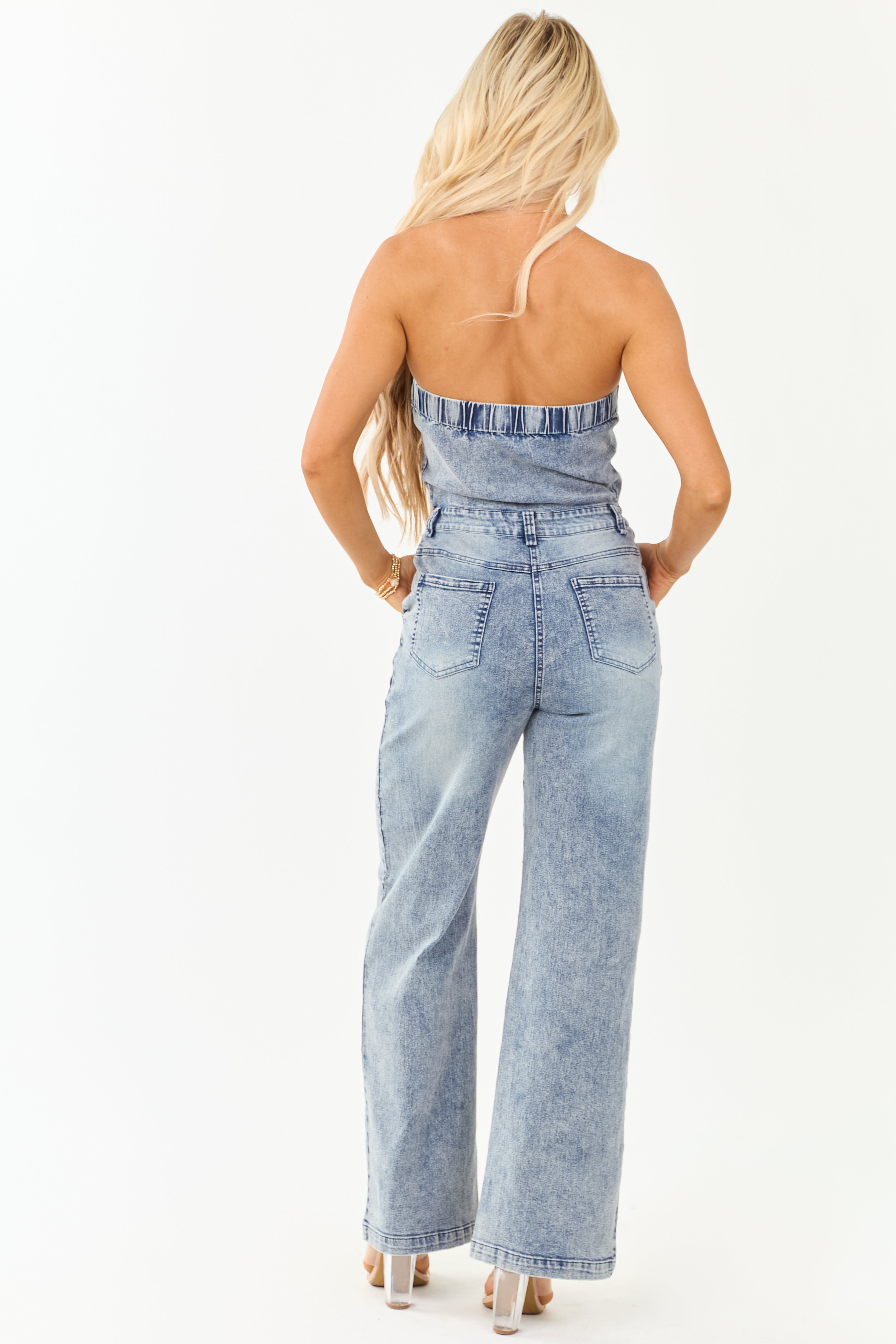 This stylish Denim Strapless Wide Leg Jumpsuit in baby pink is versatile for busy days and relaxed evenings. Crafted from stretchy denim, it features a classic wash and a figure-hugging fit. The jumpsuit is true to size, snug at the bust, and comfortable at the waist. Adorned with belt loops, 4 pockets, and a zip-up front with hook and eye closure, this garment boasts both fashion and functionality. The elastic back neckline and adhesive strip at the bust prevent slippage. With a 30inseam, it is made of 70% Cotton, 28% Polyester, and 2% Spandex with 100% Cotton pocket lining. Imported. Model is wearing a size Small.