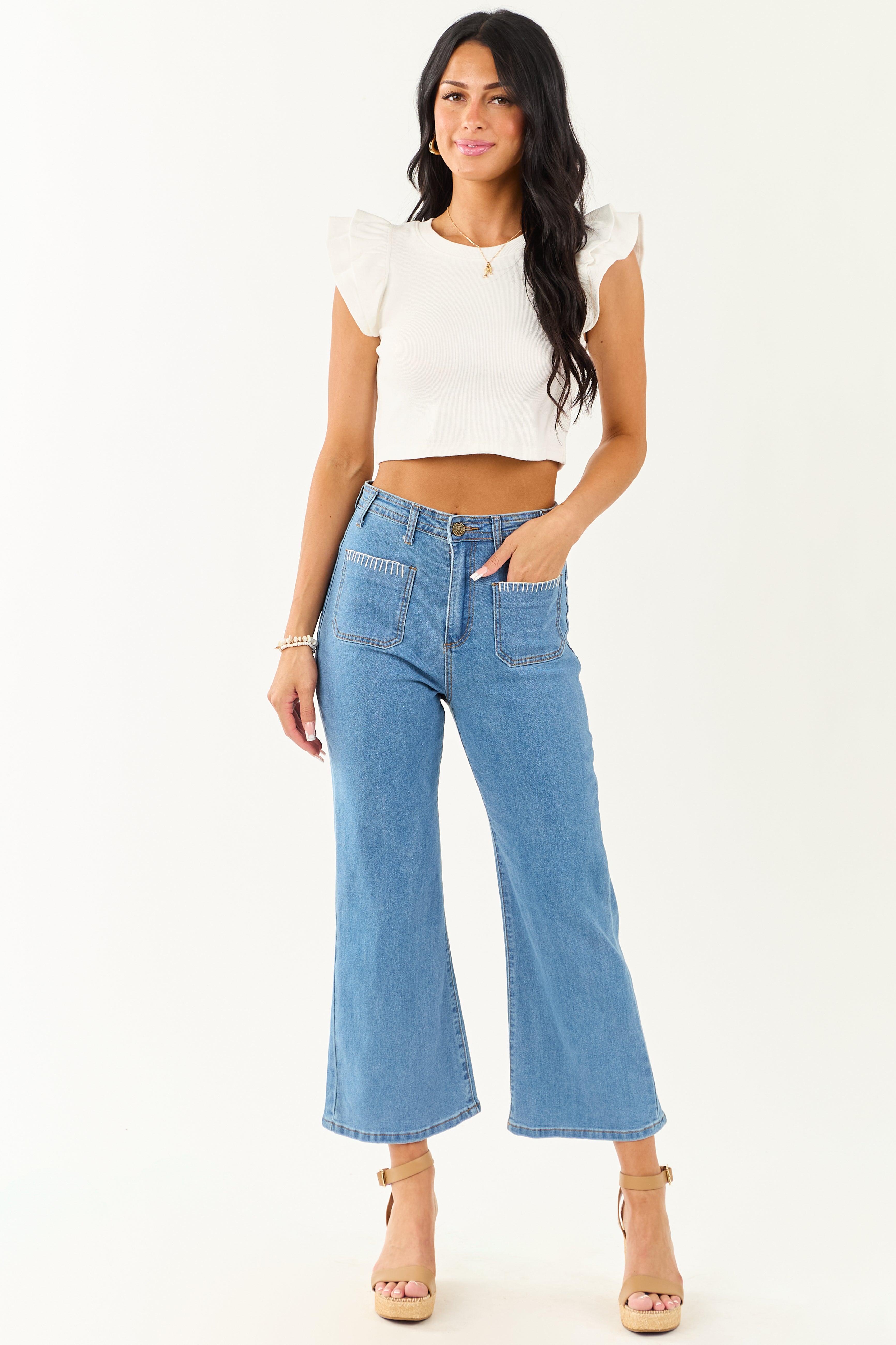 Experience the perfect blend of style and comfort with our Denim Stretchy Crop Straight Pants in Medium Blue Wash. Crafted from a blend of 55% Cotton, 34% Polyester, 10% Viscose, and 1% Spandex, these pants feature adorable stitched patch pockets, a high-rise fit, and a stretchy design that hugs your curves. The high-rise front (12″) and back (15″) add a modern touch, while the patch pockets with white stitching and zipper fly with button closure elevate the look. These versatile pants come in sizes Small (Waist: 26″, Hip: 33″, Inseam: 25.5″), Medium (Waist: 28″, Hip: 34.5″, Inseam: 26.5″), and Large (Waist: 30″, Hip: 36″, Inseam: 27.5″). Embrace true size fittings and stand out in style. Imported.