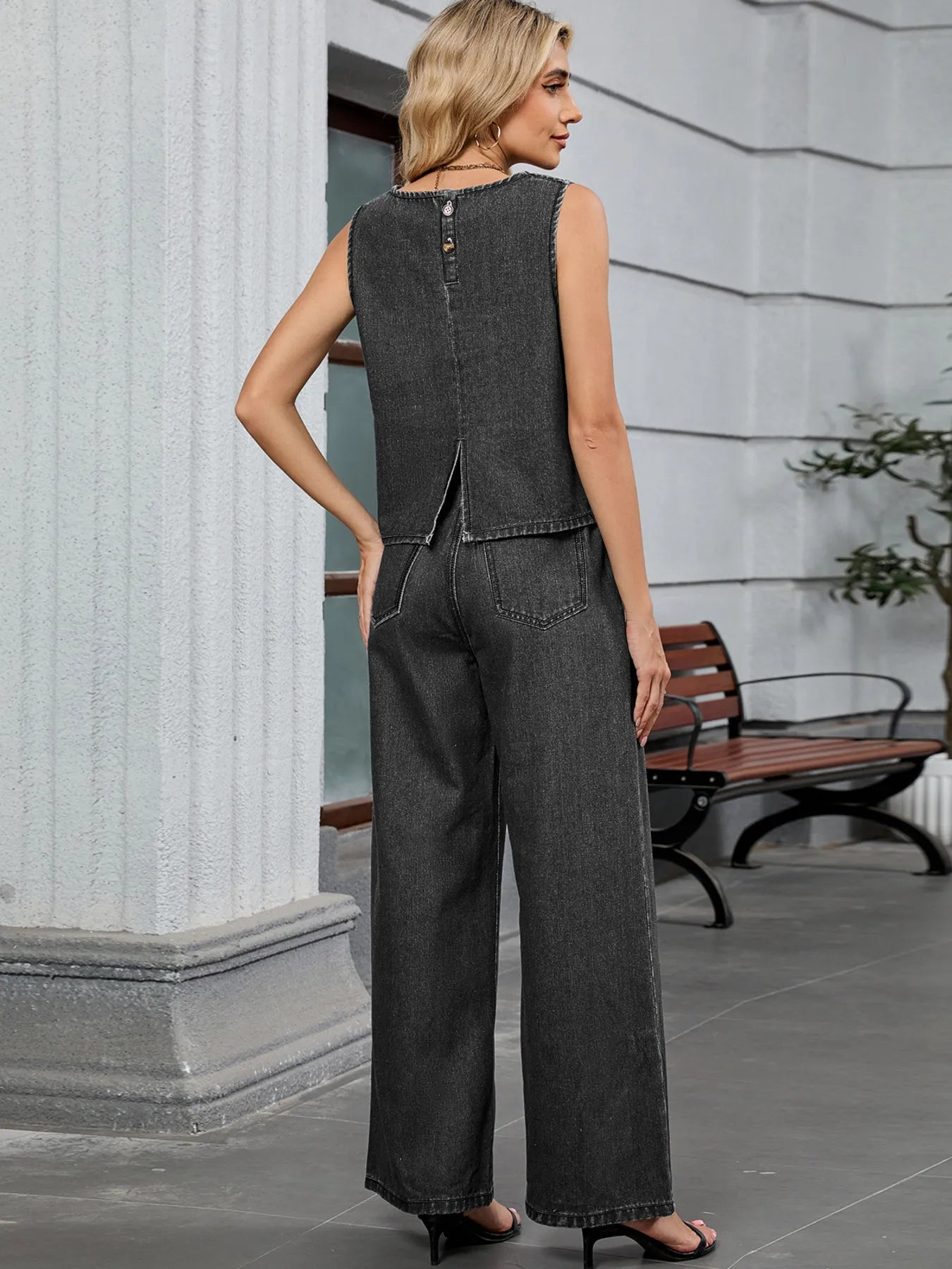 Enjoy the stylish Denim Tank Top and Pants Set featuring pockets, with a slightly stretchy fabric blend of 95% rayon and 5% polyester for maximum comfort. This two-piece set includes top and bottom measurements for sizes S, M, L, and XL. Care instructions: Machine wash cold, tumble dry low. Imported.