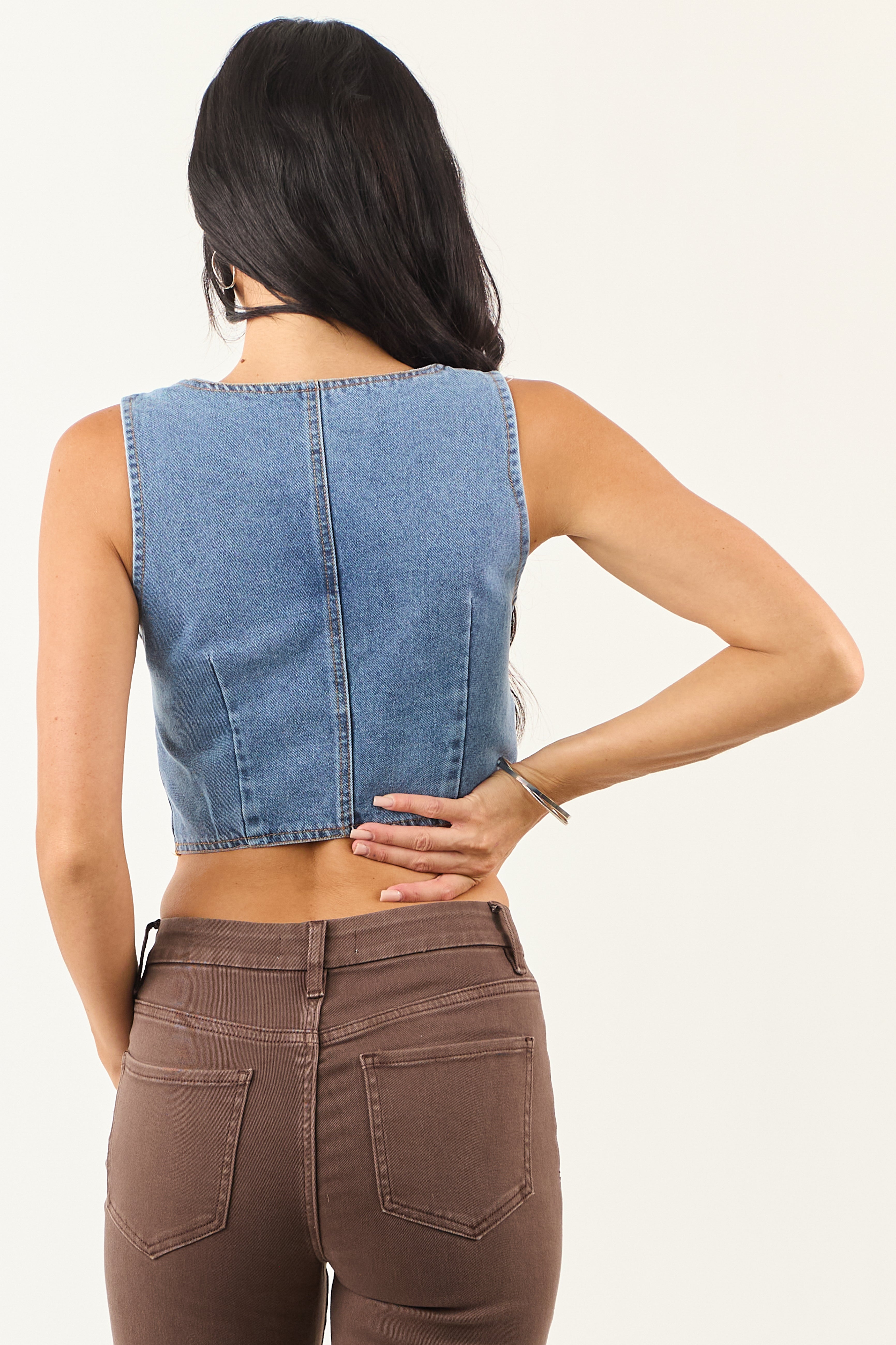 Discover the modern twist on a timeless denim top with our Medium Wash Zip Up V Neck Denim Vest. Crafted from non-stretchy denim, this piece features a flattering deep V neckline and a playful shaped hem for a trendy look. Slightly cropped with an adjustable front zipper for added style and functionality. Made from 65% Cotton and 35% Polyester. Imported. Available in sizes Small, Medium, and Large. Ideal for casual outings or layering with your favorite tops, this vest is a versatile addition to your wardrobe. Model is wearing a size Small with the following measurements: Height 59″, Bust 34″, Waist 26″.