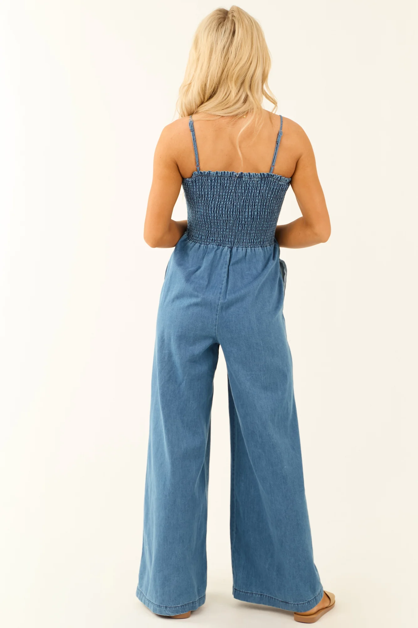 This denim jumpsuit features a flowy wide leg design, square neckline, adjustable spaghetti straps, and smocked elastic torso. Made from non-stretchy chambray denim with 2 side pockets and lined pockets for a stylish look. Crafted with 96% Cotton and 4% Polyester with 100% Cotton lining. Imported. Care instructions: Hand wash cold, wash separately, do not bleach, hang dry, iron low if necessary, do not dry clean. Available in sizes S, M, and L. Fits true to size.