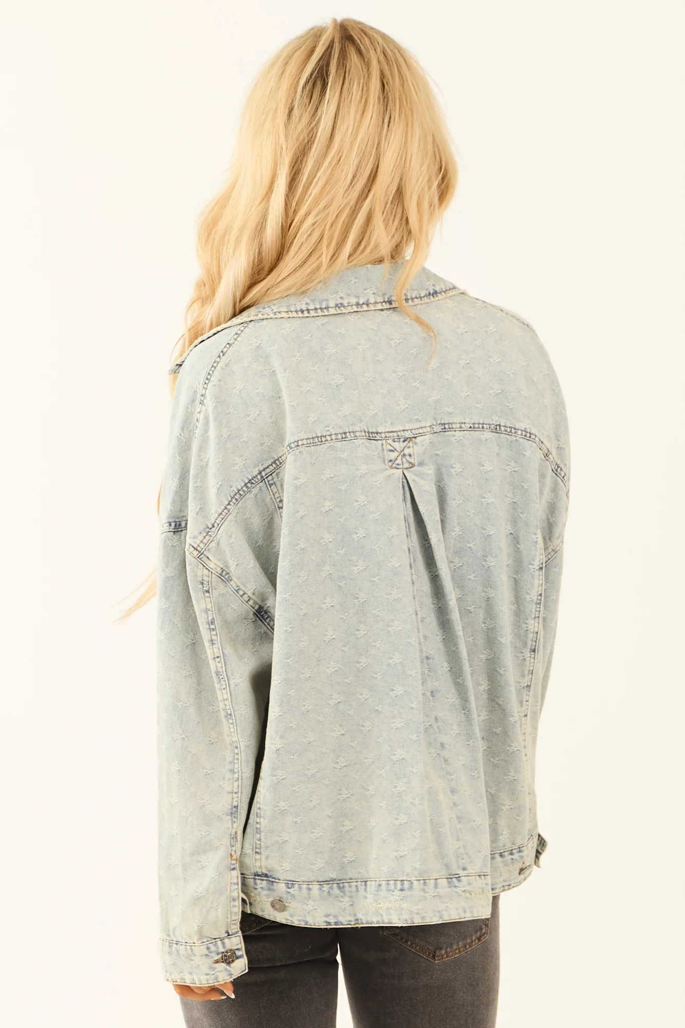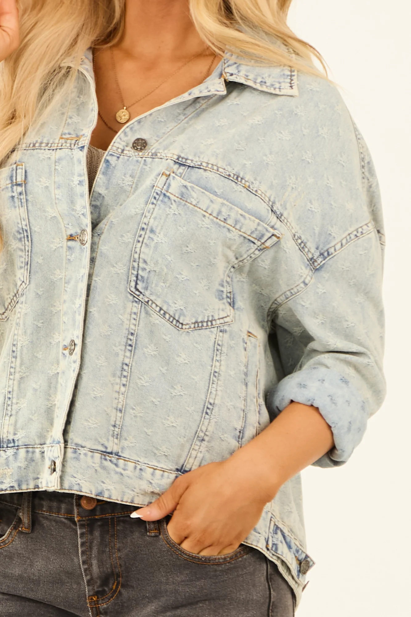 Embrace casual style with our Distressed Denim Button Up Jacket. Crafted from a blend of 85% Cotton and 15% Polyester, this jacket features a button-up front, chest pockets, non-functional side pockets, and buttoned cuffs. With a high-low hemline, drop shoulder design, and back seam detail, this jacket adds a trendy touch to your outfit. Whether you pair it with jeans or a dress, this versatile jacket is a must-have in your wardrobe. Available in sizes S, M, and L.