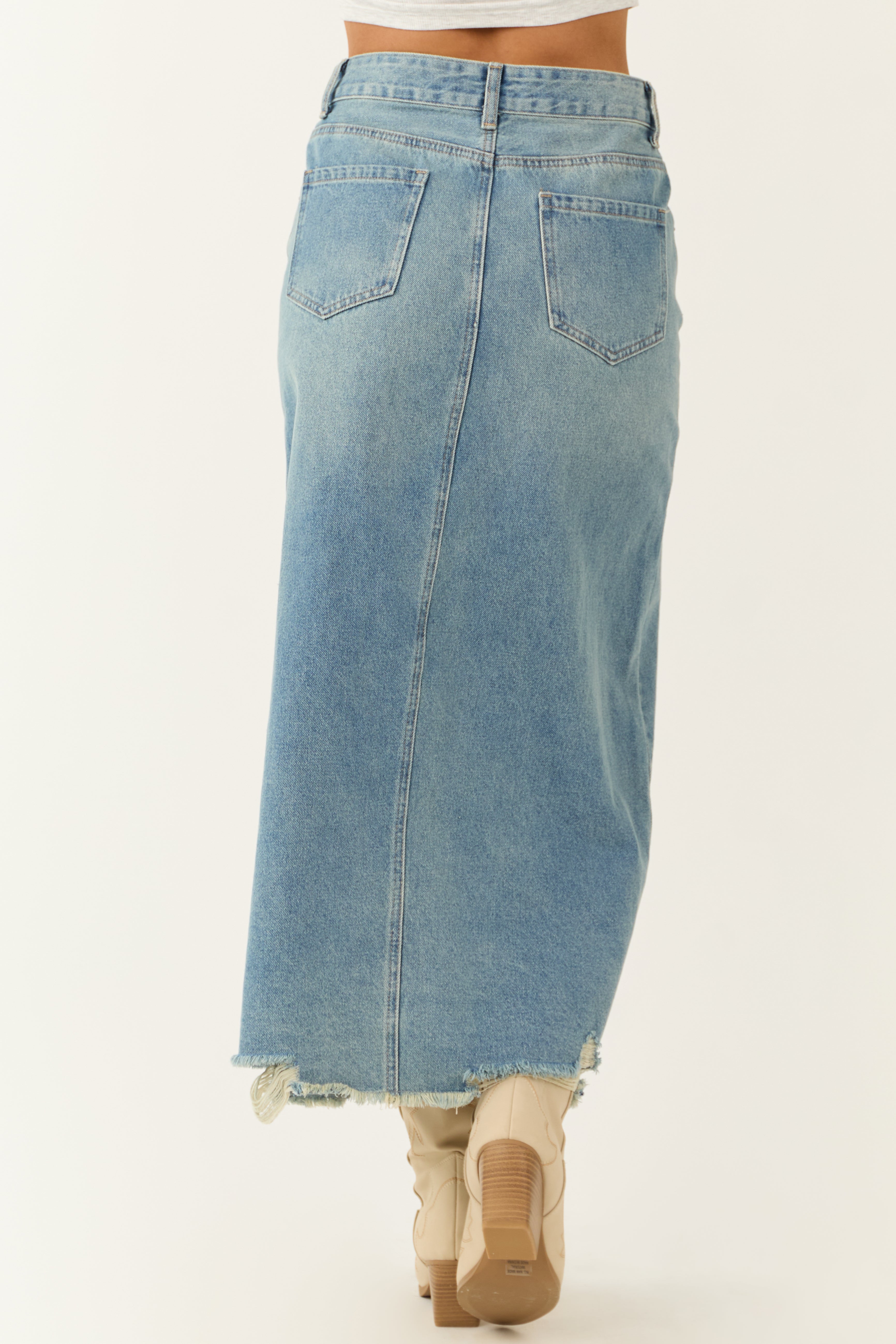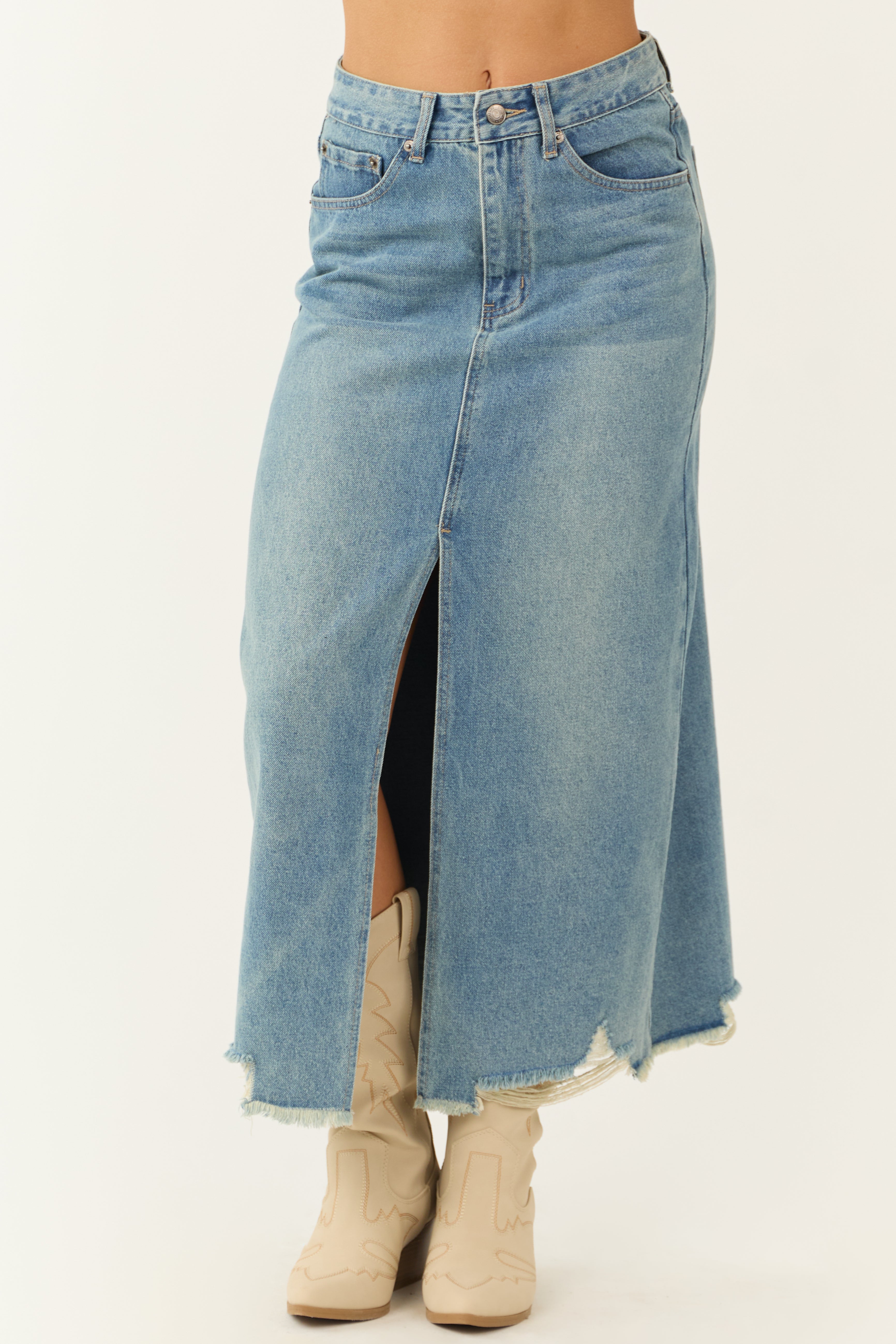 Experience trendy style with our Distressed Denim Maxi Skirt featuring a front slit for added flair. Made from non-stretchy denim with a zipper fly and button closure. This skirt boasts practical belt loops, 5 pockets, a frayed hem, and beige threading details. Crafted from 100% Cotton, this skirt is perfect for daytime wear. Care instructions: Hand wash cold, line dry. Model is 57″ tall, wearing a size Small (Bust: 34″, Waist: 26″).