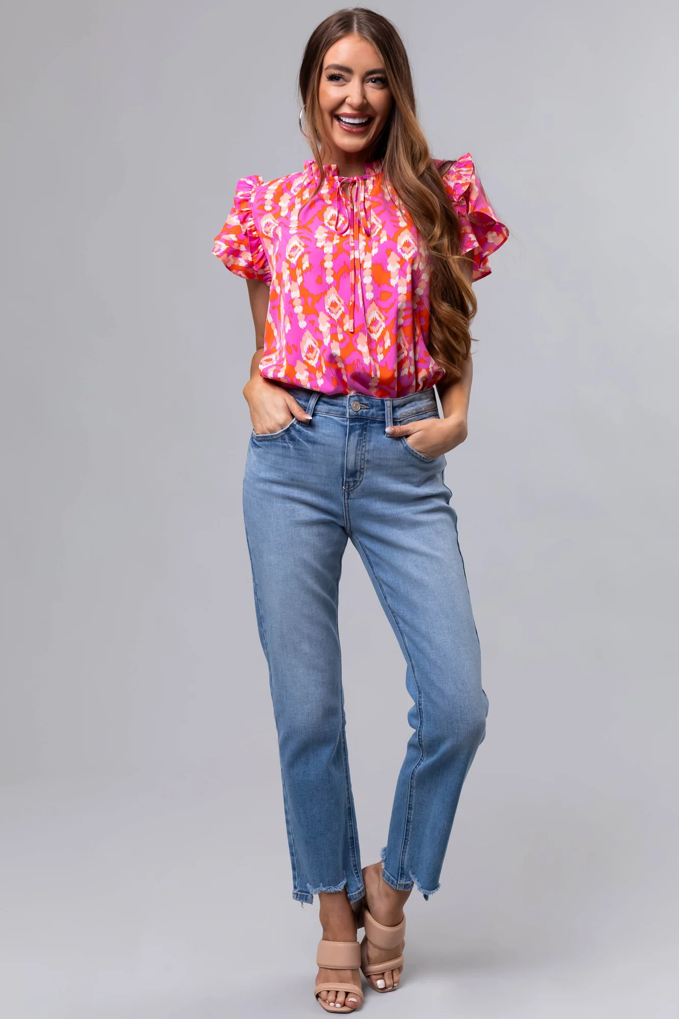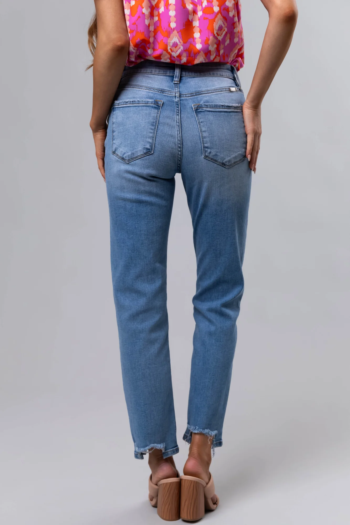 These Distressed High Rise Straight Leg Blue Denim Jeans are a must-have in any fashion-forward wardrobe. Made with 98% Cotton and 2% Spandex, these jeans offer a perfect fit for sizes 0 to 15. Featuring a 10″ front rise and a 12.5″ back rise, these jeans provide both style and comfort. The stretchy material allows for 1-3″ extra in the waist, while the distressed hem adds a trendy touch. Complete with five pockets, belt loops, and a zipper fly with button closure, these imported jeans ensure both functionality and style for any occasion. Easy to care for, machine wash cold inside out with like colors, tumble dry low, and low iron if needed. Model is wearing a size 1, with a size 2 profile, height 58″, bust 32″, and waist 25″.