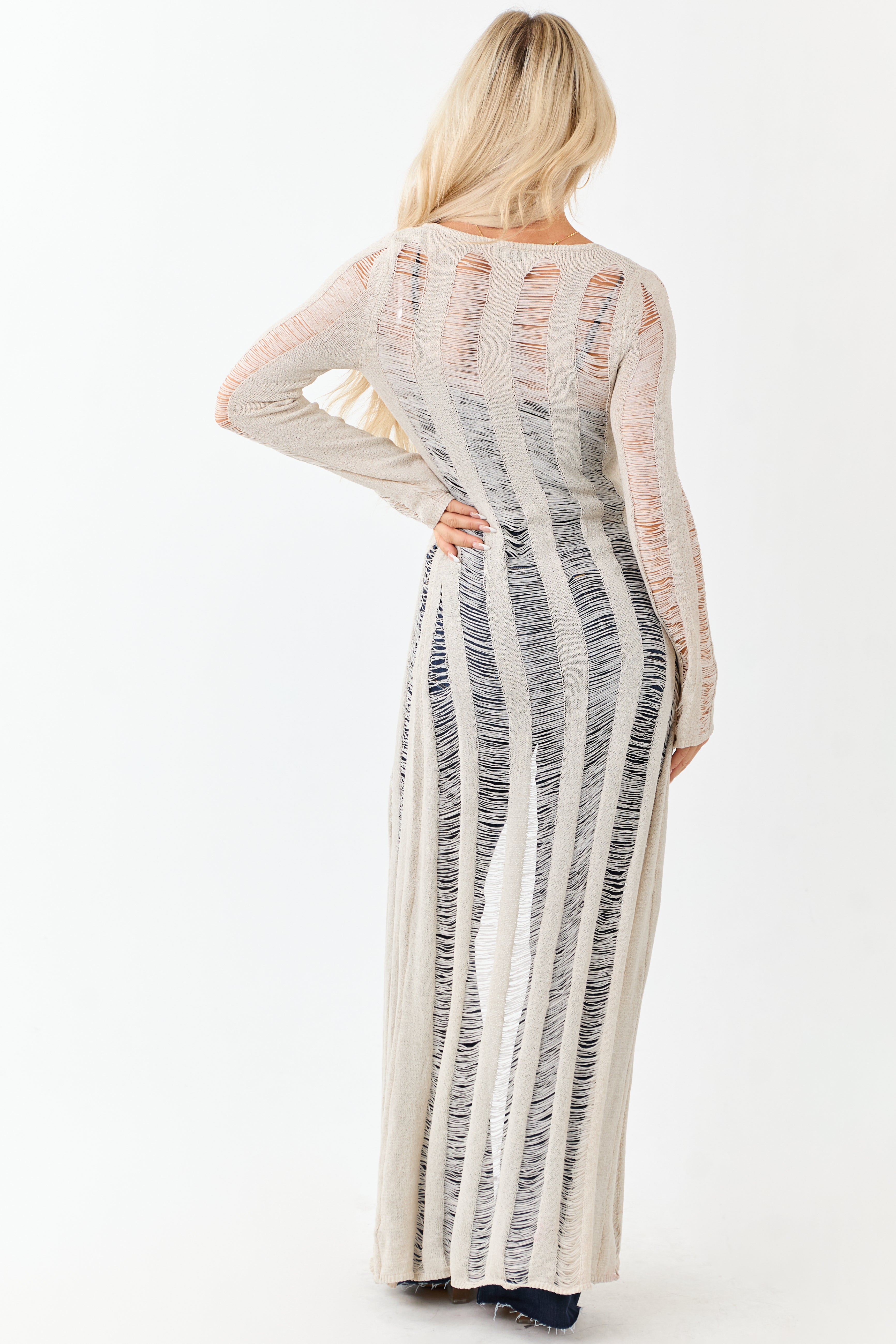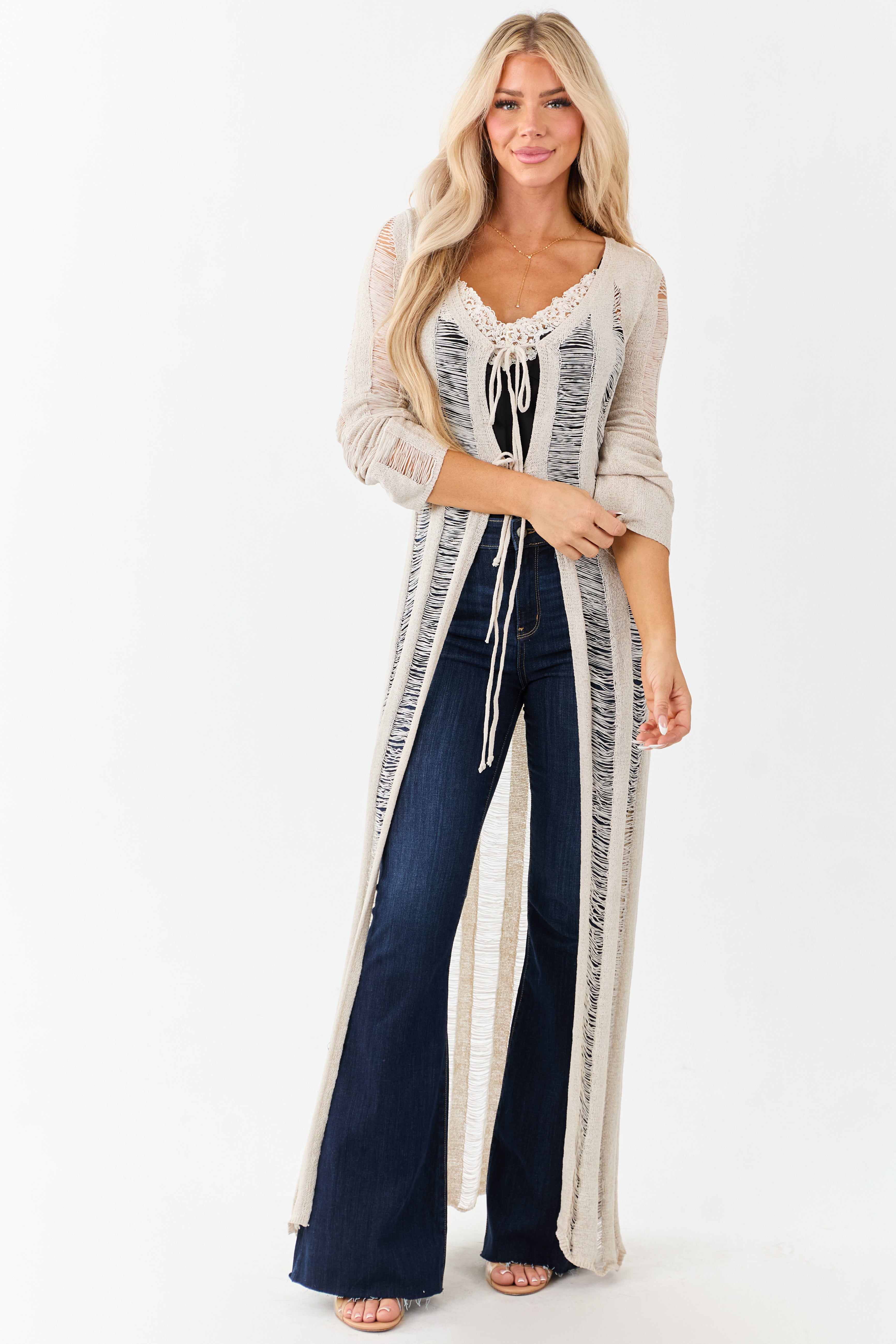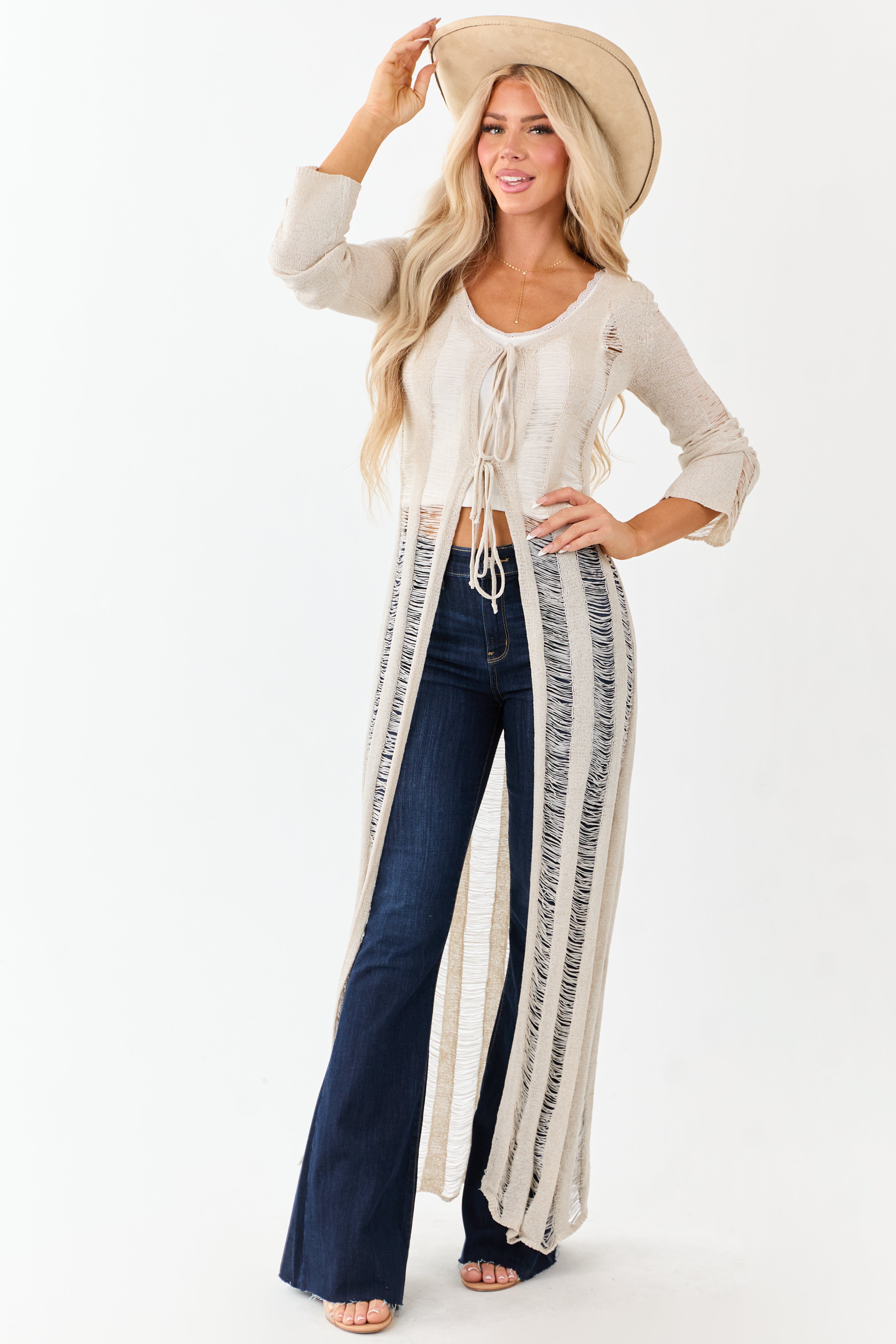 Embrace effortless boho vibes with this duster cardigan featuring intricate ladder-stitch details, a tie-front design, and a touch of distressed edge for added style and comfort. Made of a stretchy open knit blend, it includes two adjustable front ties. Perfect for layering, this cardigan is a versatile addition to your wardrobe. Available in sizes XS to L.